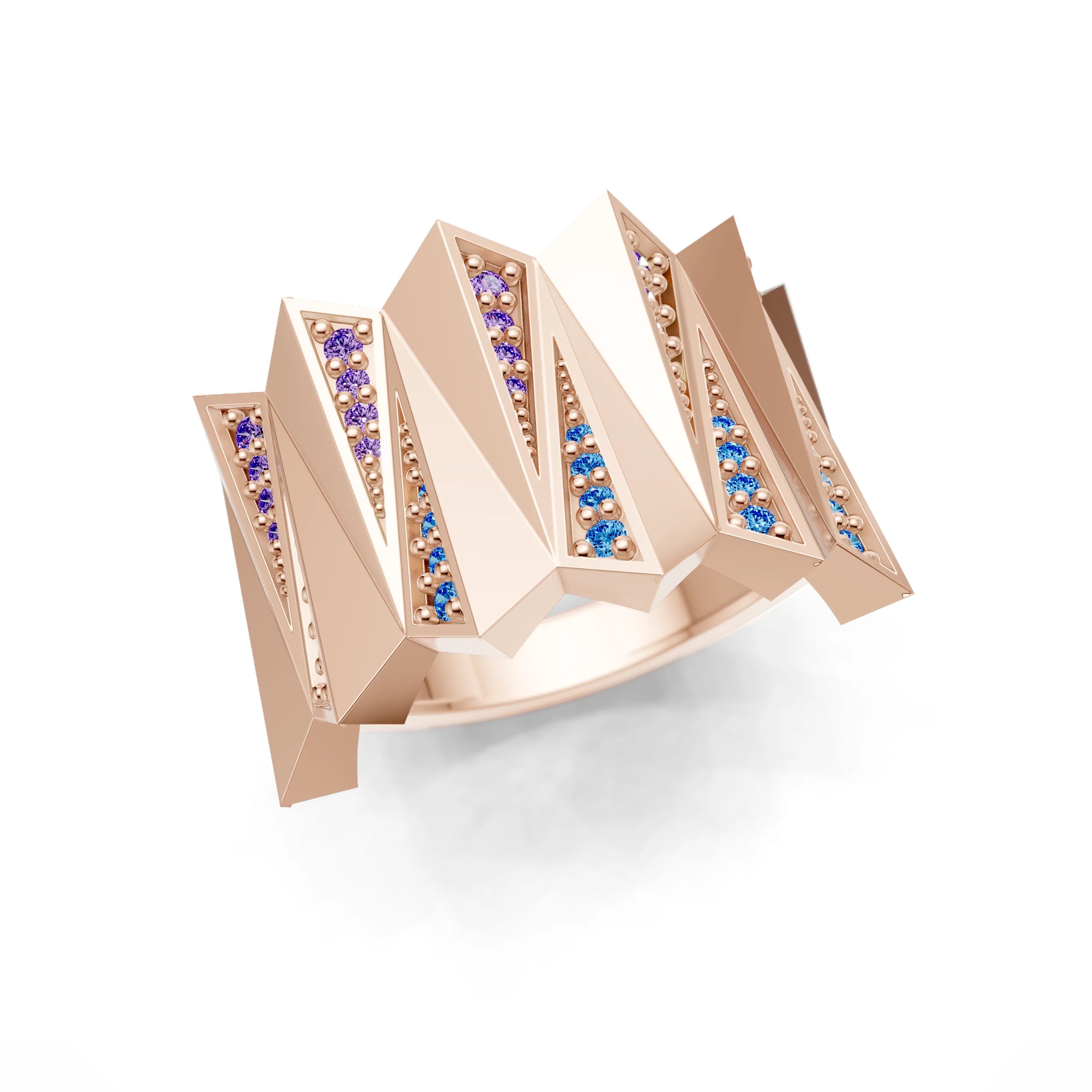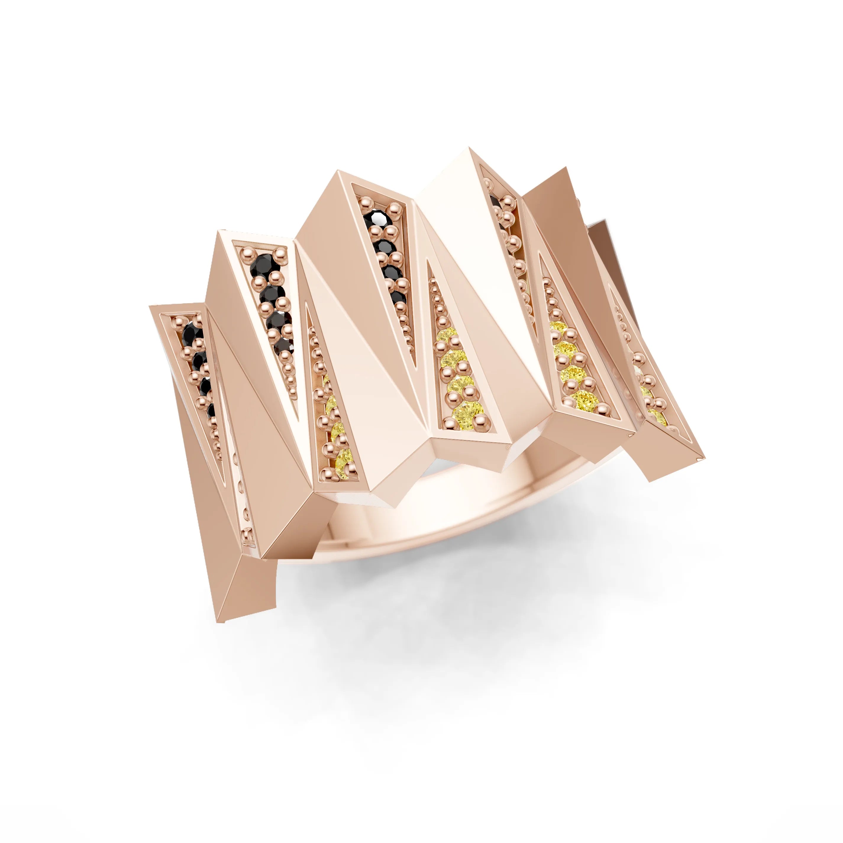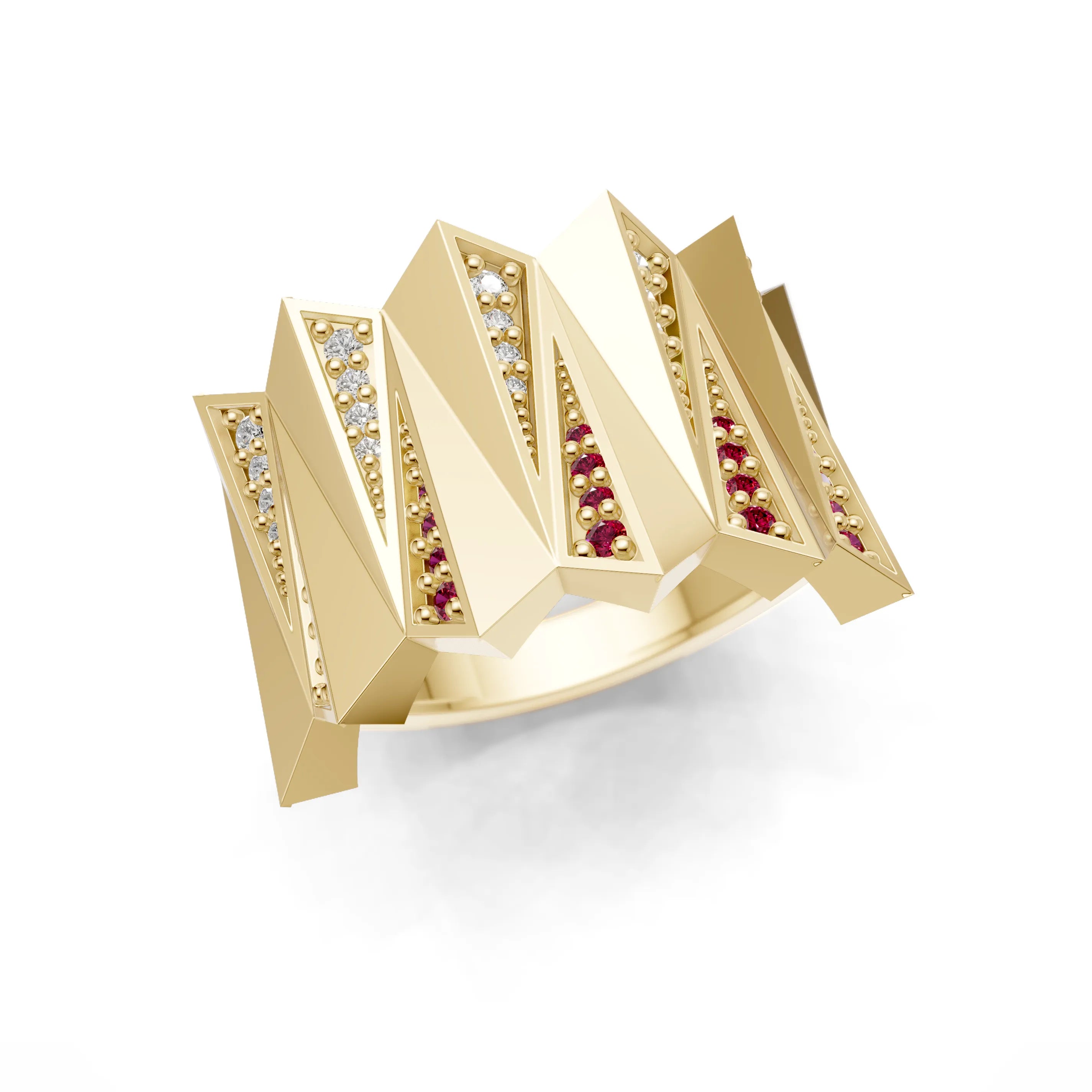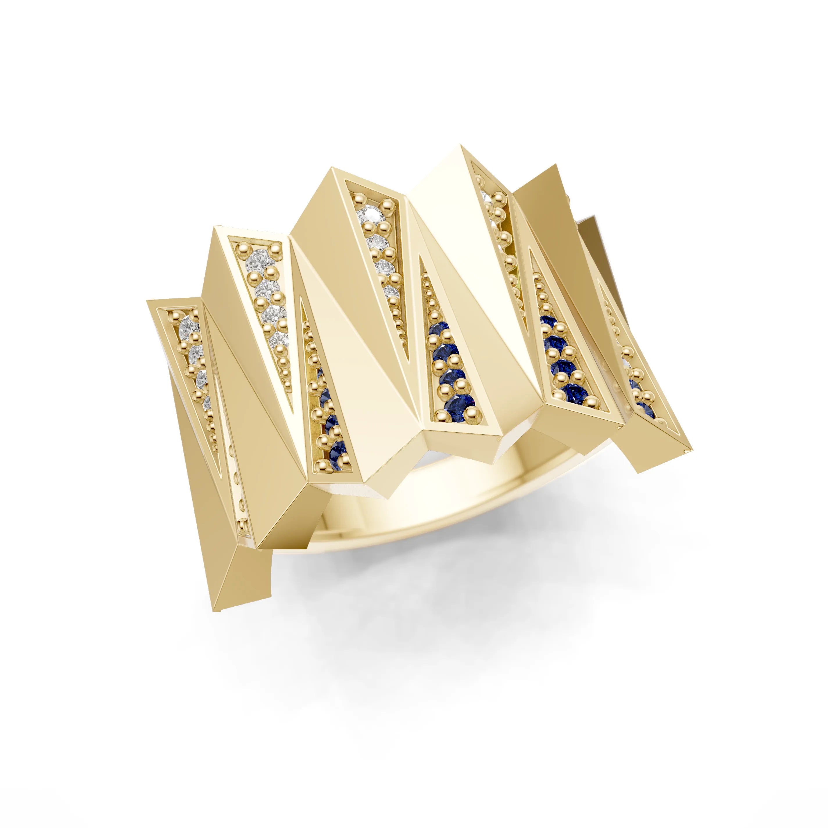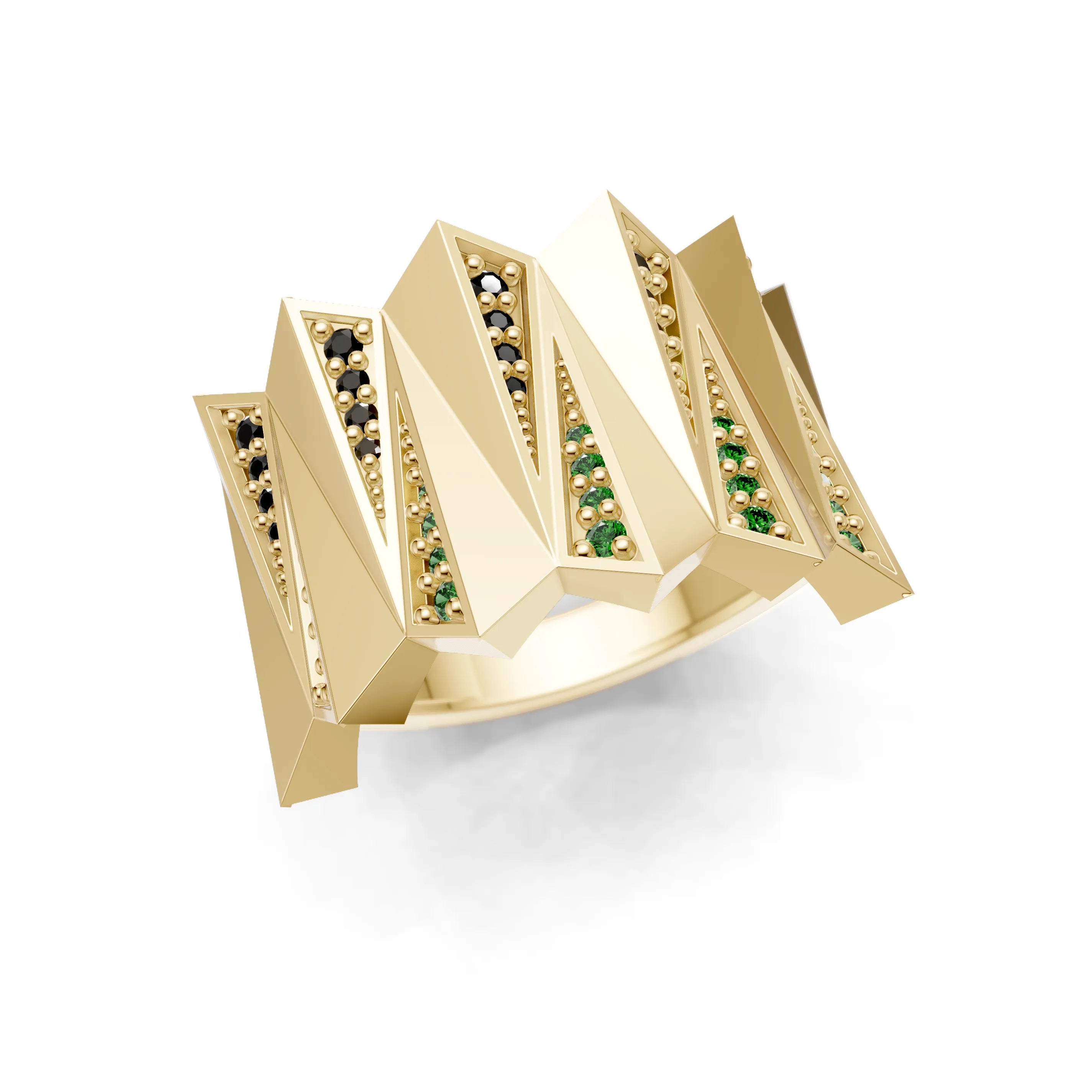 The "Art Deco Fan Gem Band" is an elegant homage to the geometric beauty and opulence of the Art Deco era. This statement ring features angular fan-like structures, each segment filled with a cascade of gemstones that add a touch of sparkle and contrast beautifully with the polished golden band.