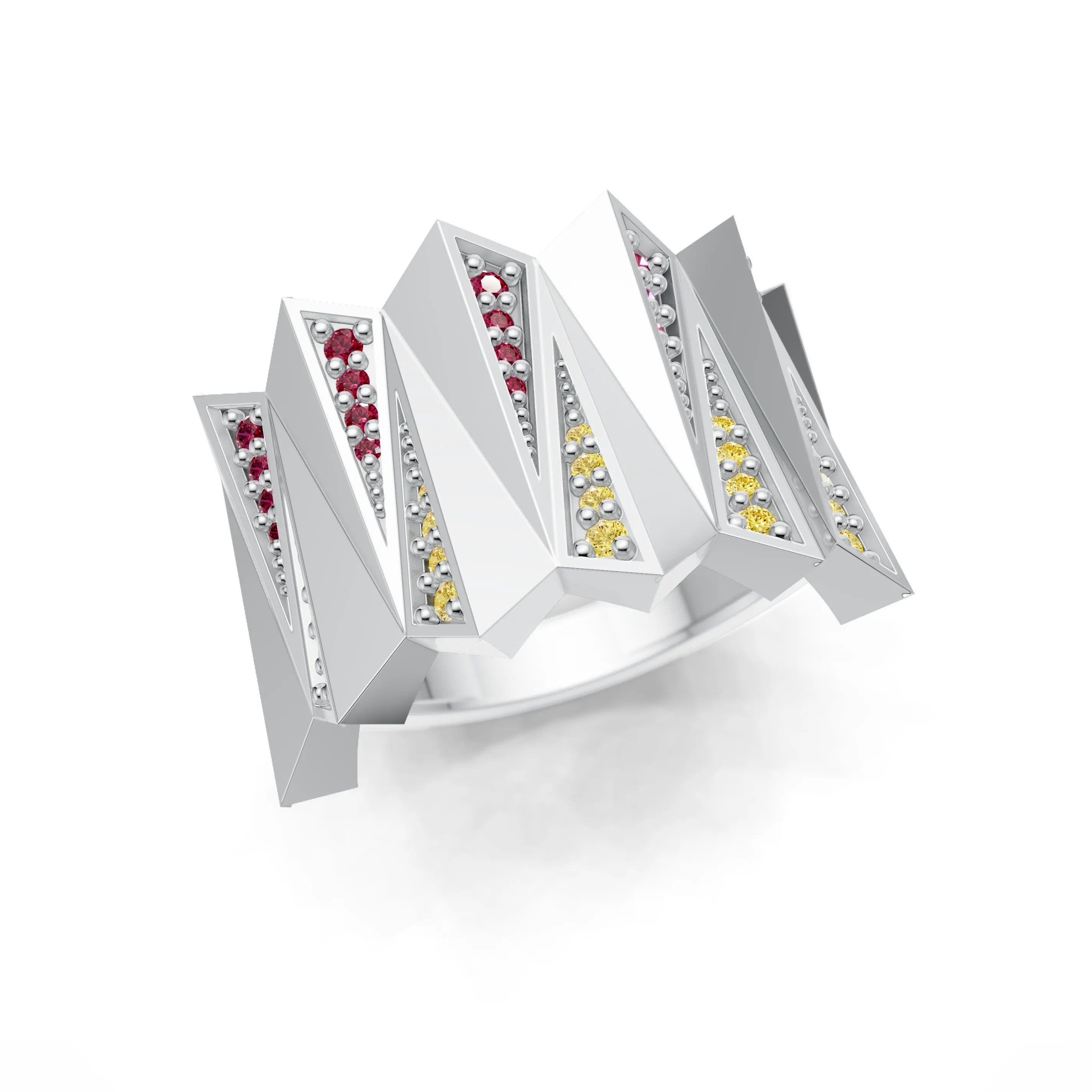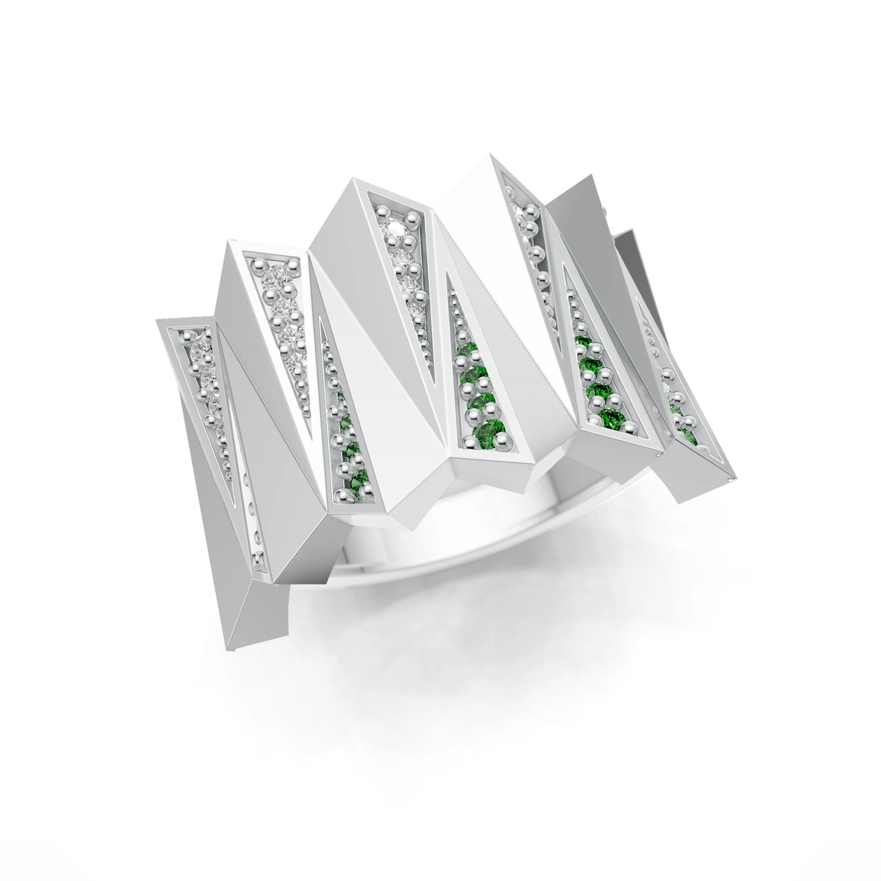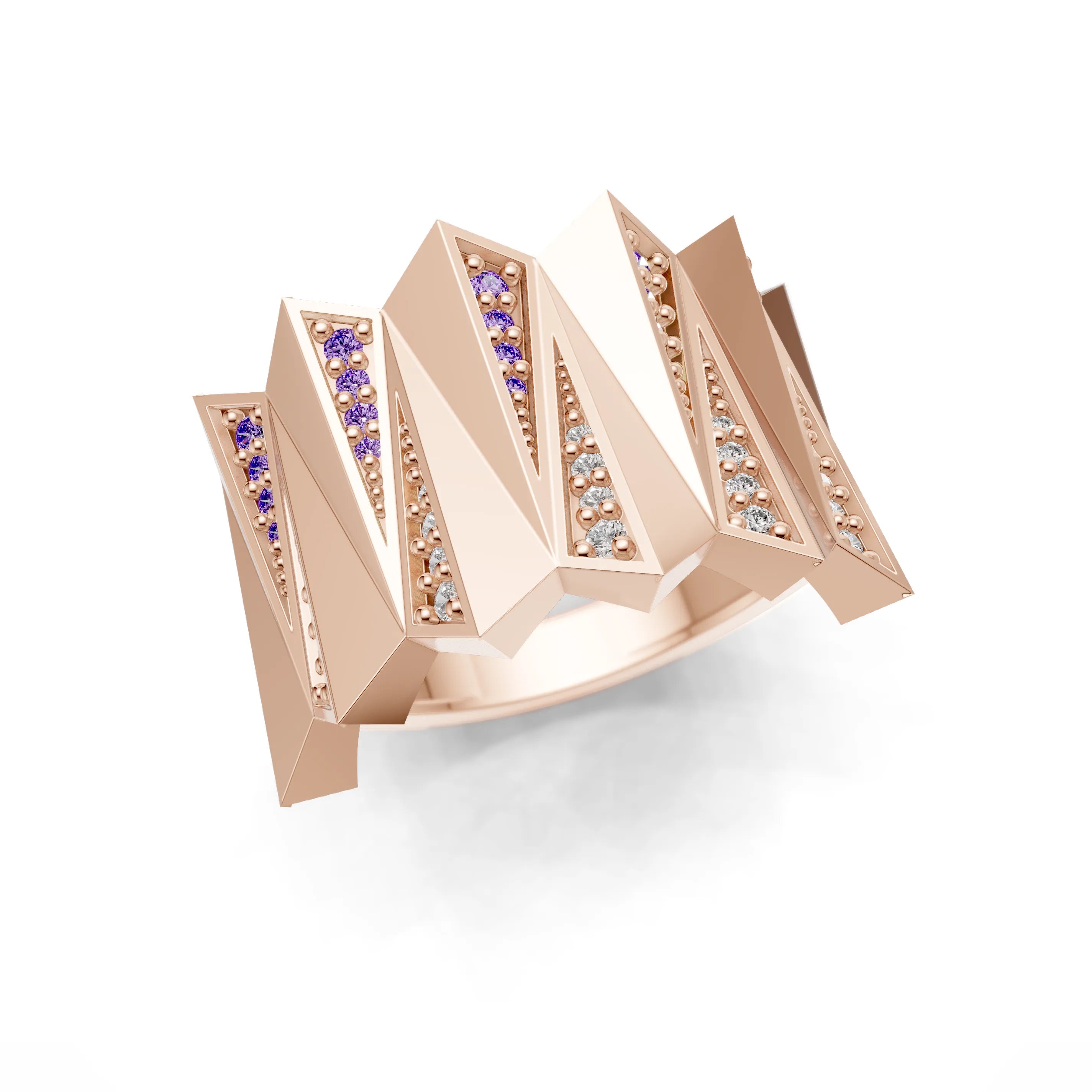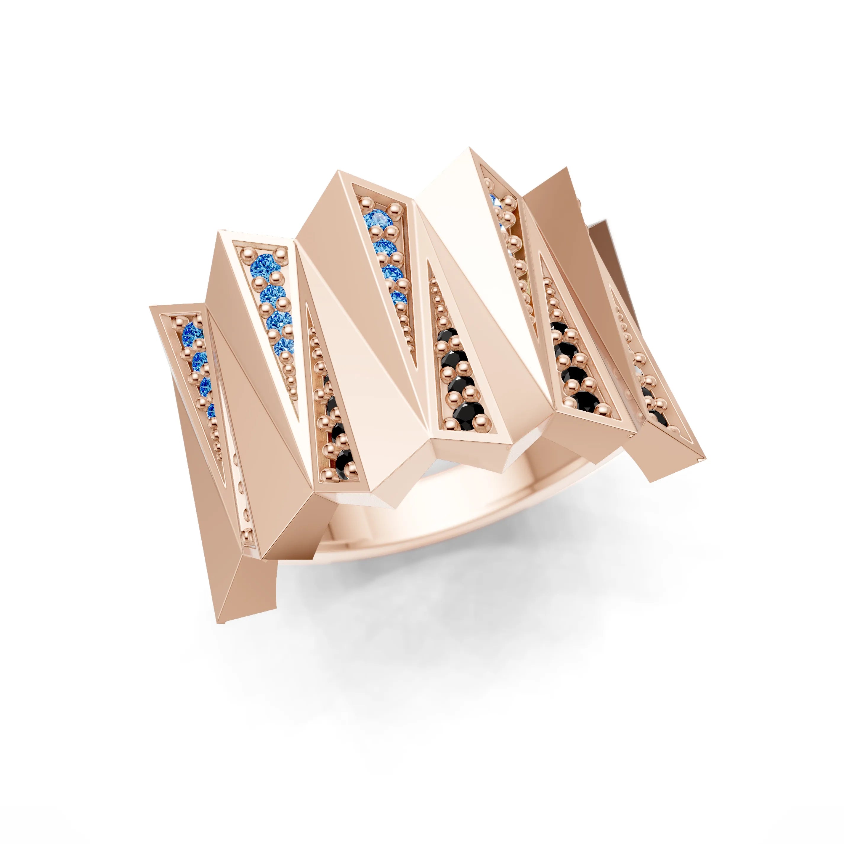 The "Art Deco Fan Gem Band" is an elegant homage to the geometric beauty and opulence of the Art Deco era. This statement ring features angular fan-like structures, each segment filled with a cascade of gemstones that add a touch of sparkle and contrast beautifully with the polished golden band.