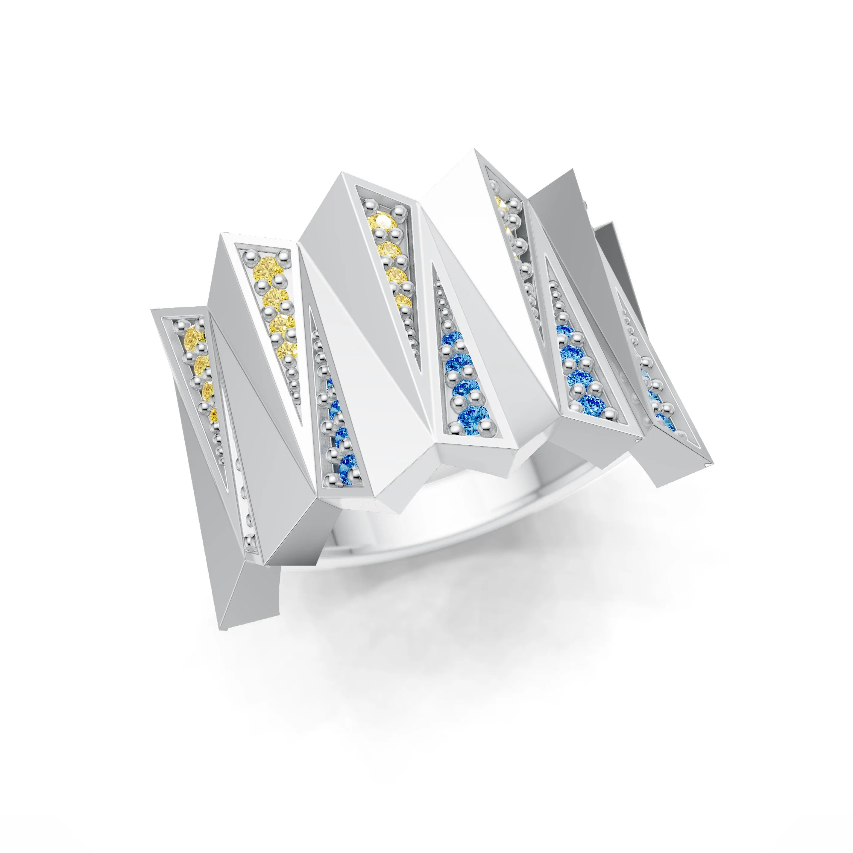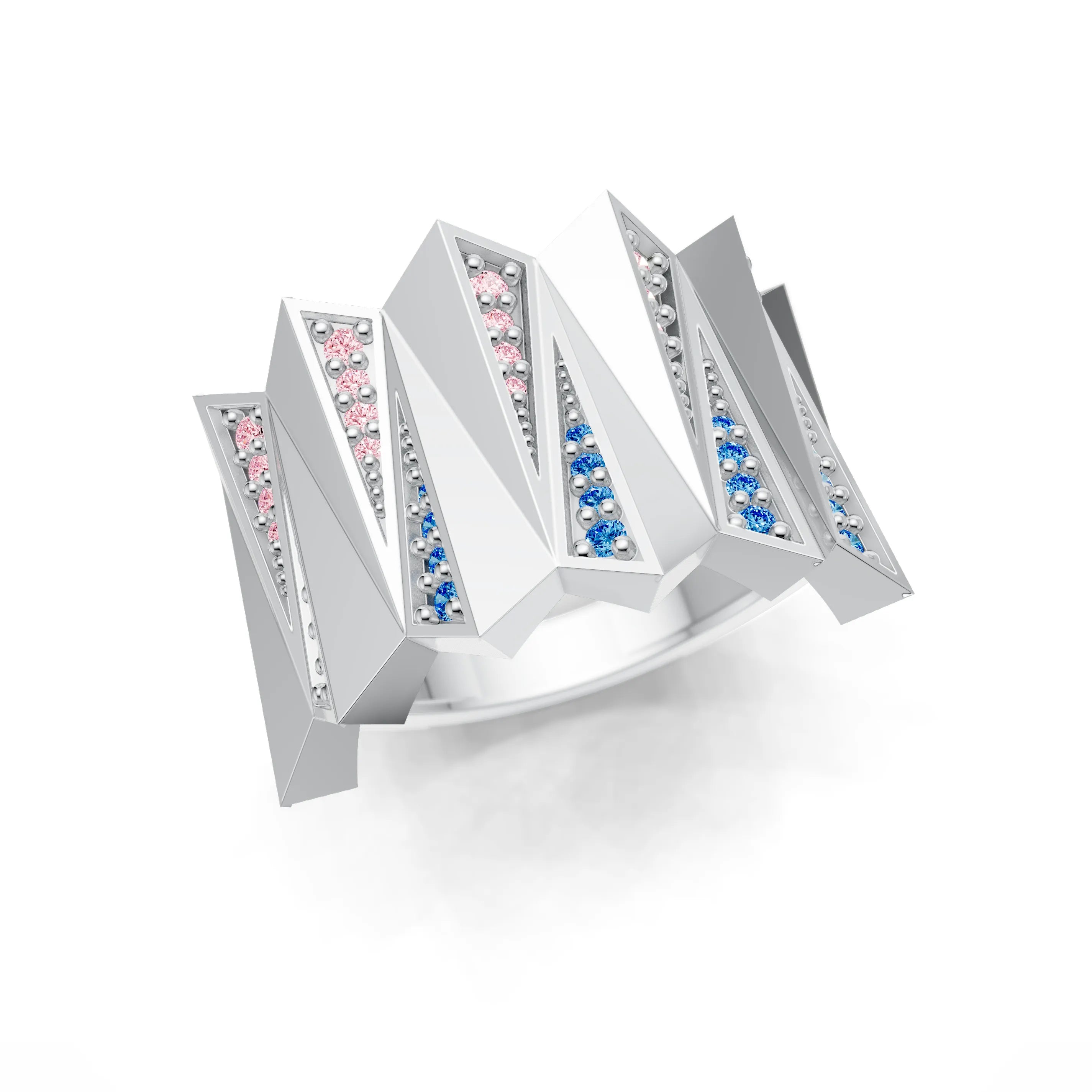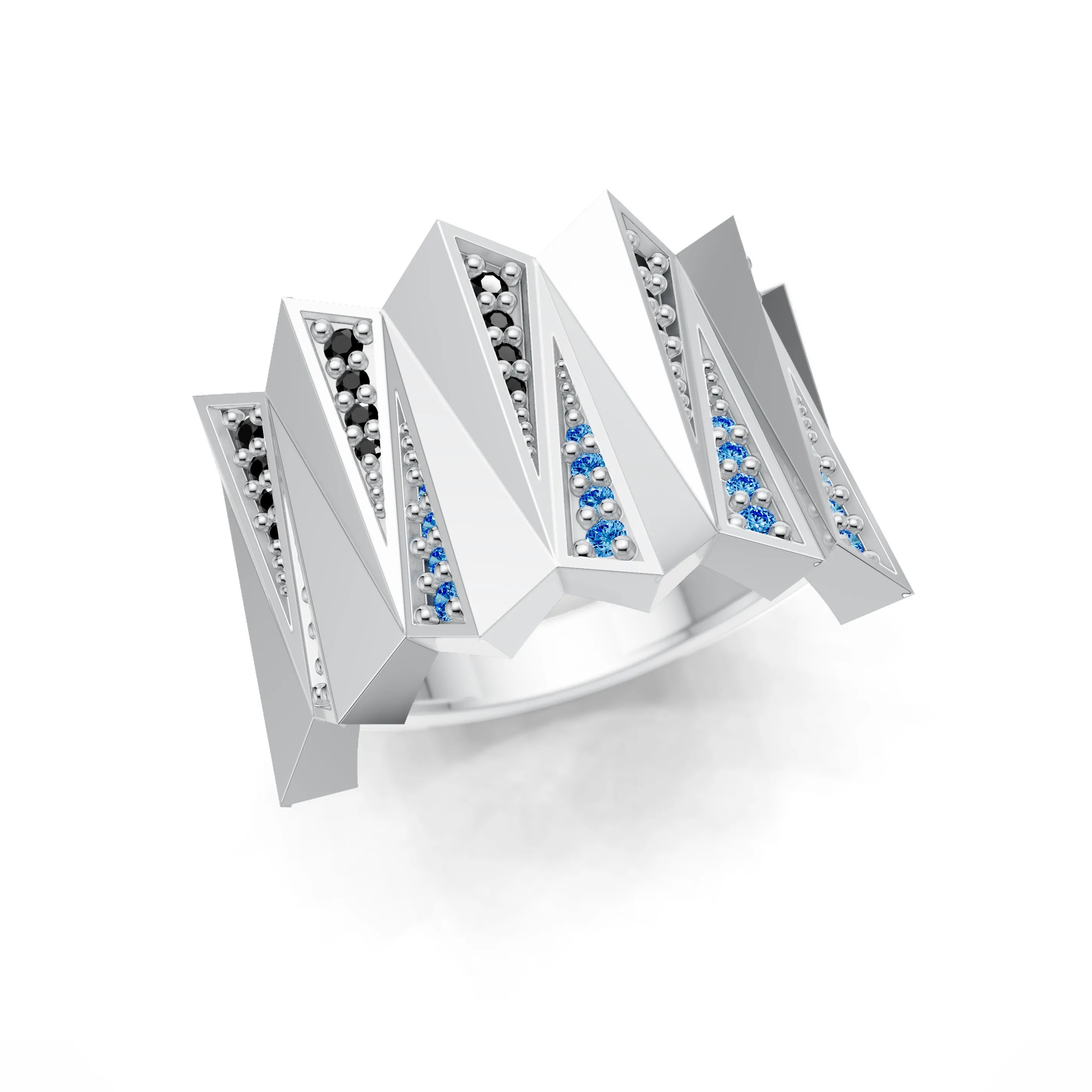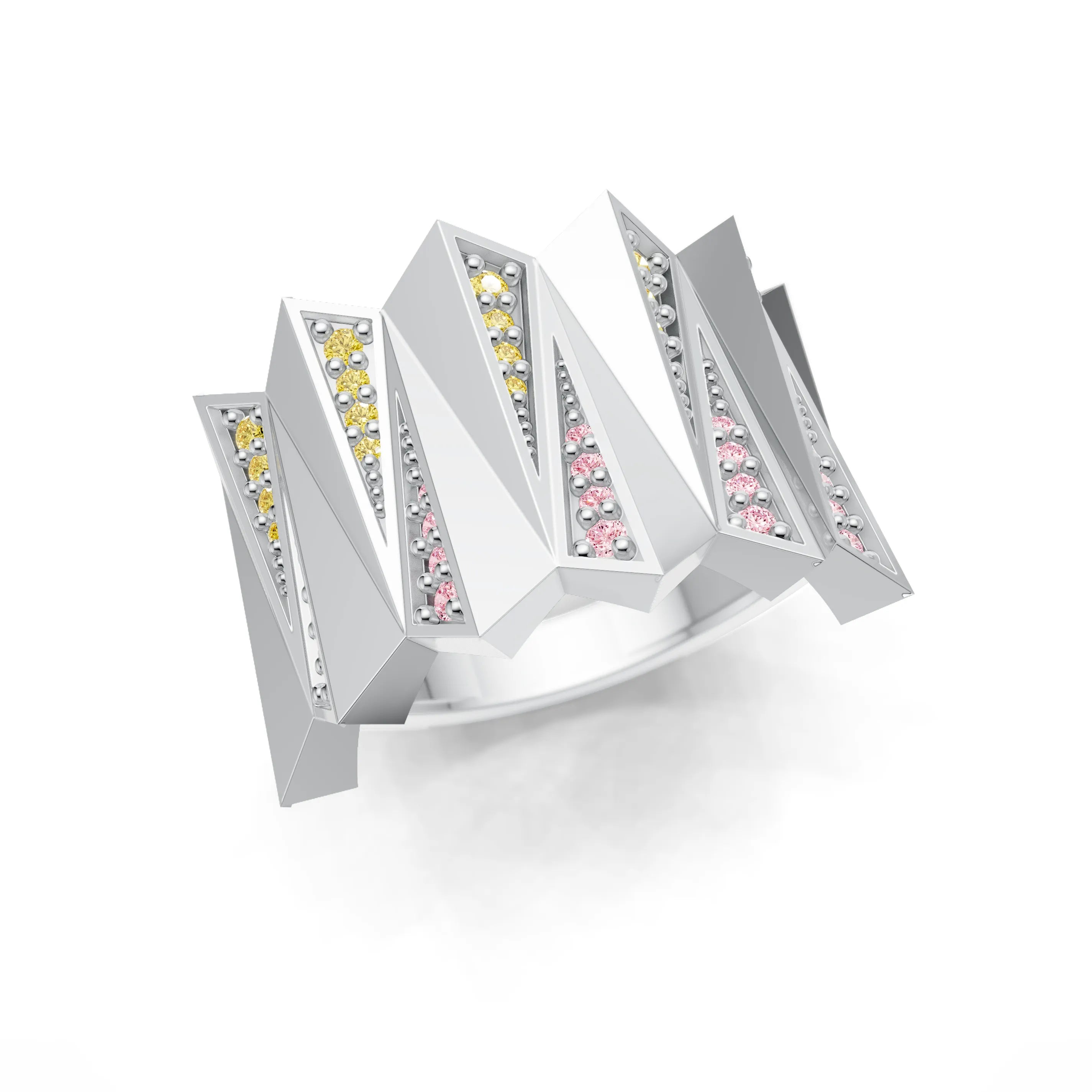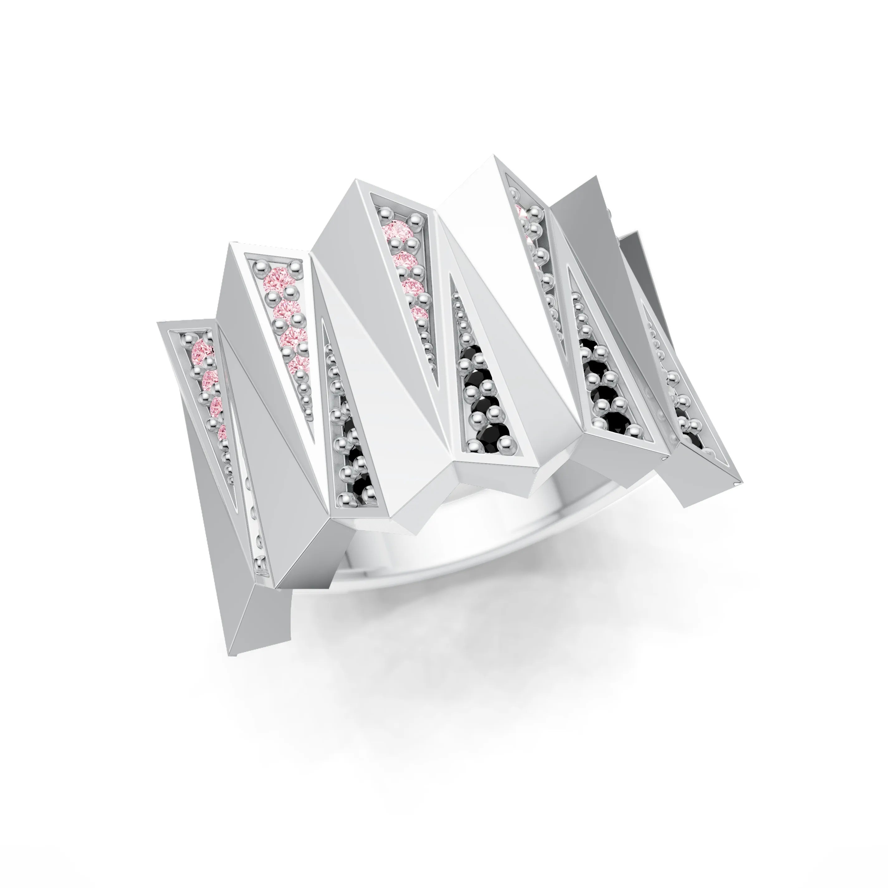 The "Art Deco Fan Gem Band" is an elegant homage to the geometric beauty and opulence of the Art Deco era. This statement ring features angular fan-like structures, each segment filled with a cascade of gemstones that add a touch of sparkle and contrast beautifully with the polished golden band.