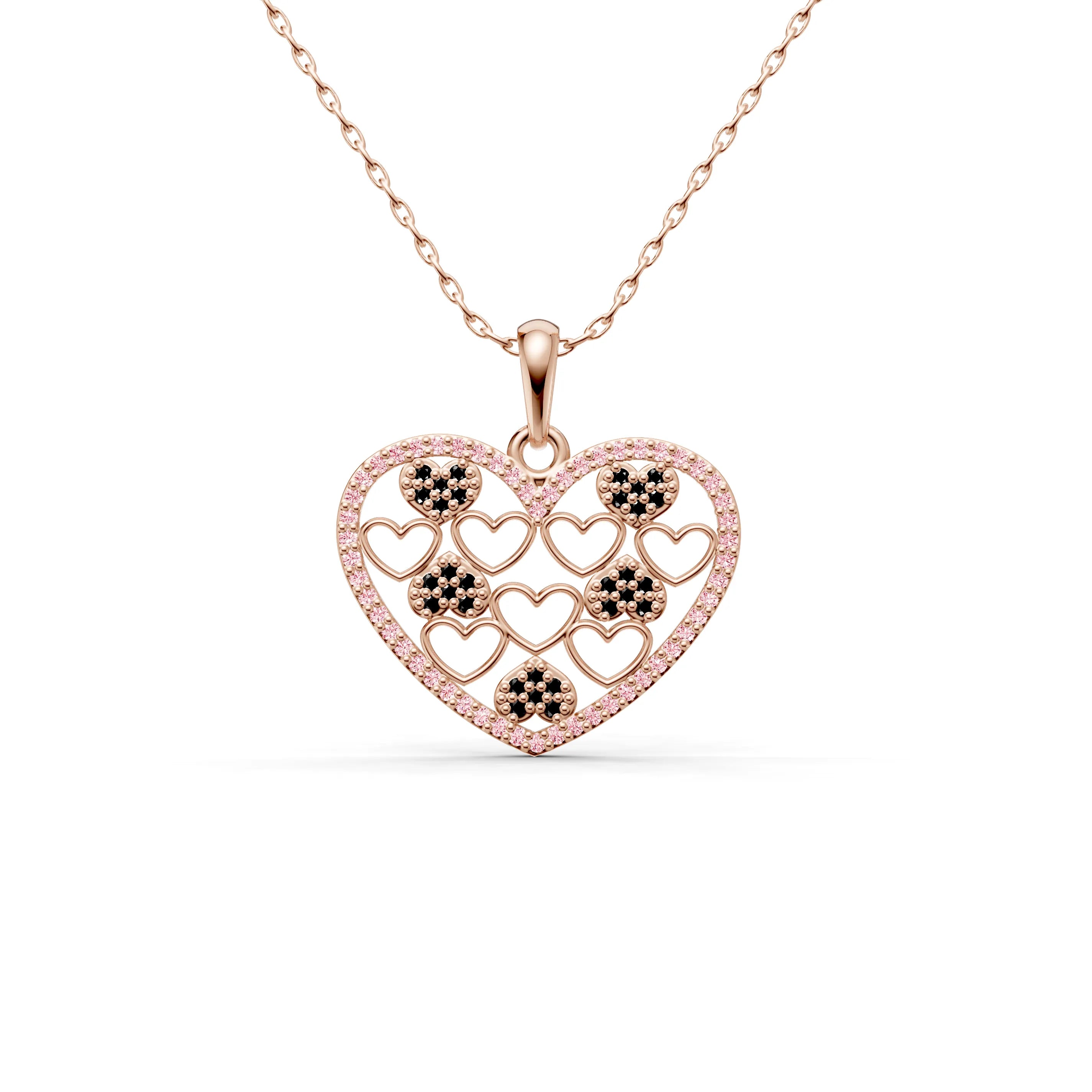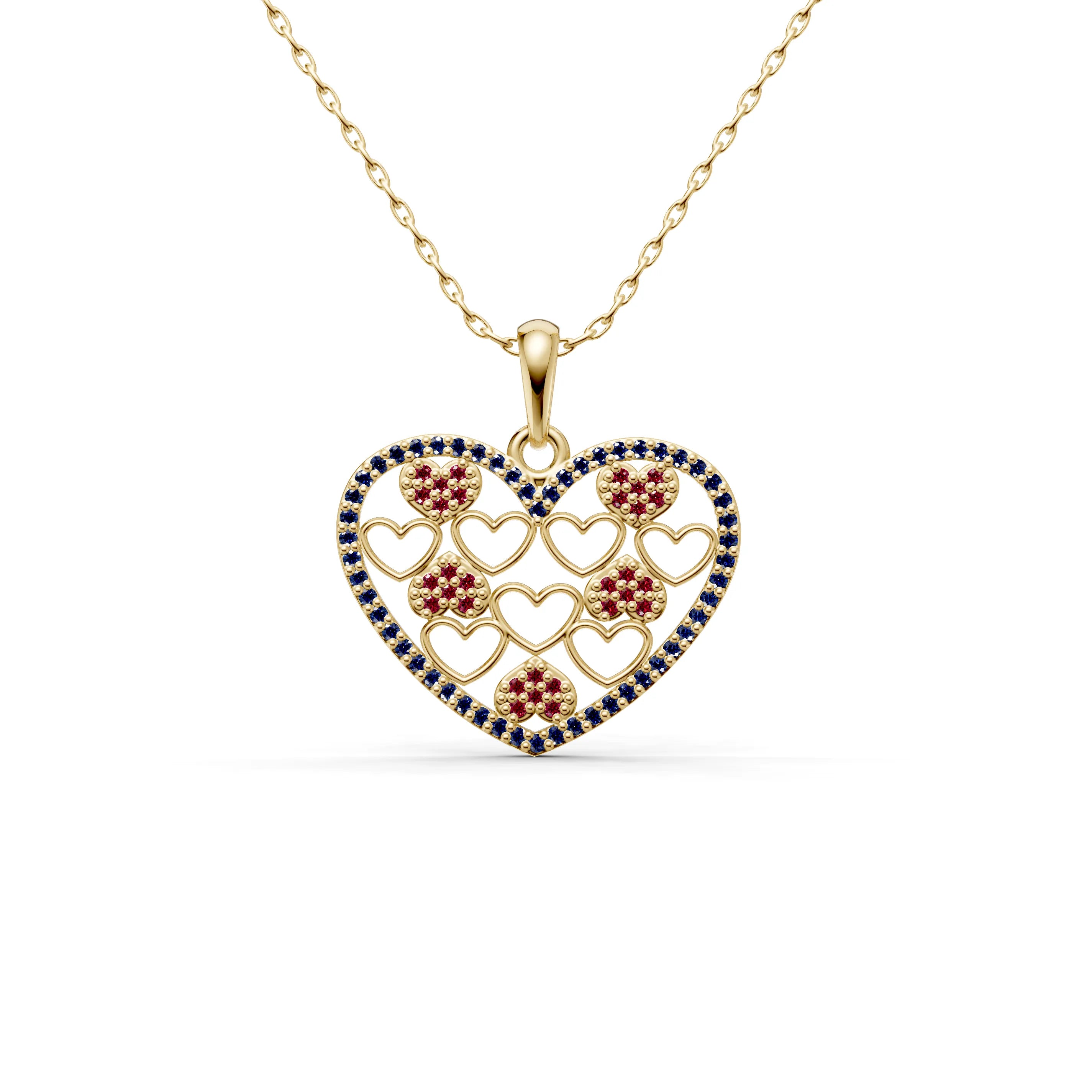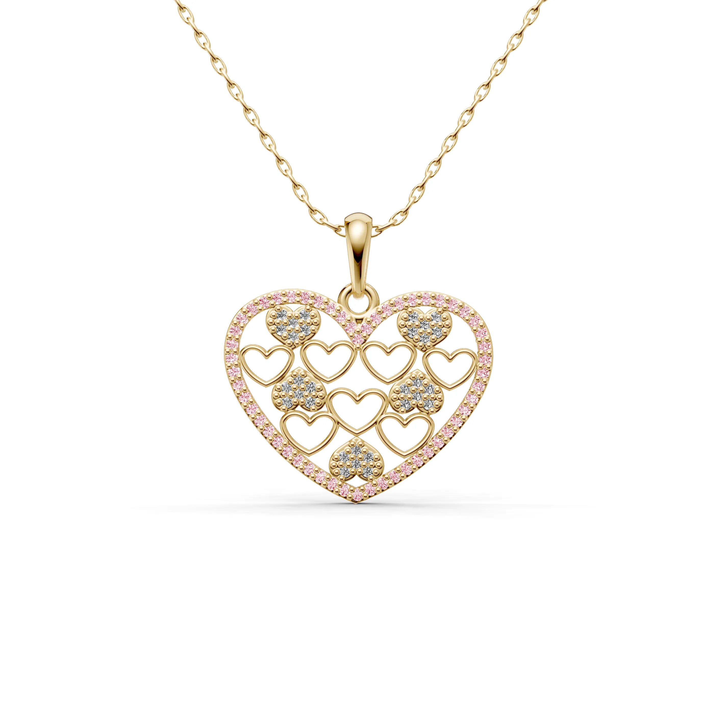 Each smaller heart within the pendant is plated in a rich golden hue, contrasting against the shimmering outline, which adds depth and dimension to the design. Whether it represents romantic love, the love of family, or the bonds of friendship, this necklace is a celebration of cherished relationships.