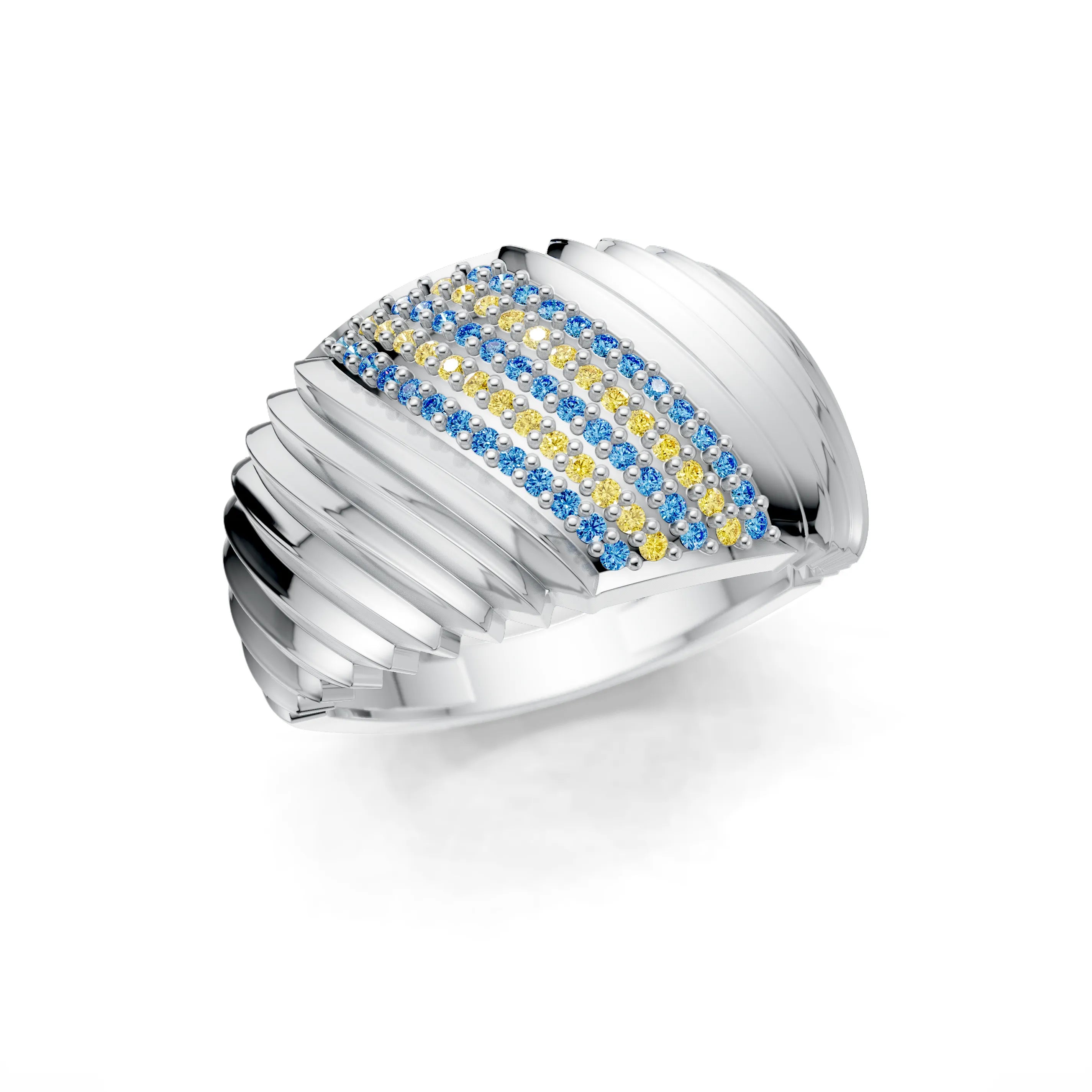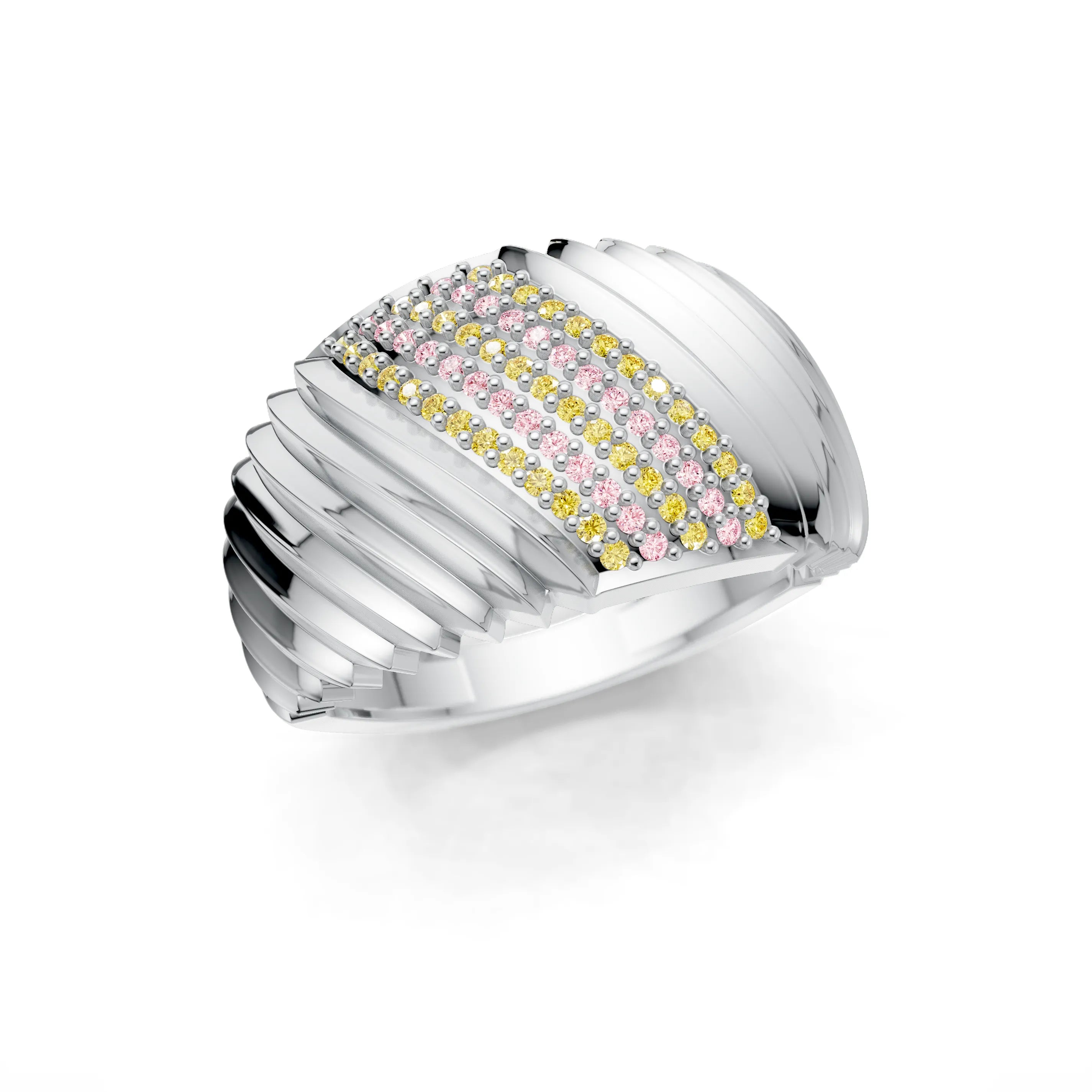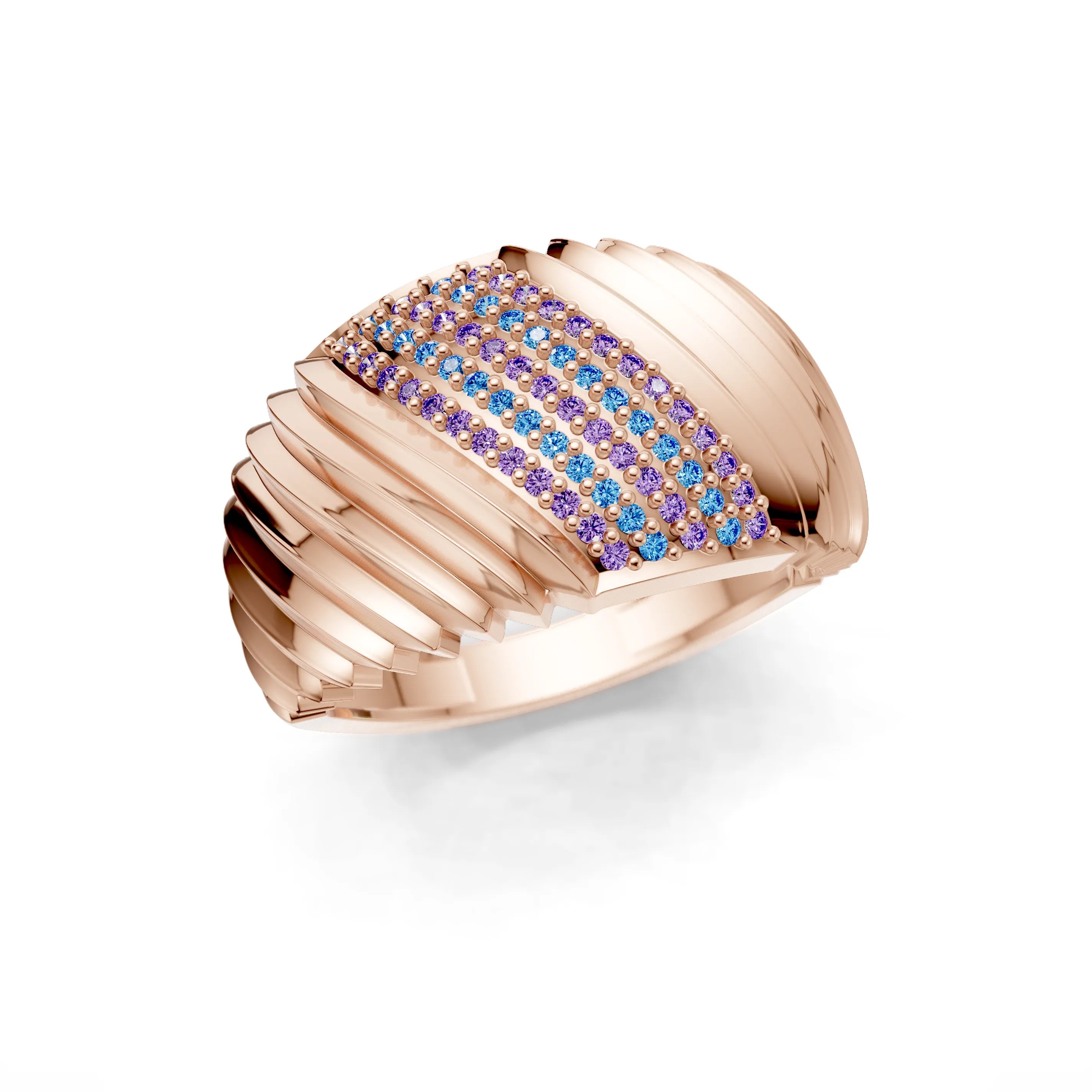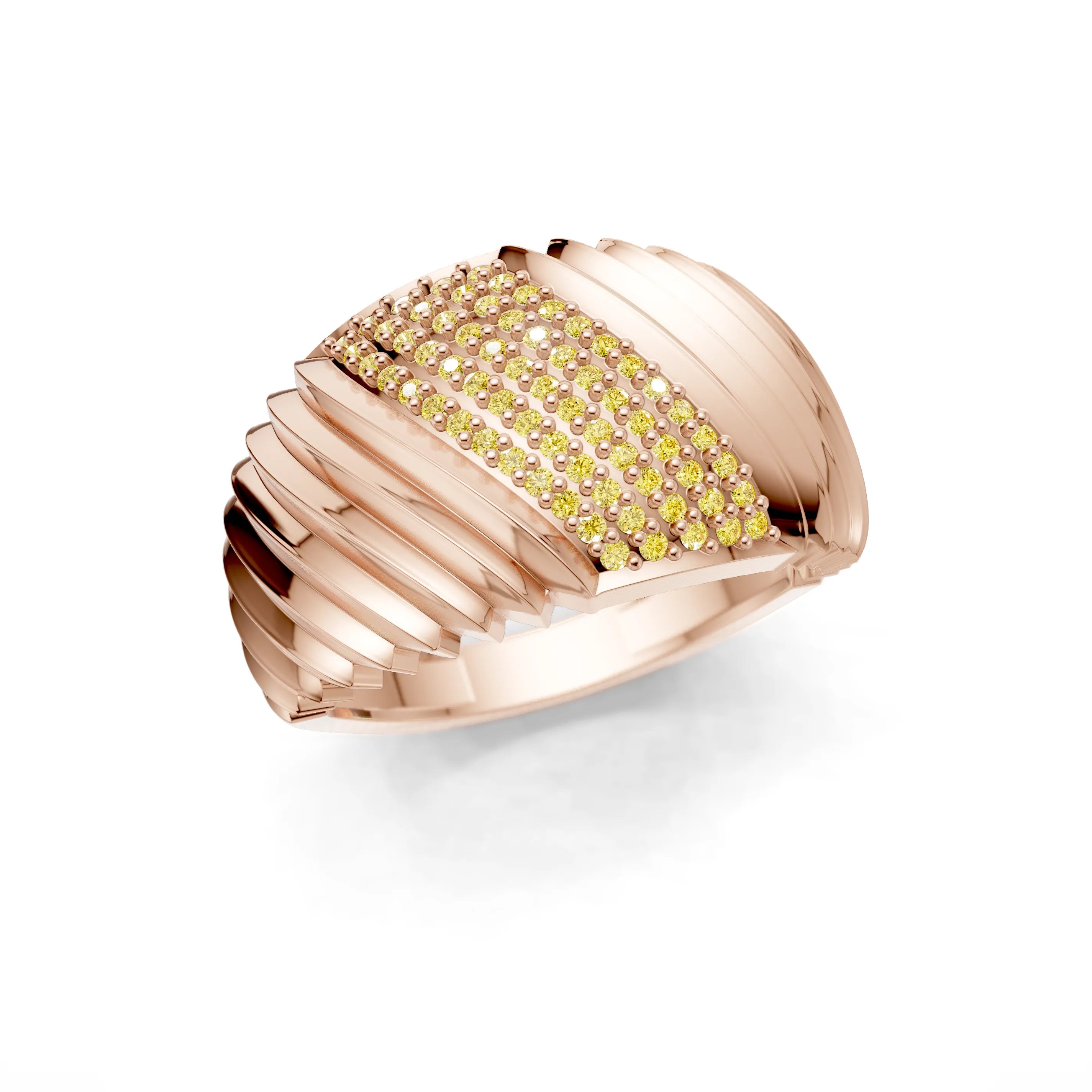 The "Golden Crescent Step Band" is a work of art in fine jewellery, showcasing a series of polished golden steps leading to a crescent of radiant pave-set gemstones. This designer ring brings to life the symmetry and balance of modern architecture, rendered in precious metal and sparkling accents.