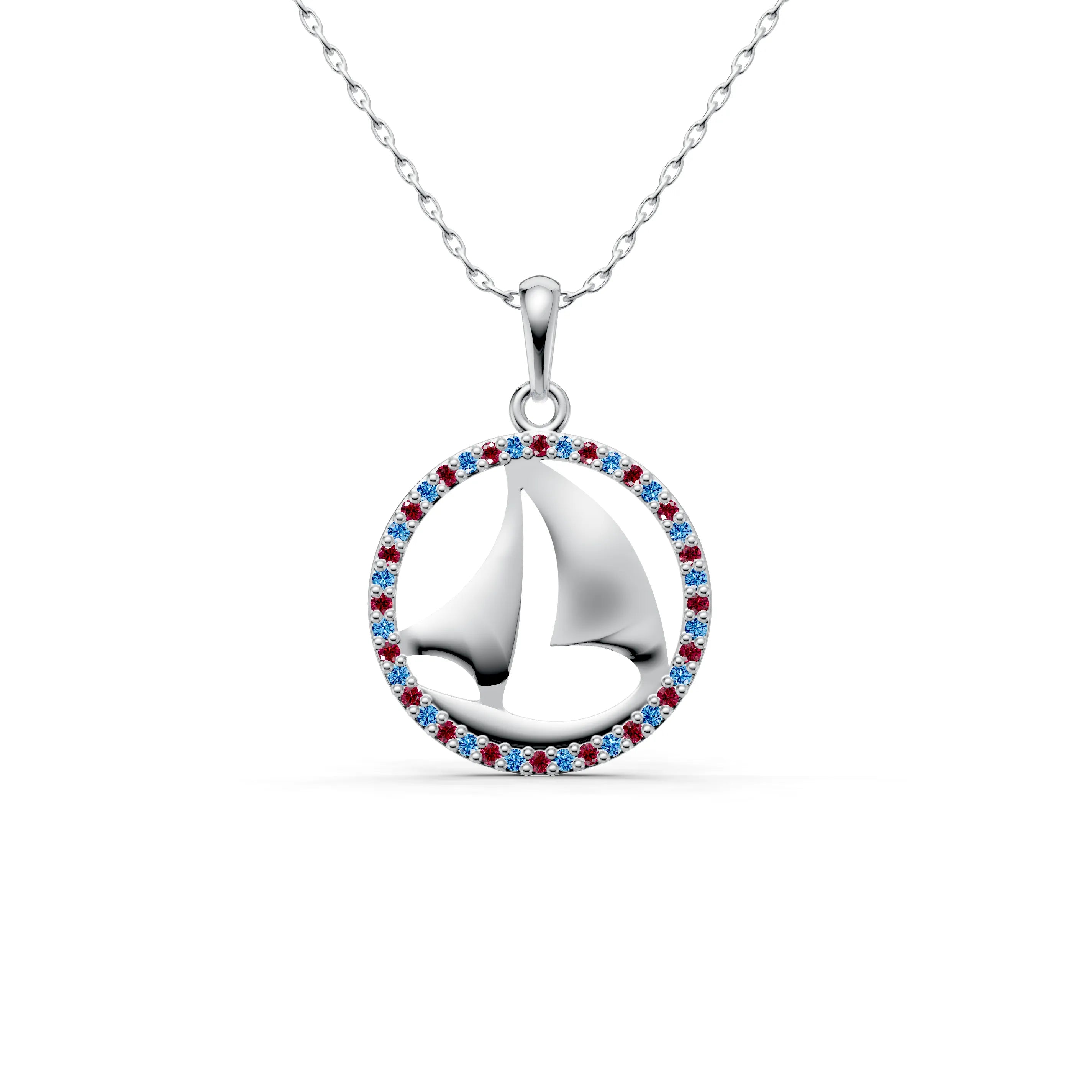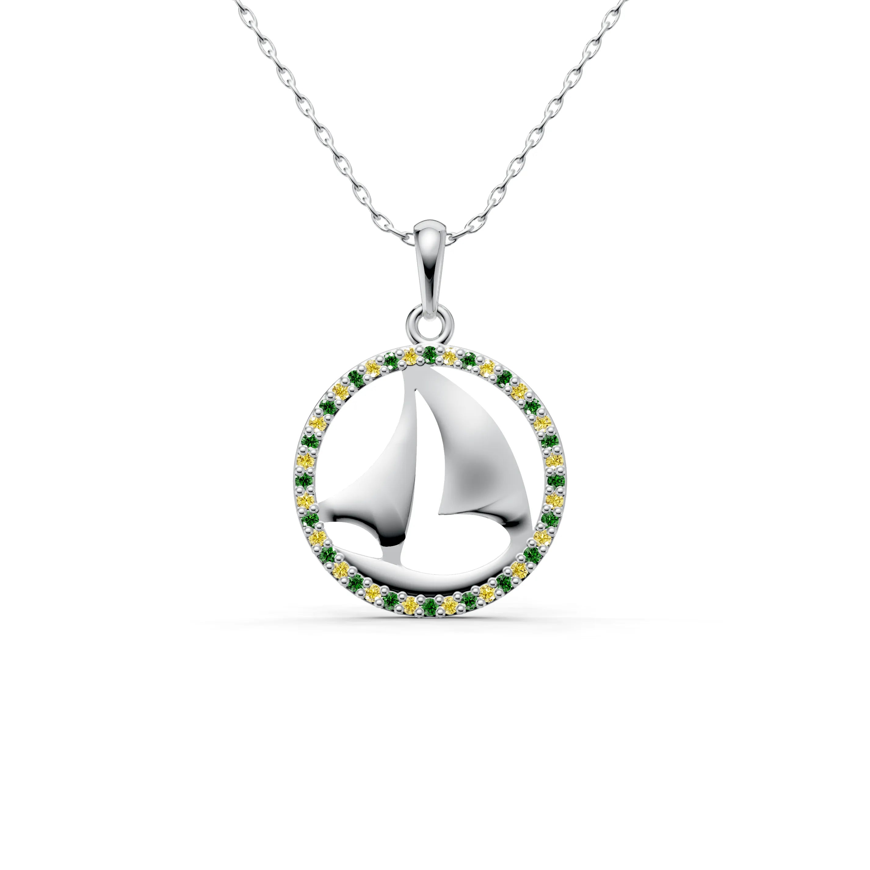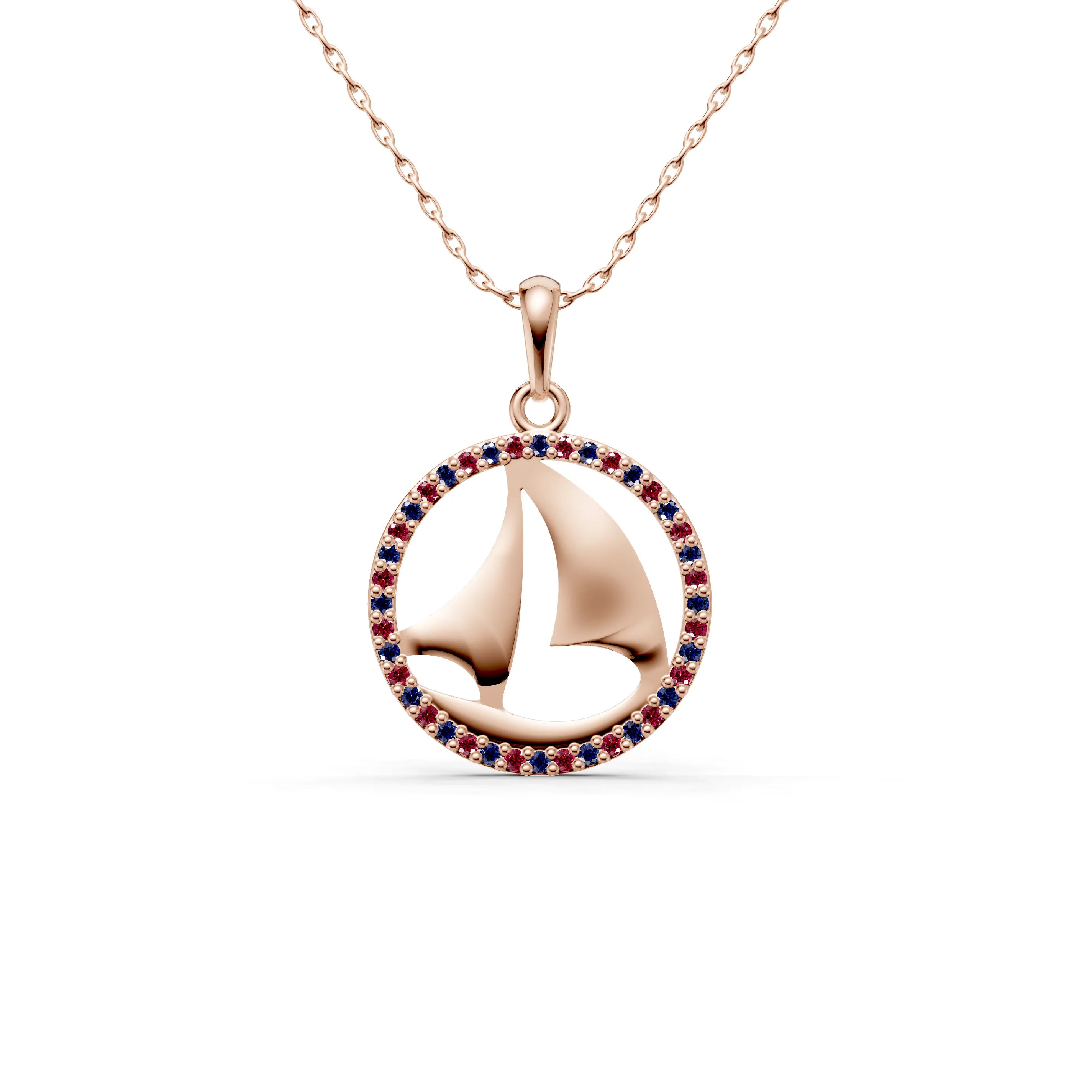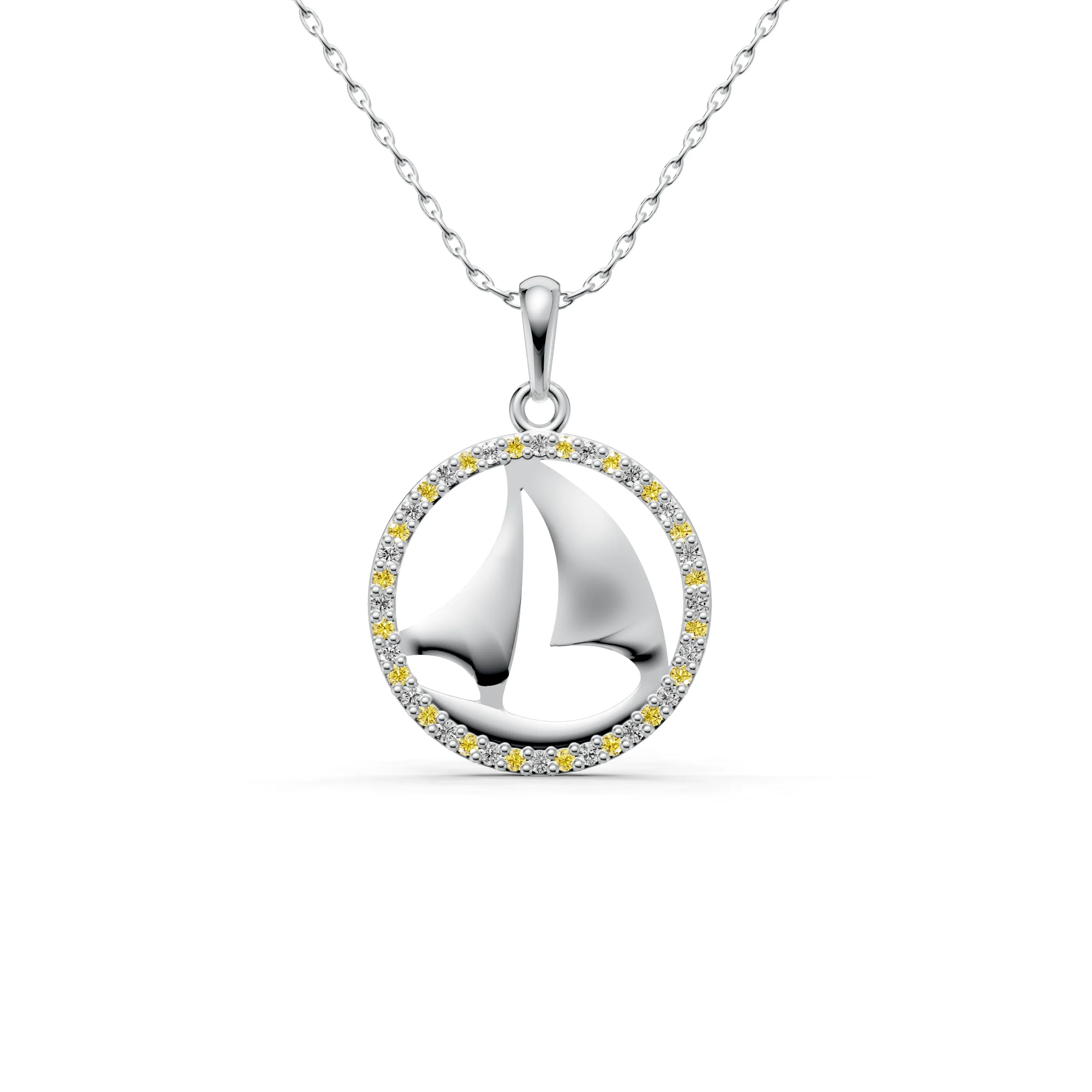 Set sail on a voyage of style with the "Golden Sails Circle Pendant," where nautical charm meets the pinnacle of fine jewelry. This captivating piece boasts a bold, circular design, framing an elegant trio of sails that appear to catch the breeze. Encrusted with a halo of sparkling stones, the pendant exudes a sense of adventure and freedom, making it an ideal accessory for the modern explorer at heart.