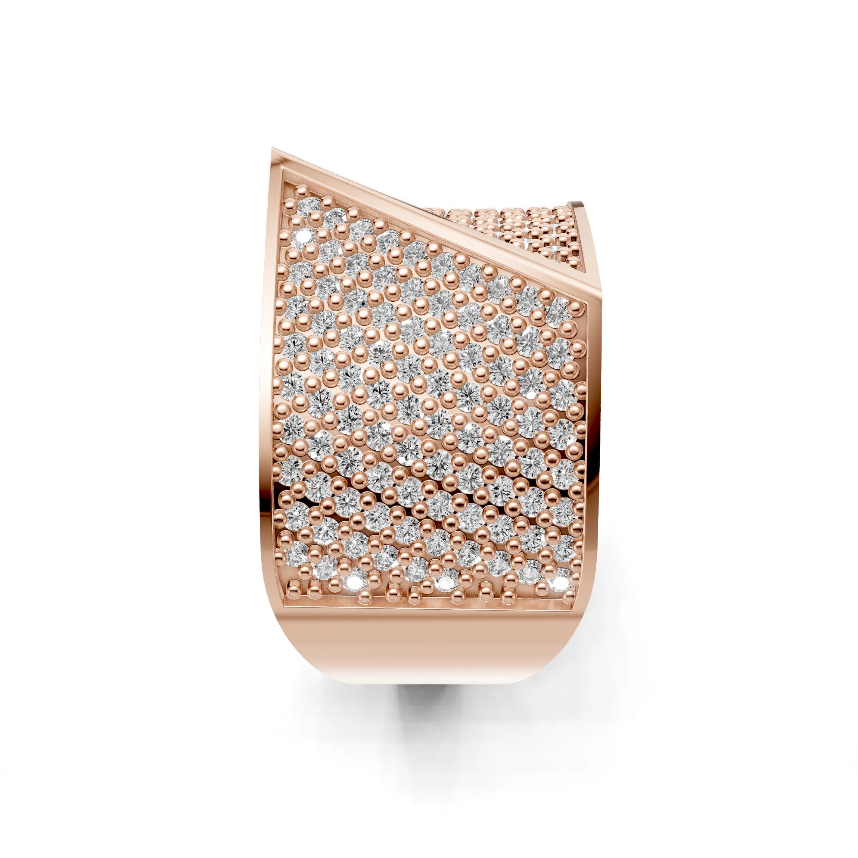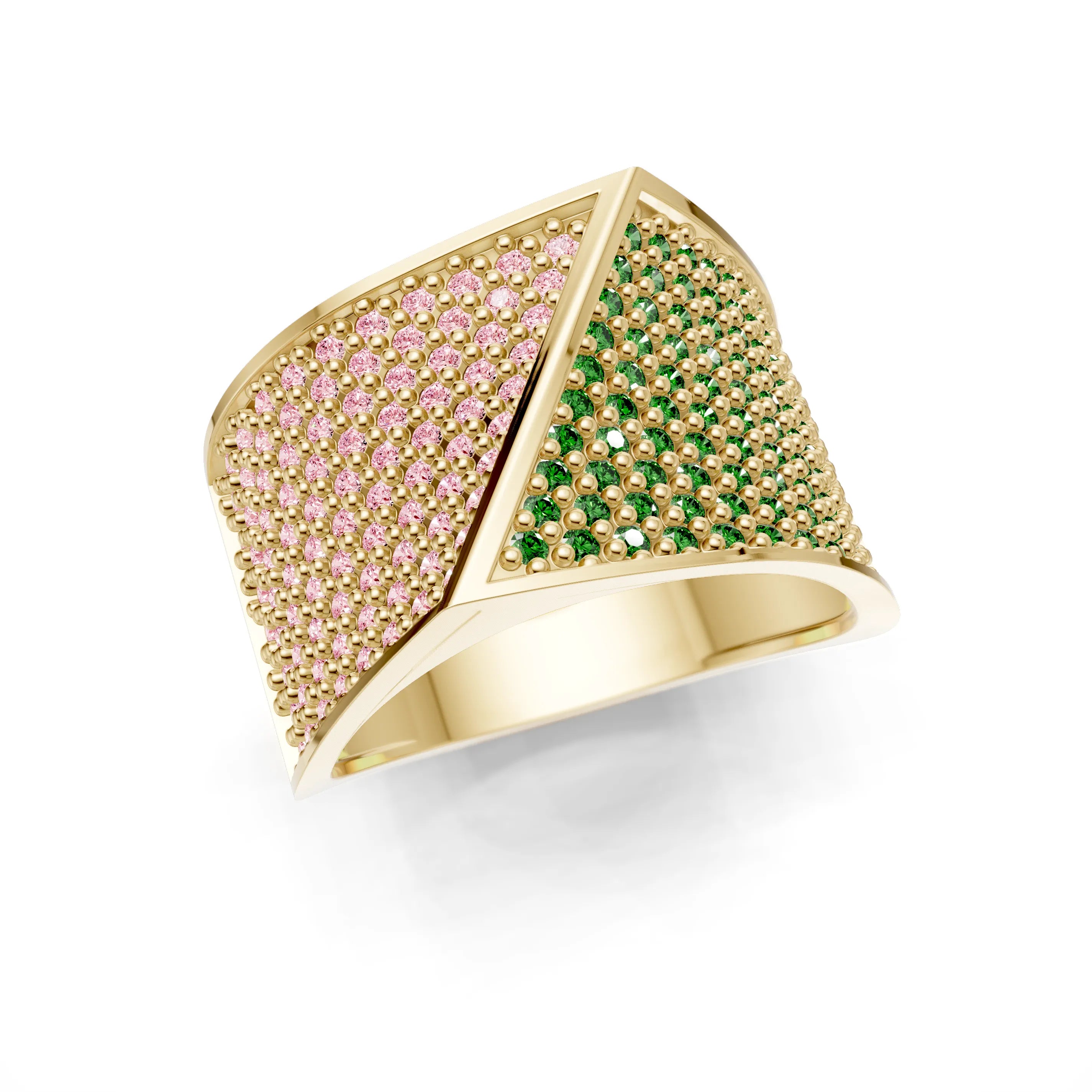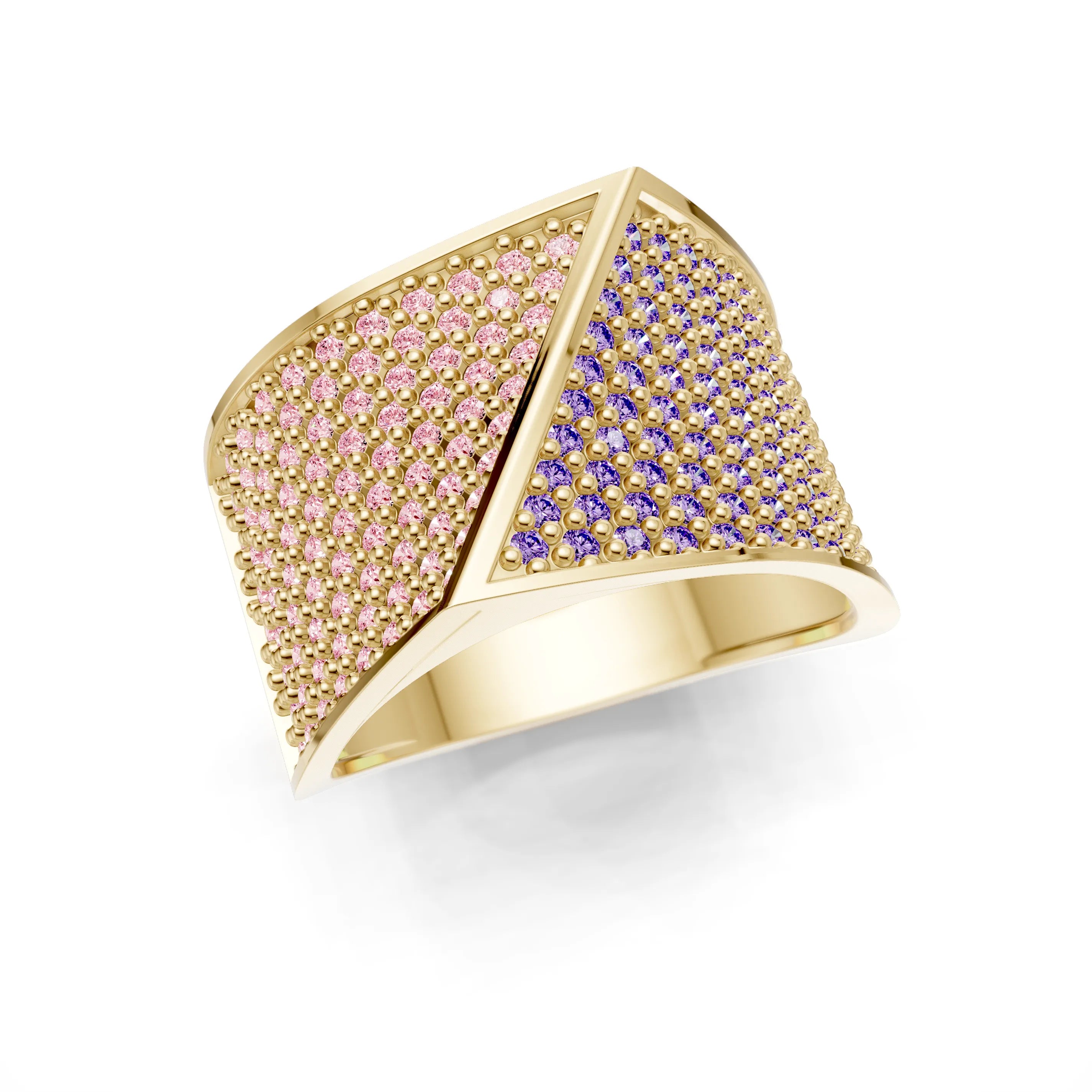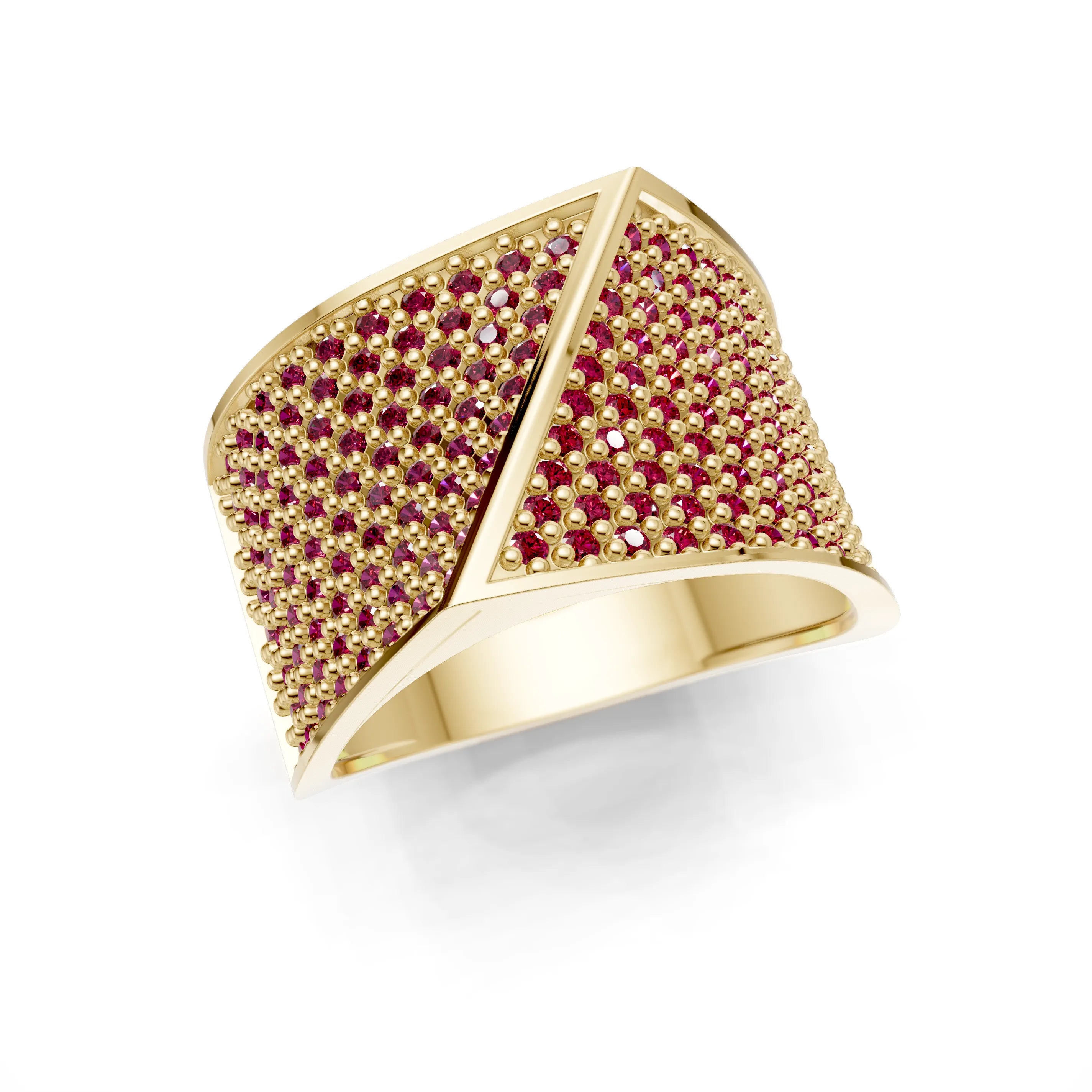 The "Grandiose Glint Geometric Ring" is a striking piece that boldly marries the precision of geometric design with the lavishness of pave set stones. This contemporary glamour ring stands as a testament to bold jewelry, making it an ideal statement piece for any sophisticated soiree or high-end event.