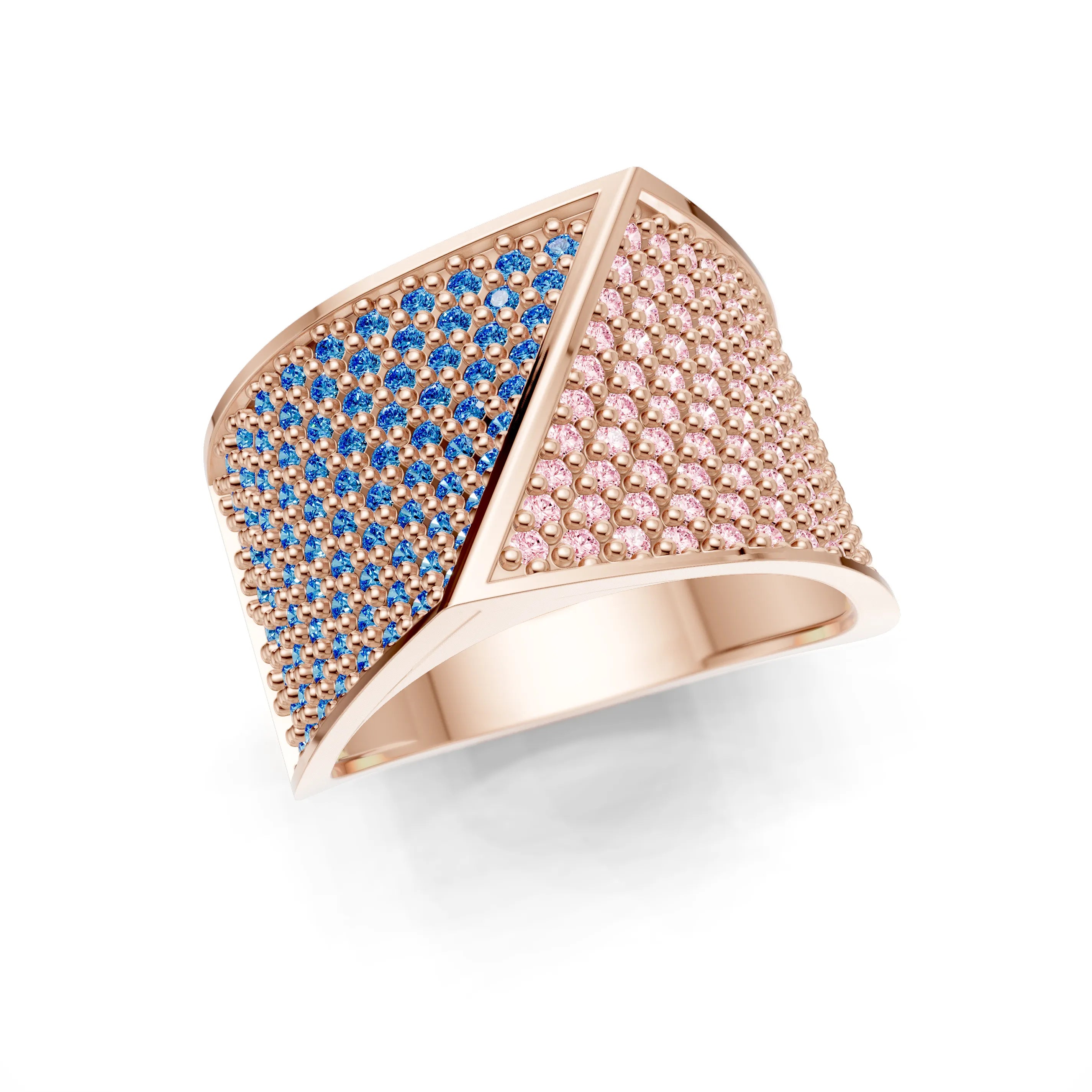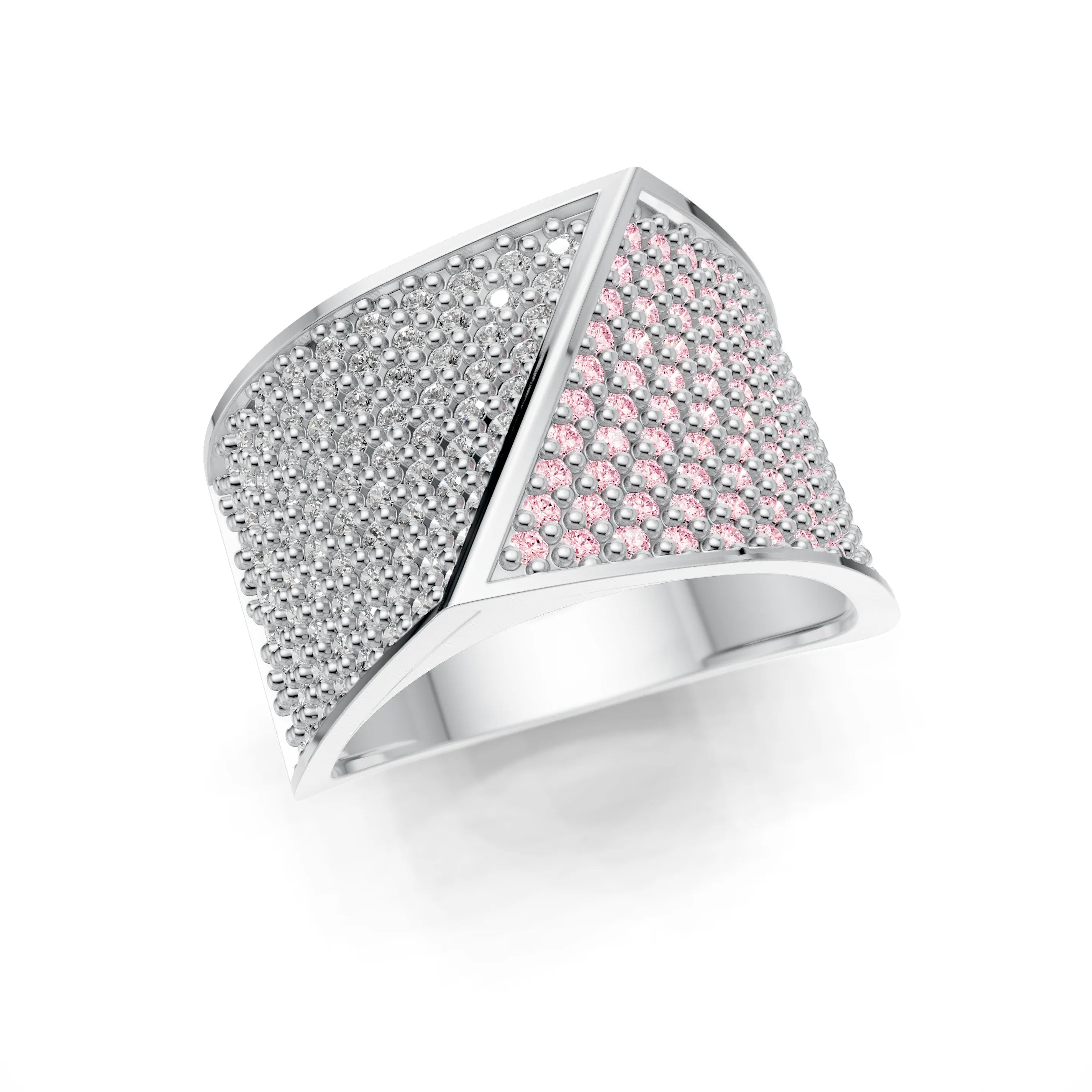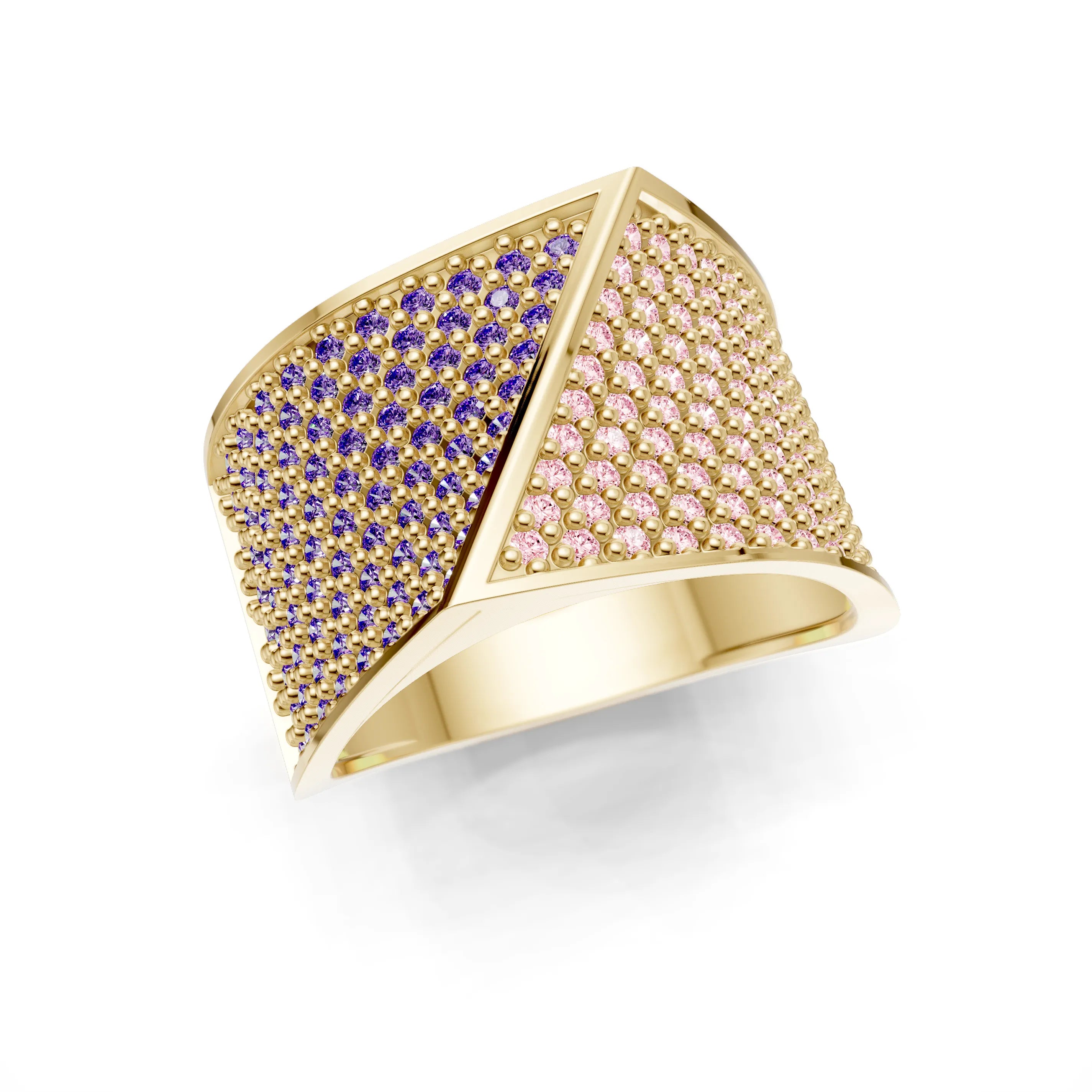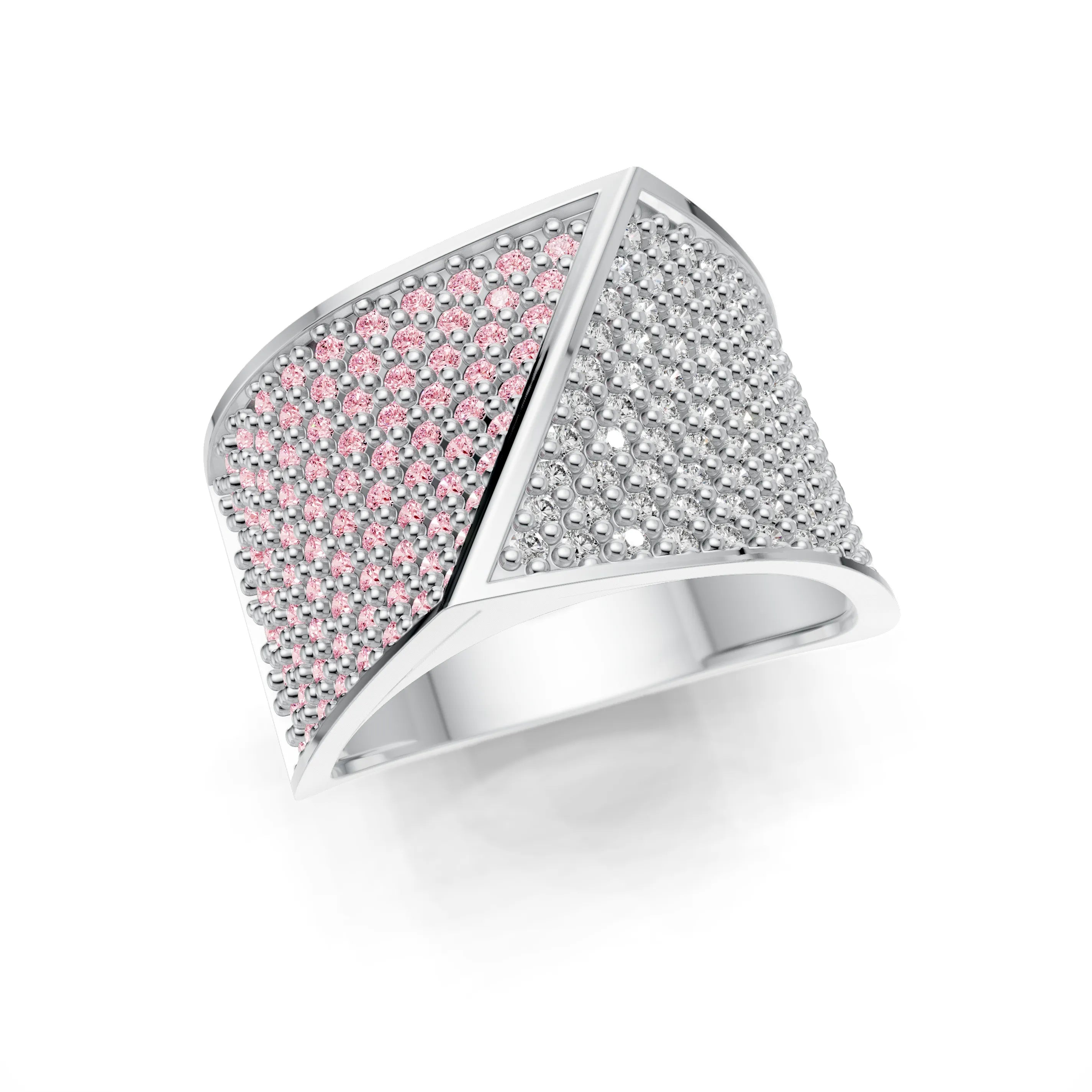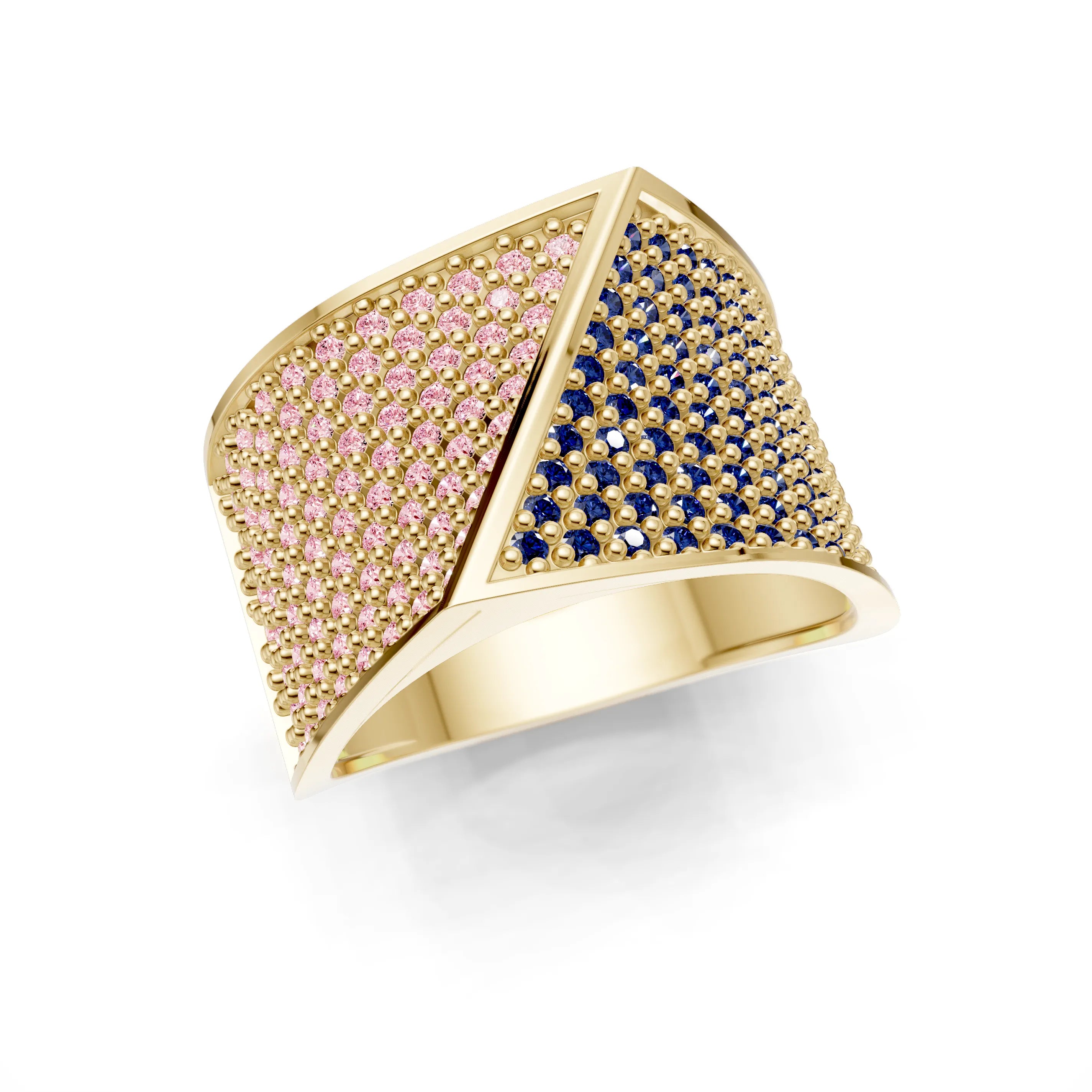 The "Grandiose Glint Geometric Ring" is a striking piece that boldly marries the precision of geometric design with the lavishness of pave set stones. This contemporary glamour ring stands as a testament to bold jewelry, making it an ideal statement piece for any sophisticated soiree or high-end event.