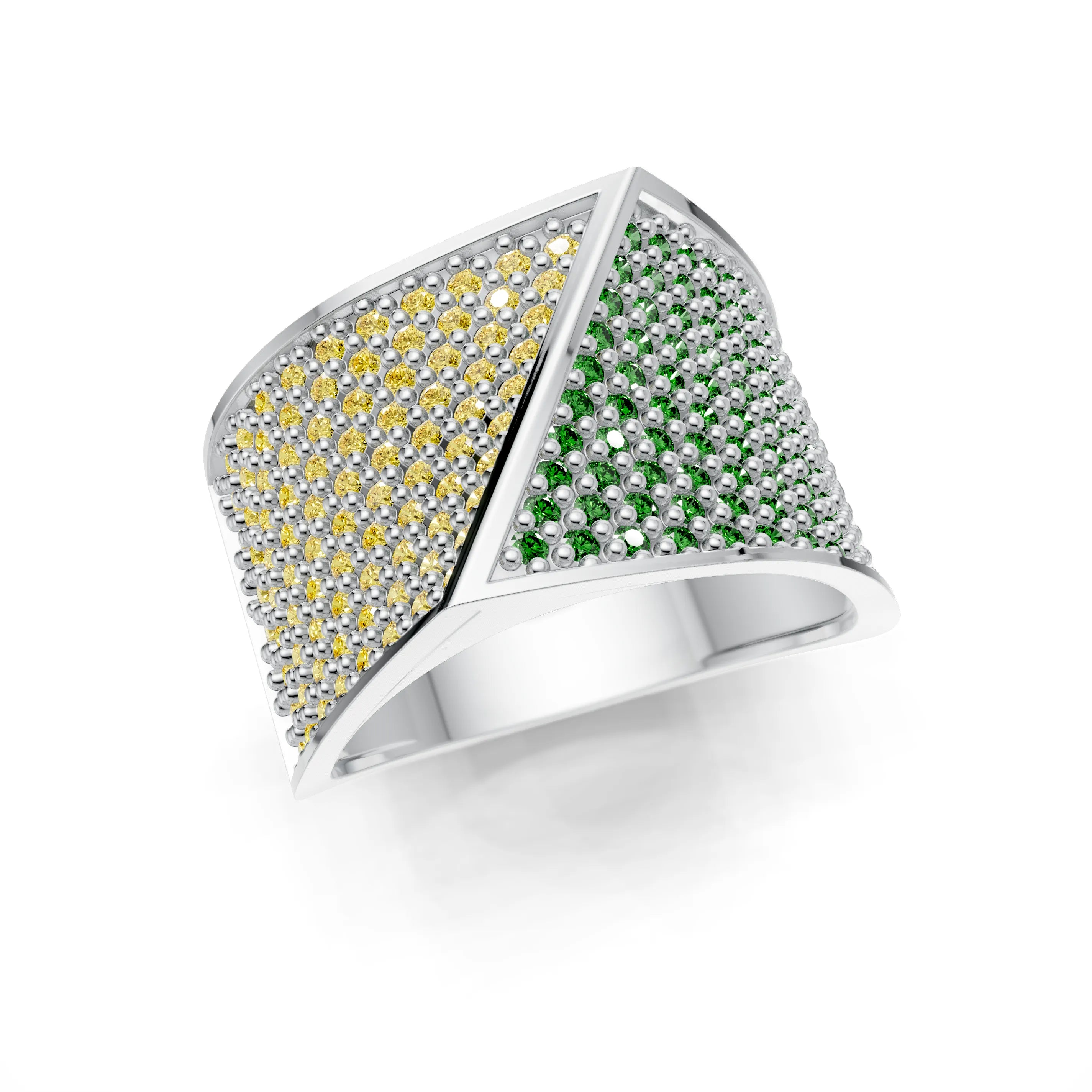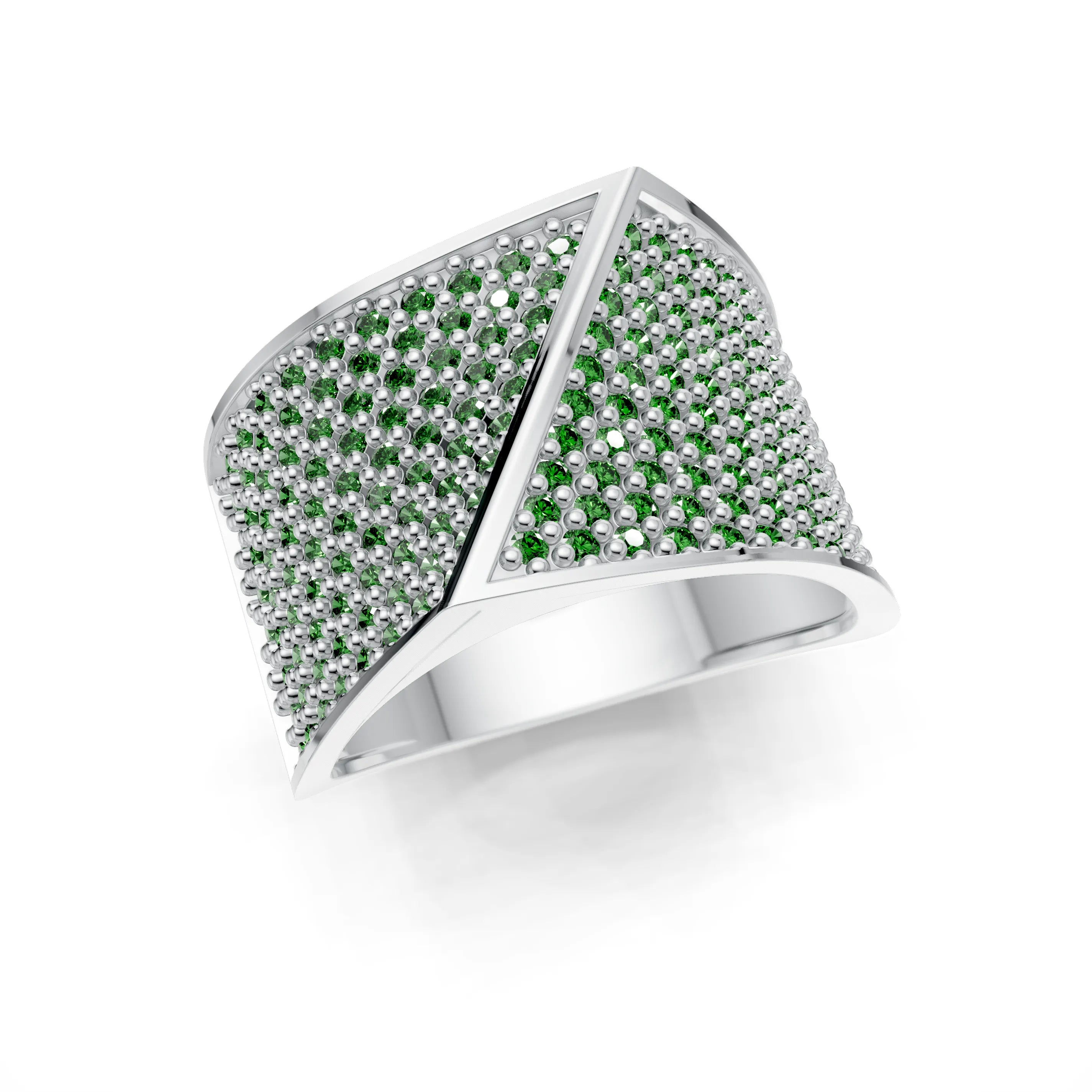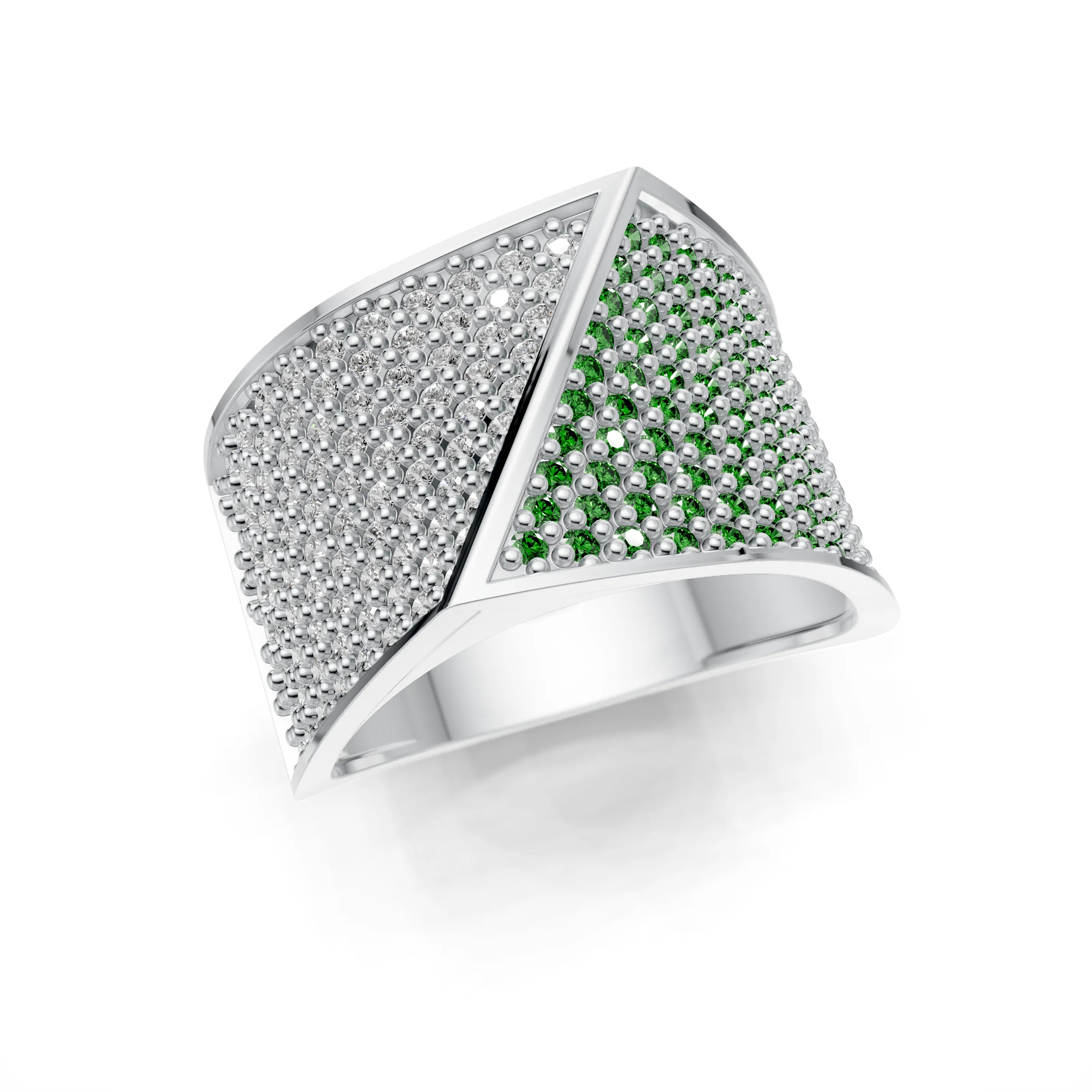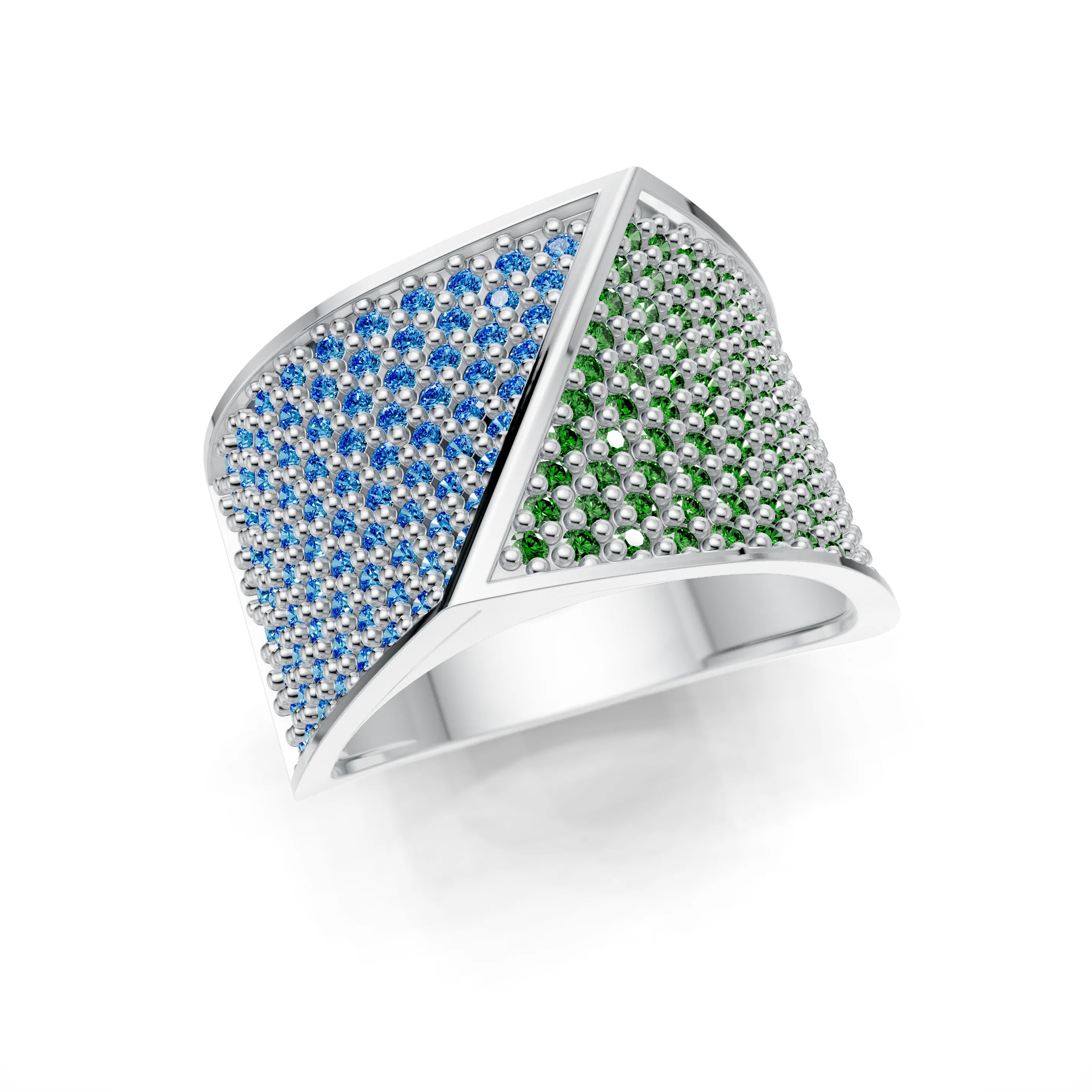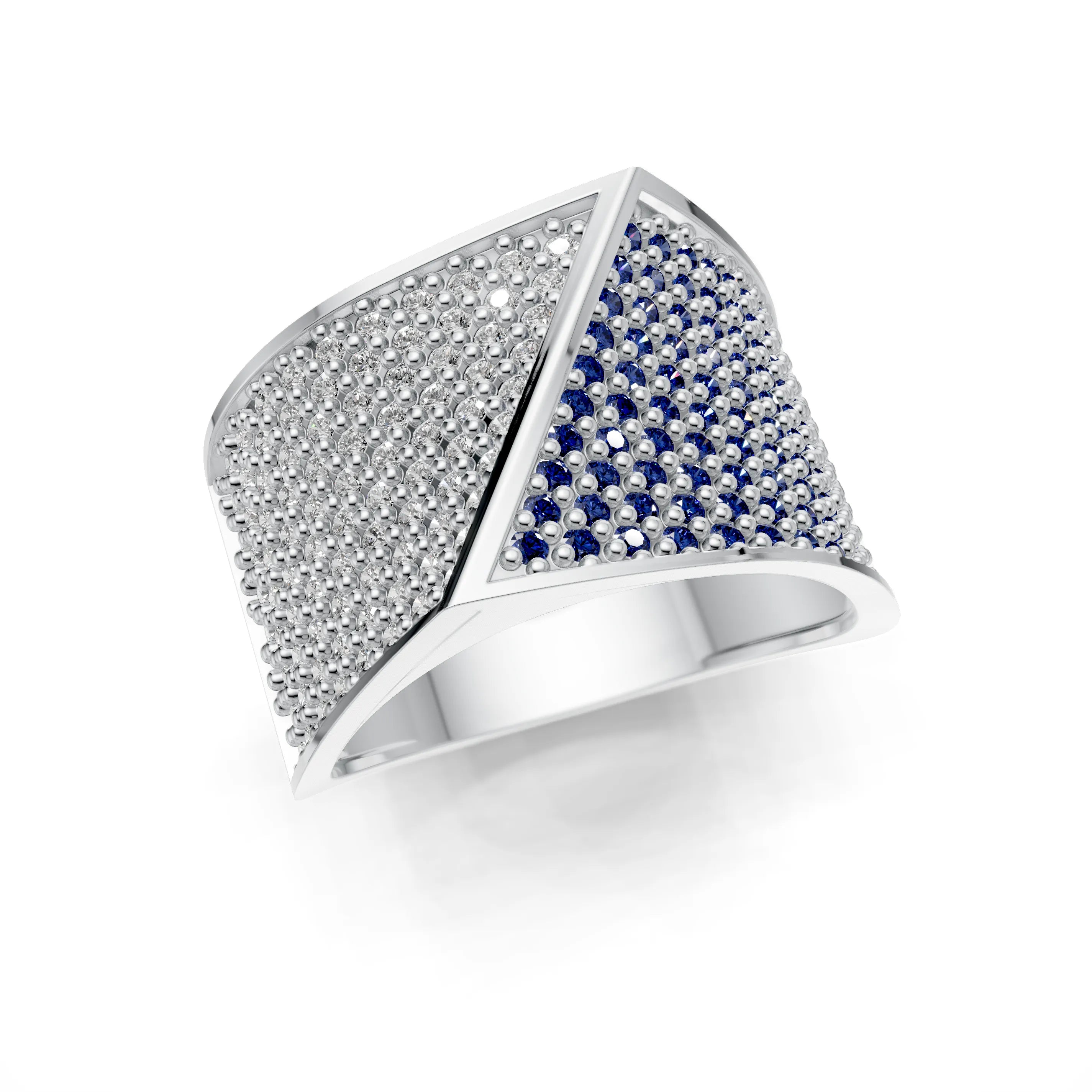 The ring's architectural structure is reminiscent of Art Deco inspiration, offering a modernist cocktail ring that's both opulent and uniquely non-traditional. It's an architectural luxury jewelry piece, fashioned for those who dare to showcase their edgy style with fine jewelry.