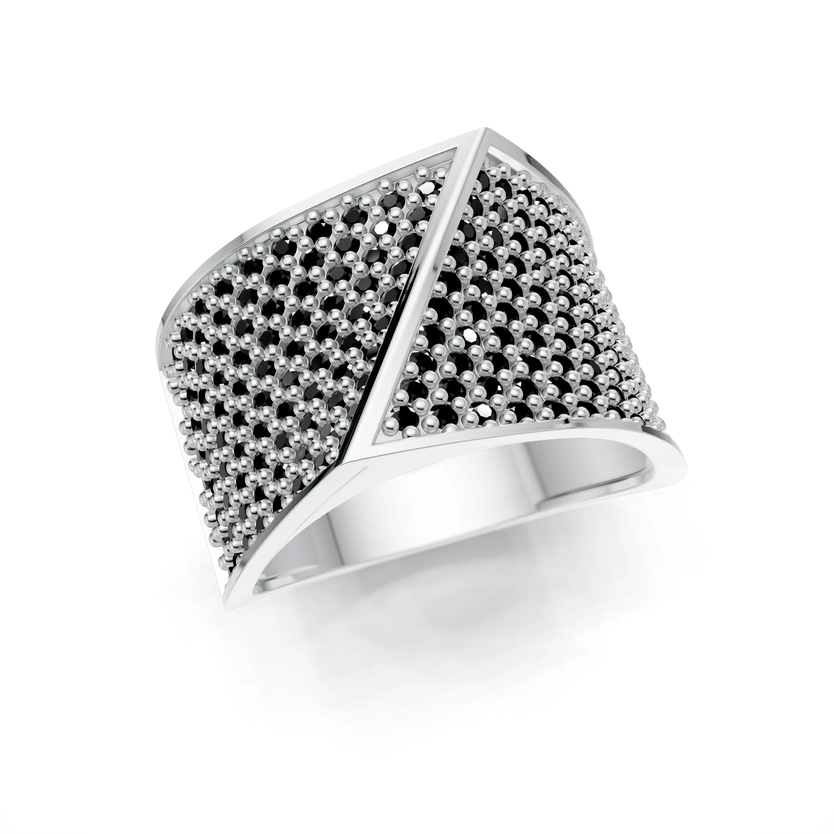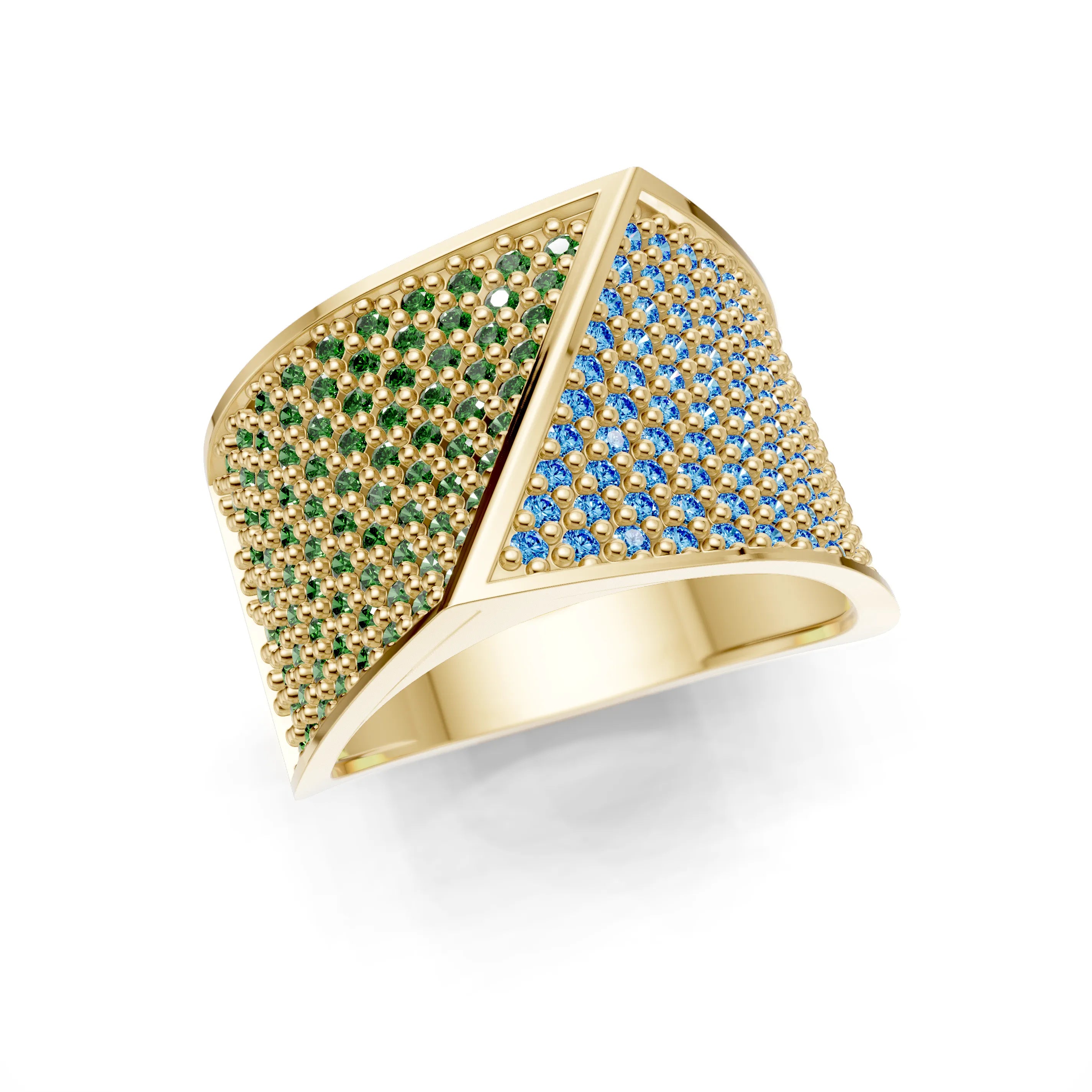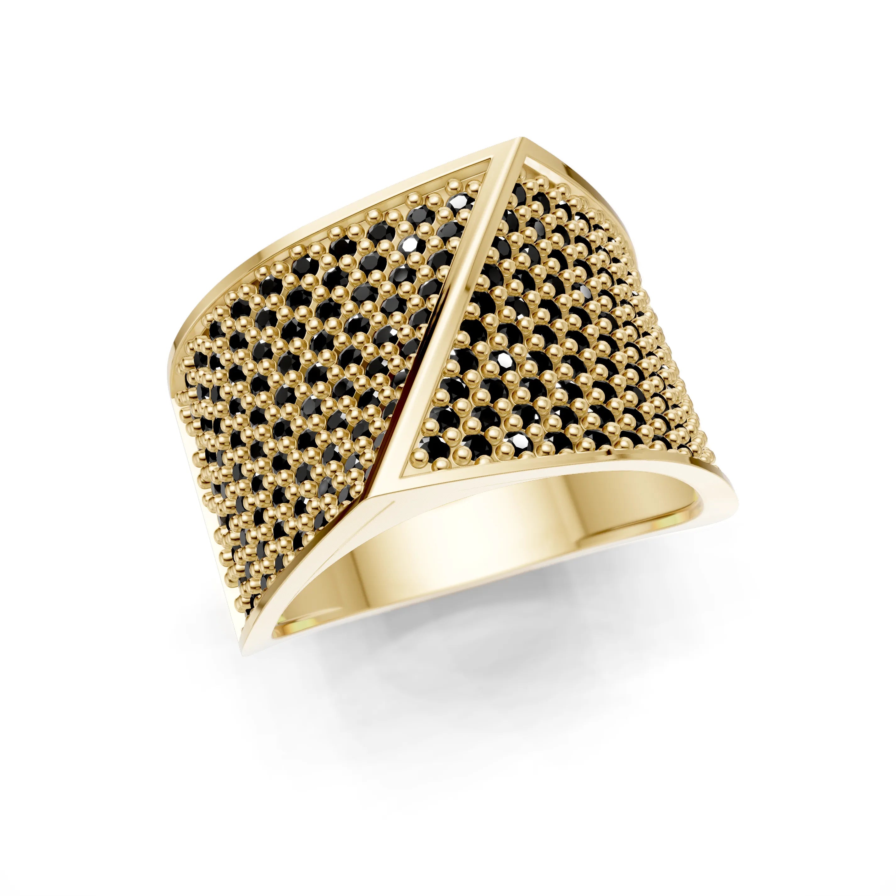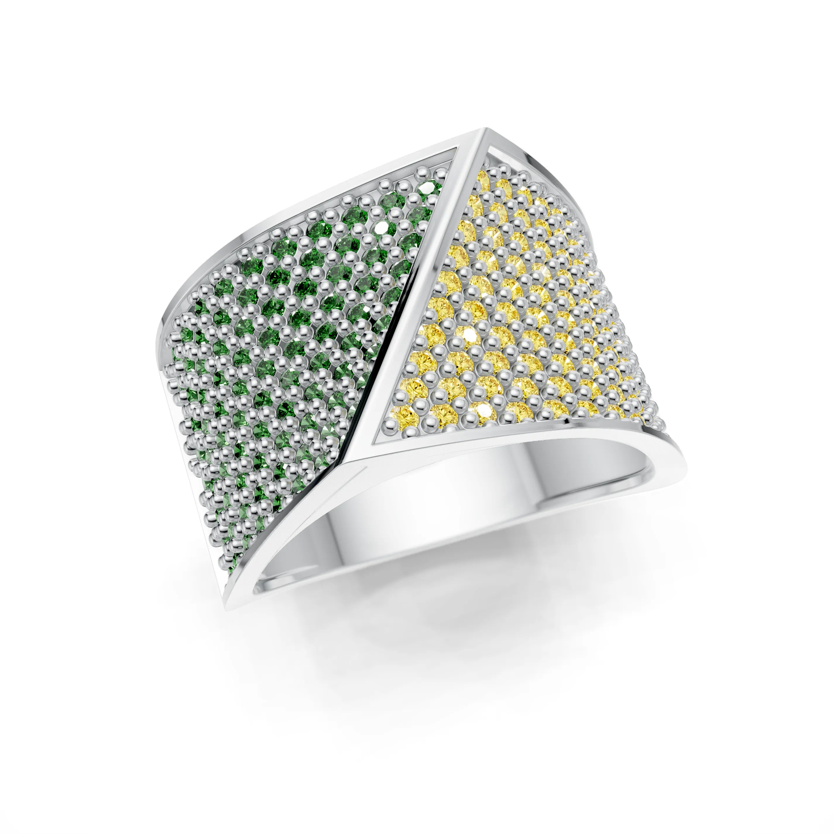 The ring's architectural structure is reminiscent of Art Deco inspiration, offering a modernist cocktail ring that's both opulent and uniquely non-traditional. It's an architectural luxury jewelry piece, fashioned for those who dare to showcase their edgy style with fine jewelry.