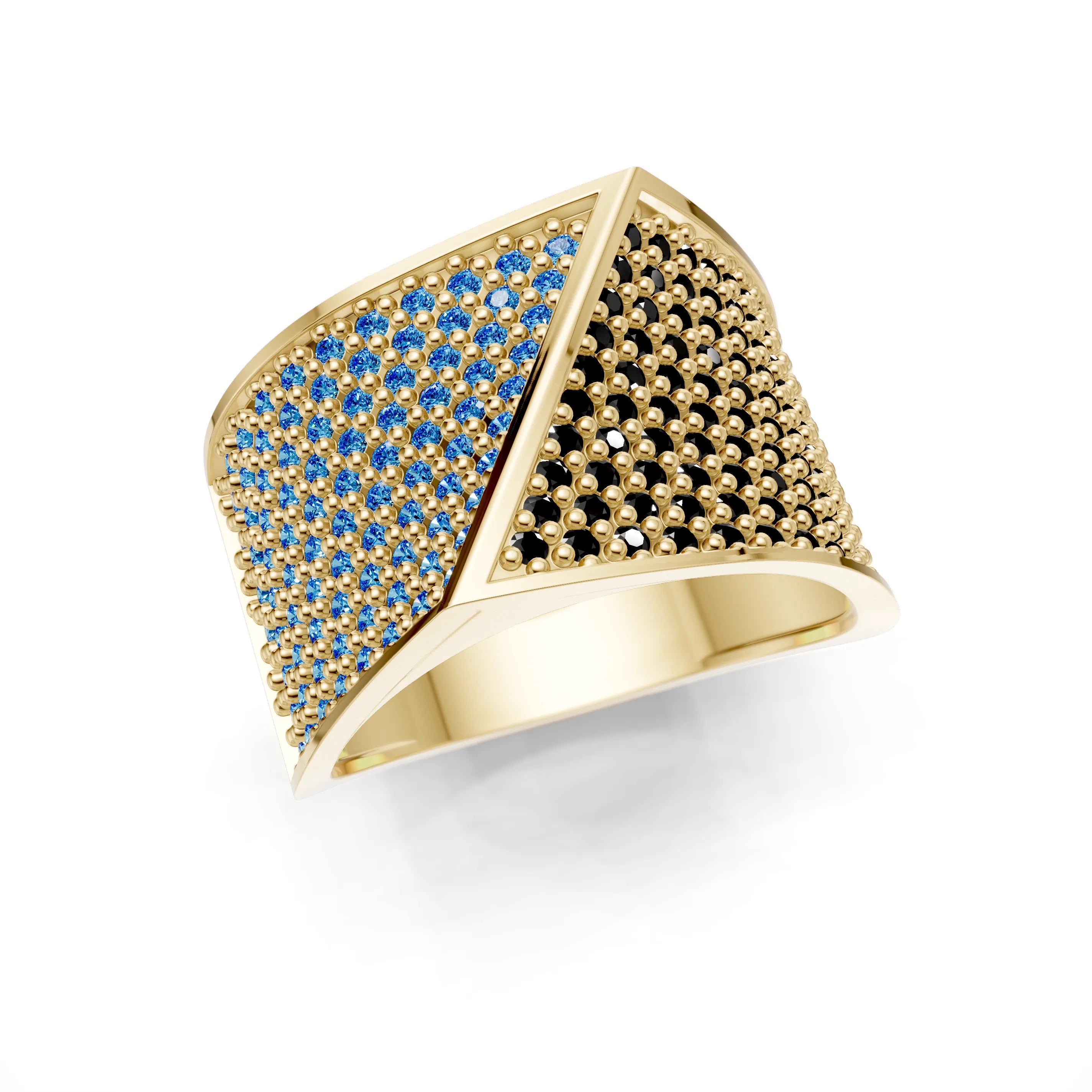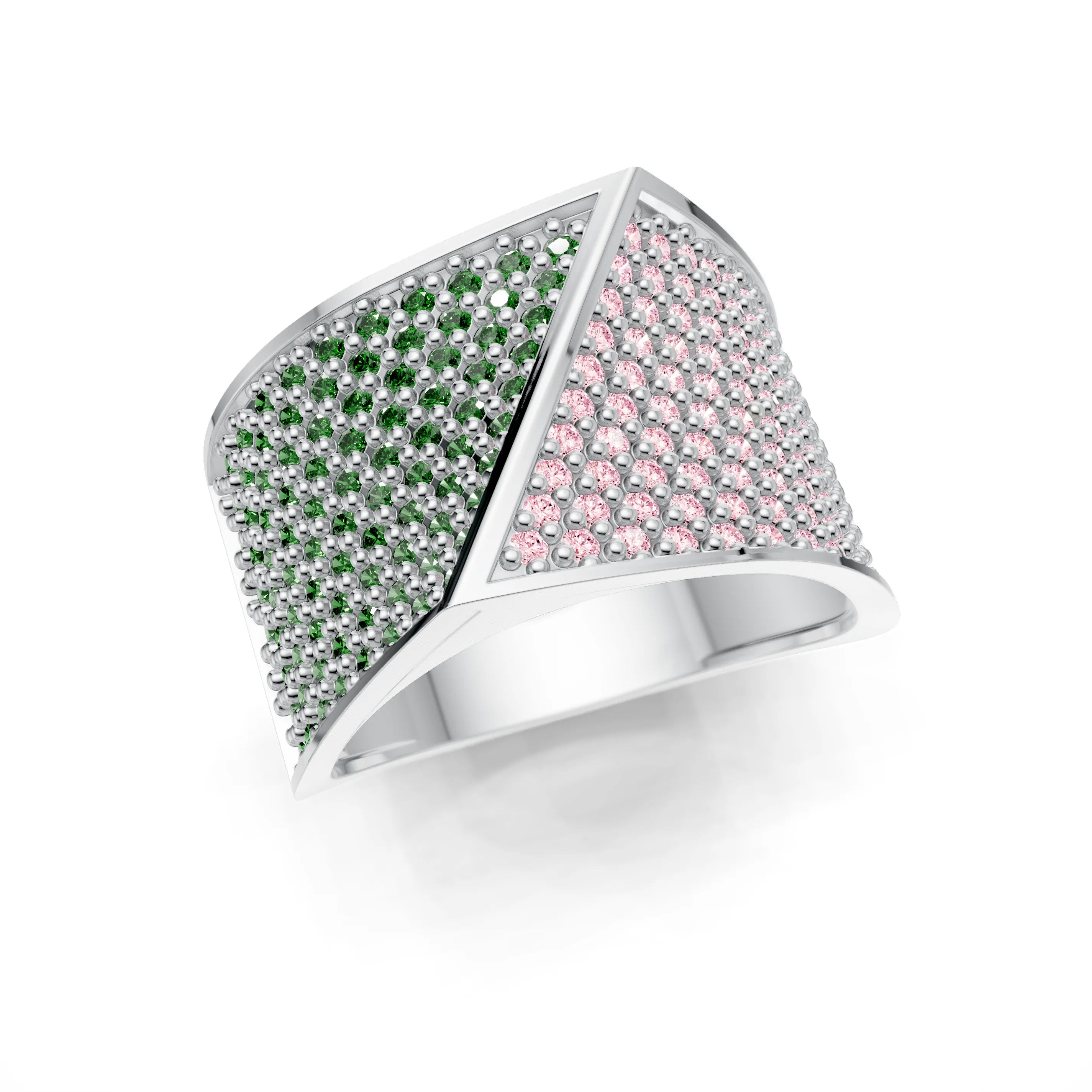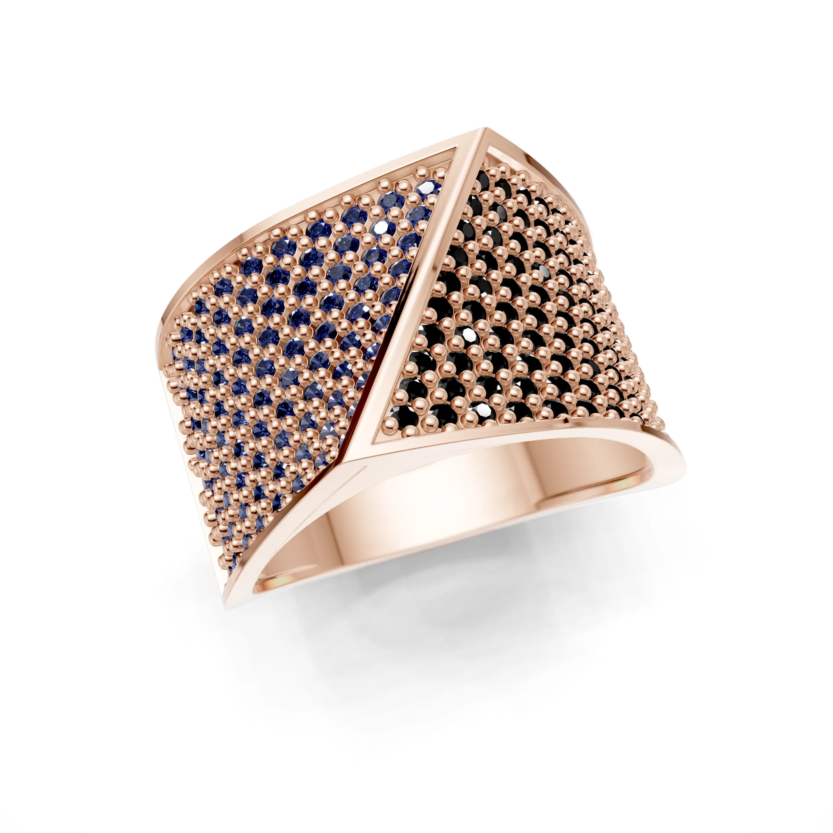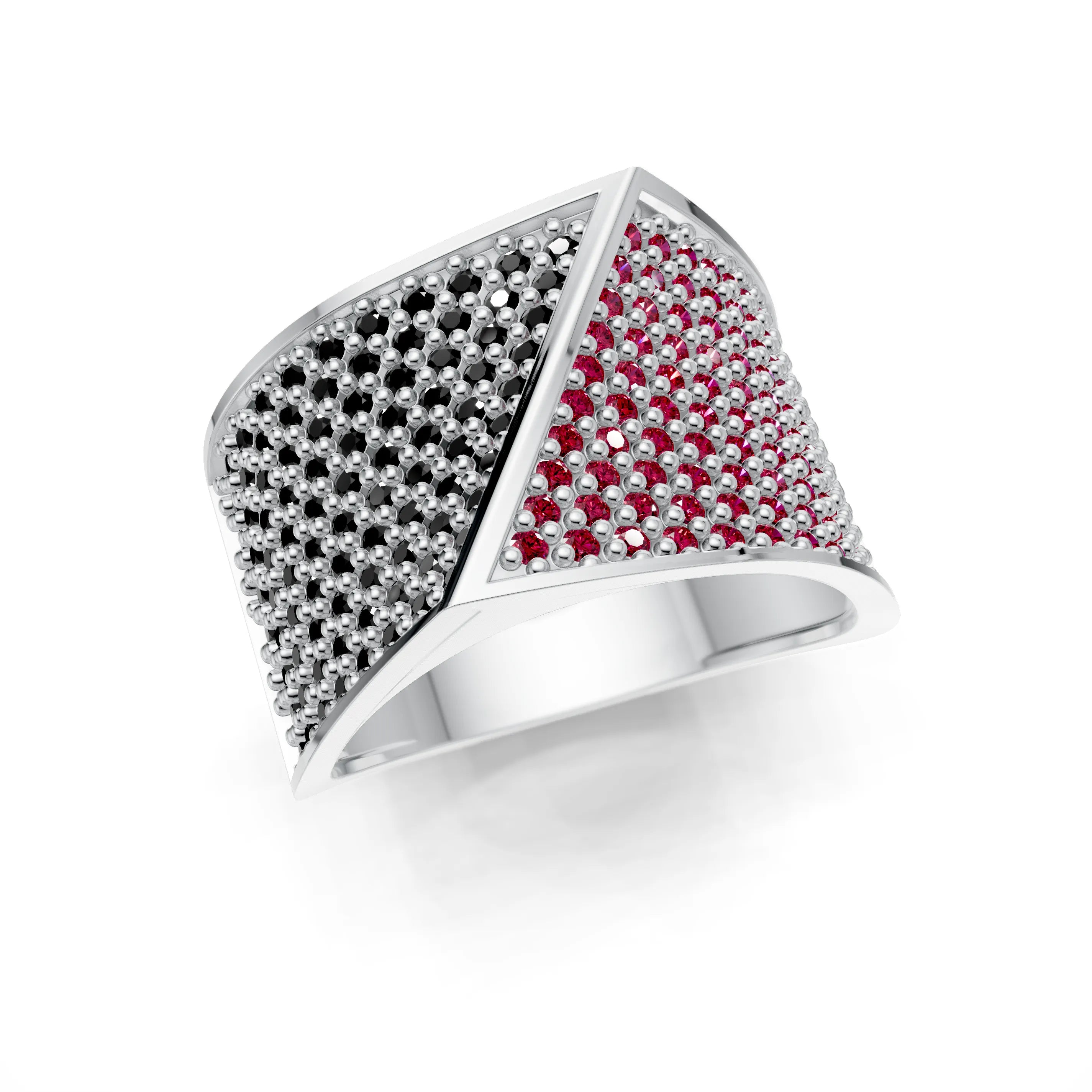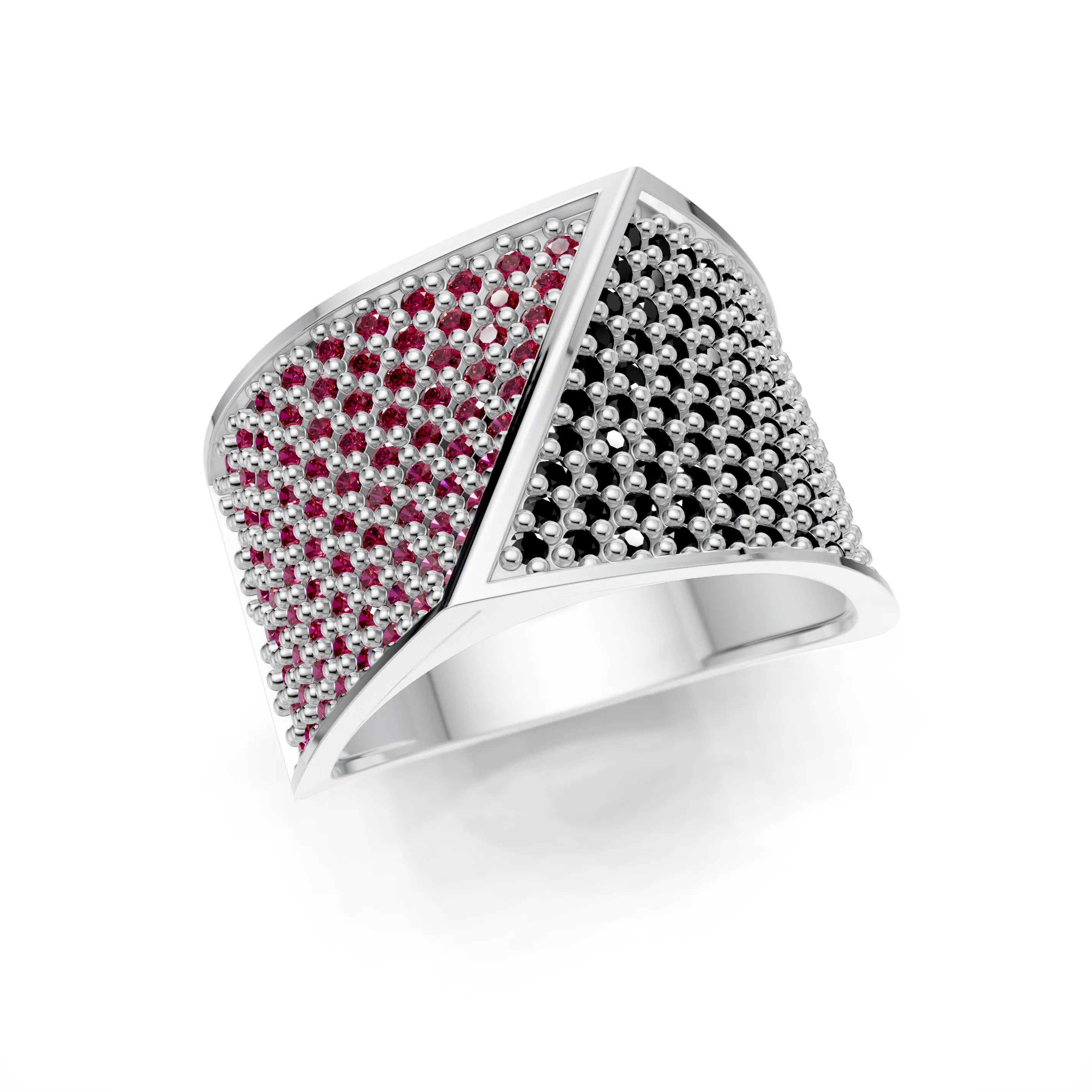 The ring's architectural structure is reminiscent of Art Deco inspiration, offering a modernist cocktail ring that's both opulent and uniquely non-traditional. It's an architectural luxury jewelry piece, fashioned for those who dare to showcase their edgy style with fine jewelry.