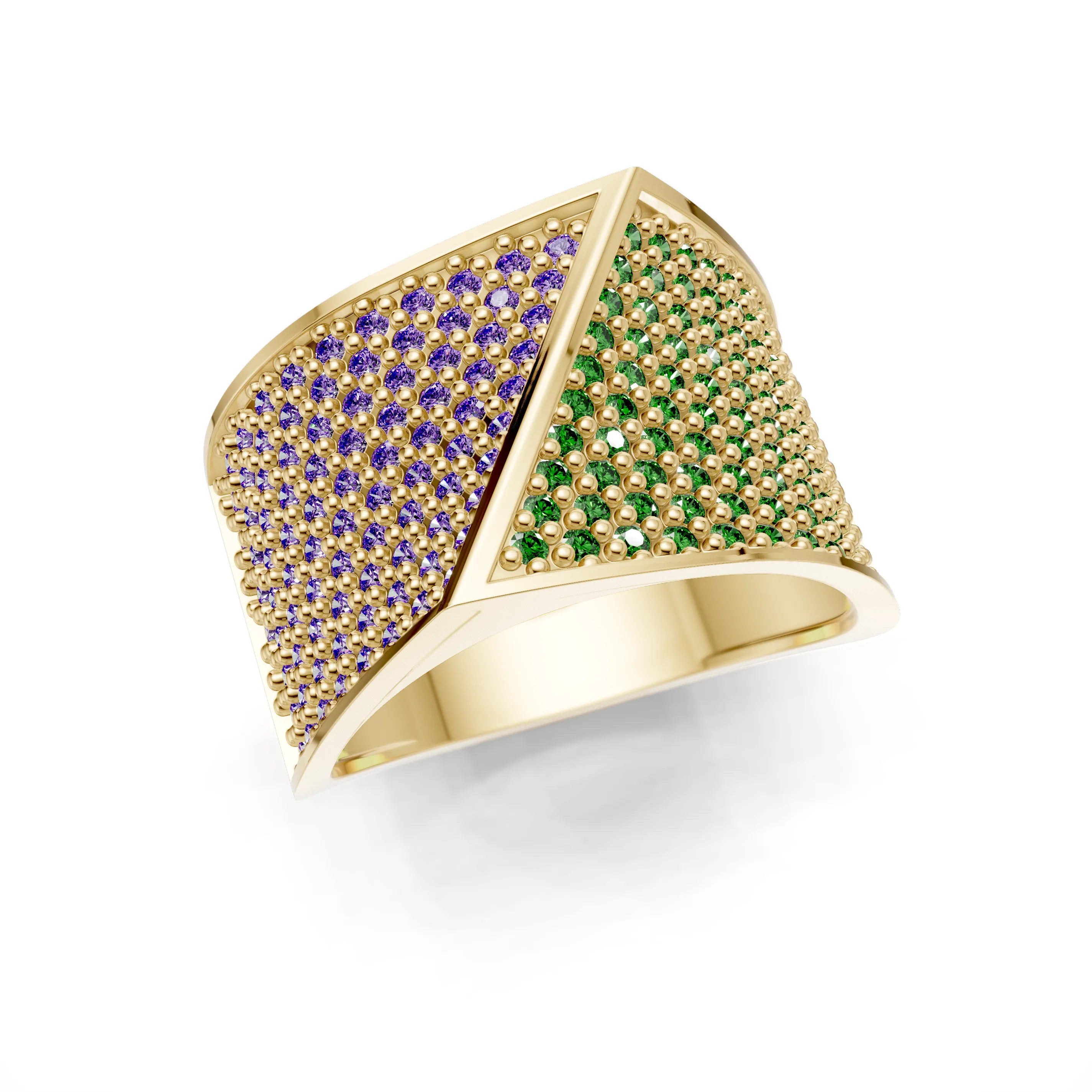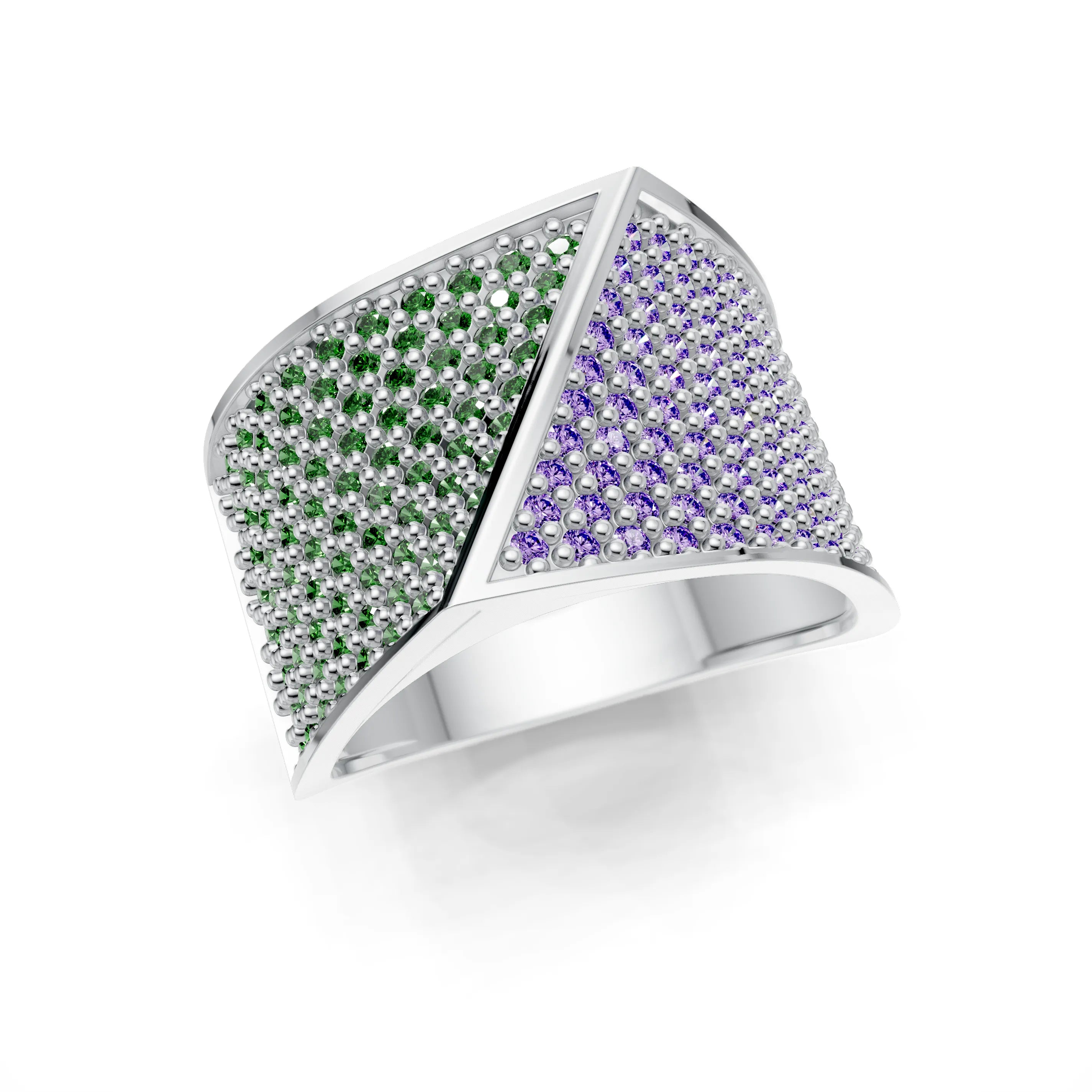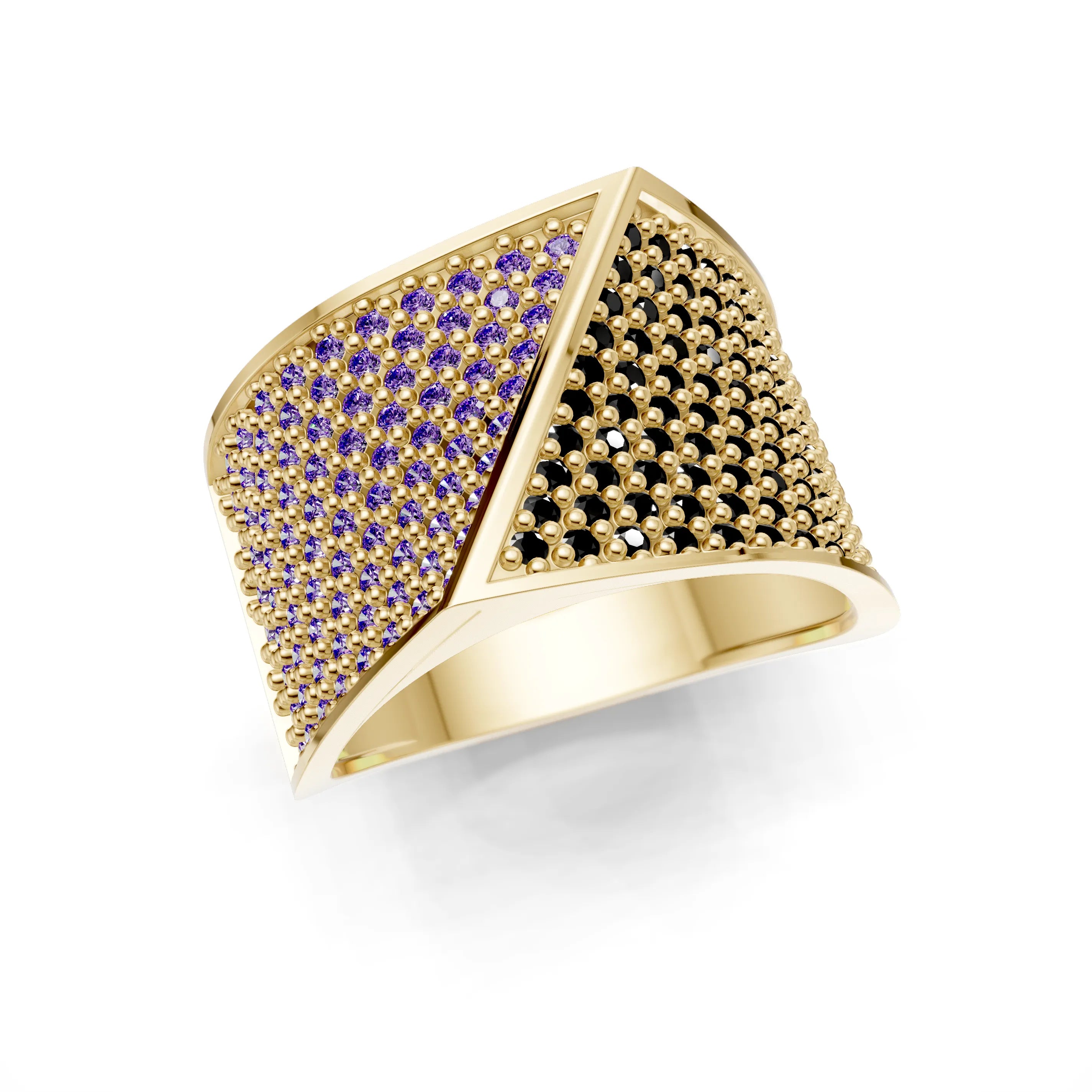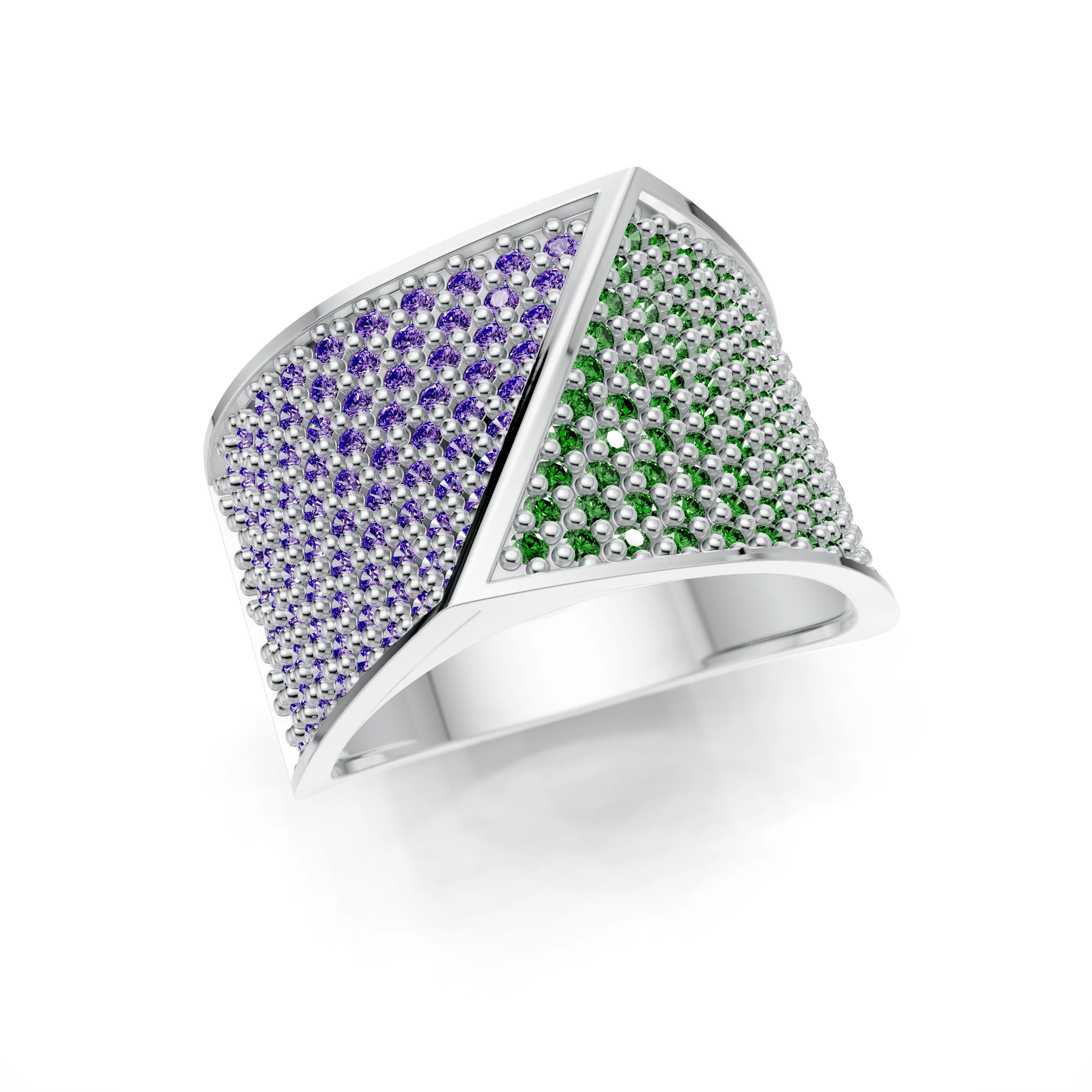 As a wide band ring, it makes a powerful elite fashion statement, suited for those occasions where making a memorable impression is key. Perfect for an evening of elegance or as a posh non-diamond gemstone accessory, it's a non-traditional bridal ring choice for the bride who stands out from the crowd. This non-diamond designer ring is for the individual with an eye for detail and a heart for the grandeur of bygone eras, reinvented for the modern age.