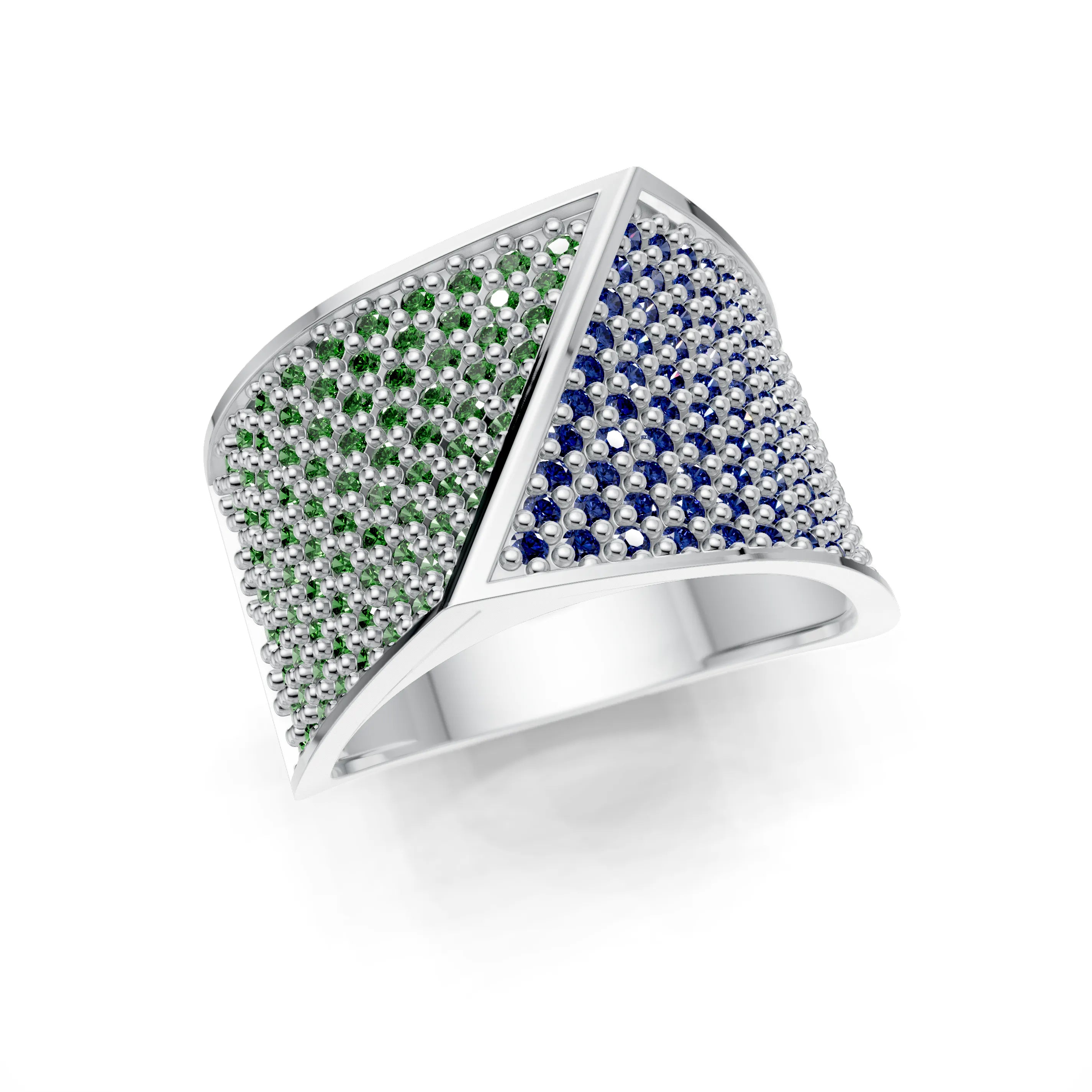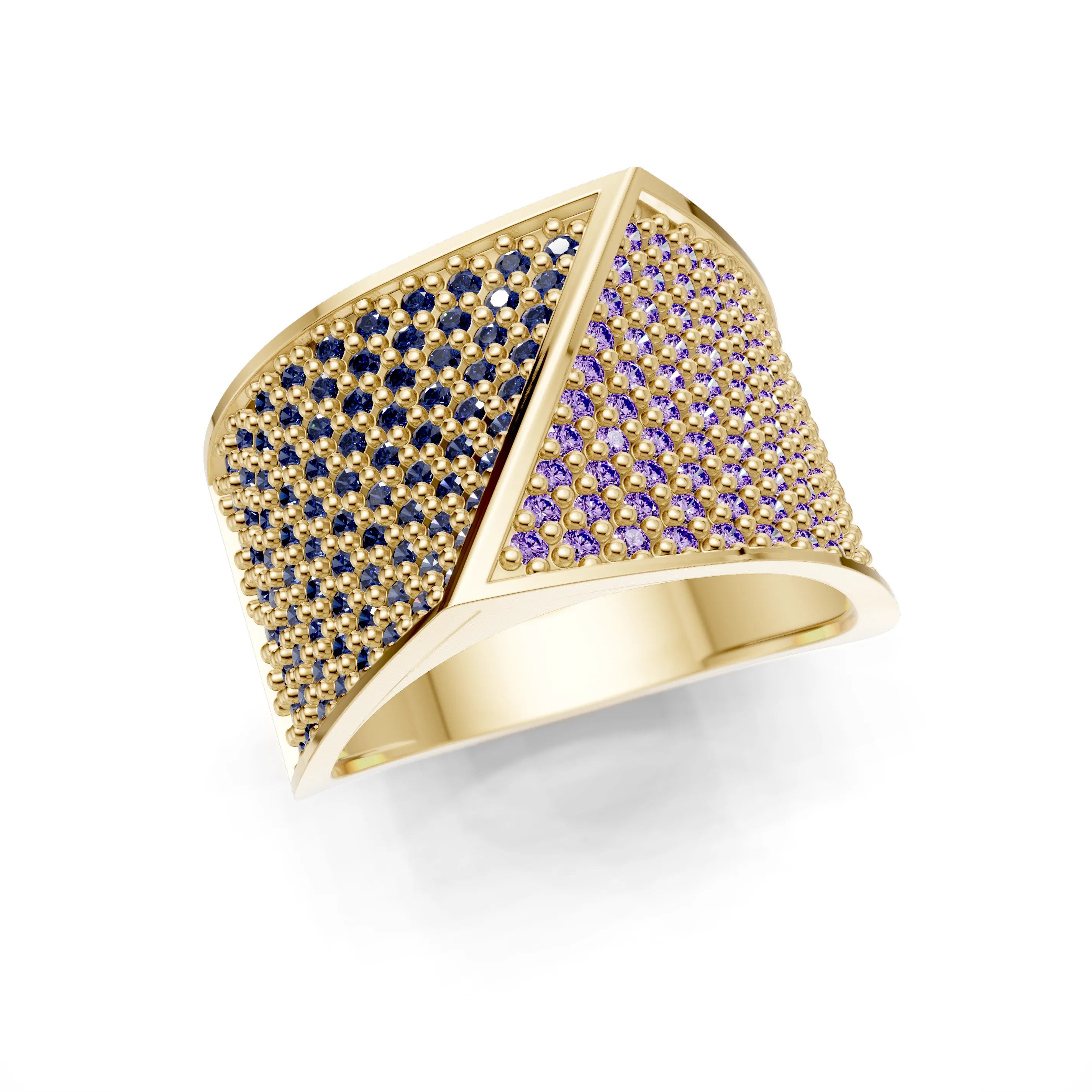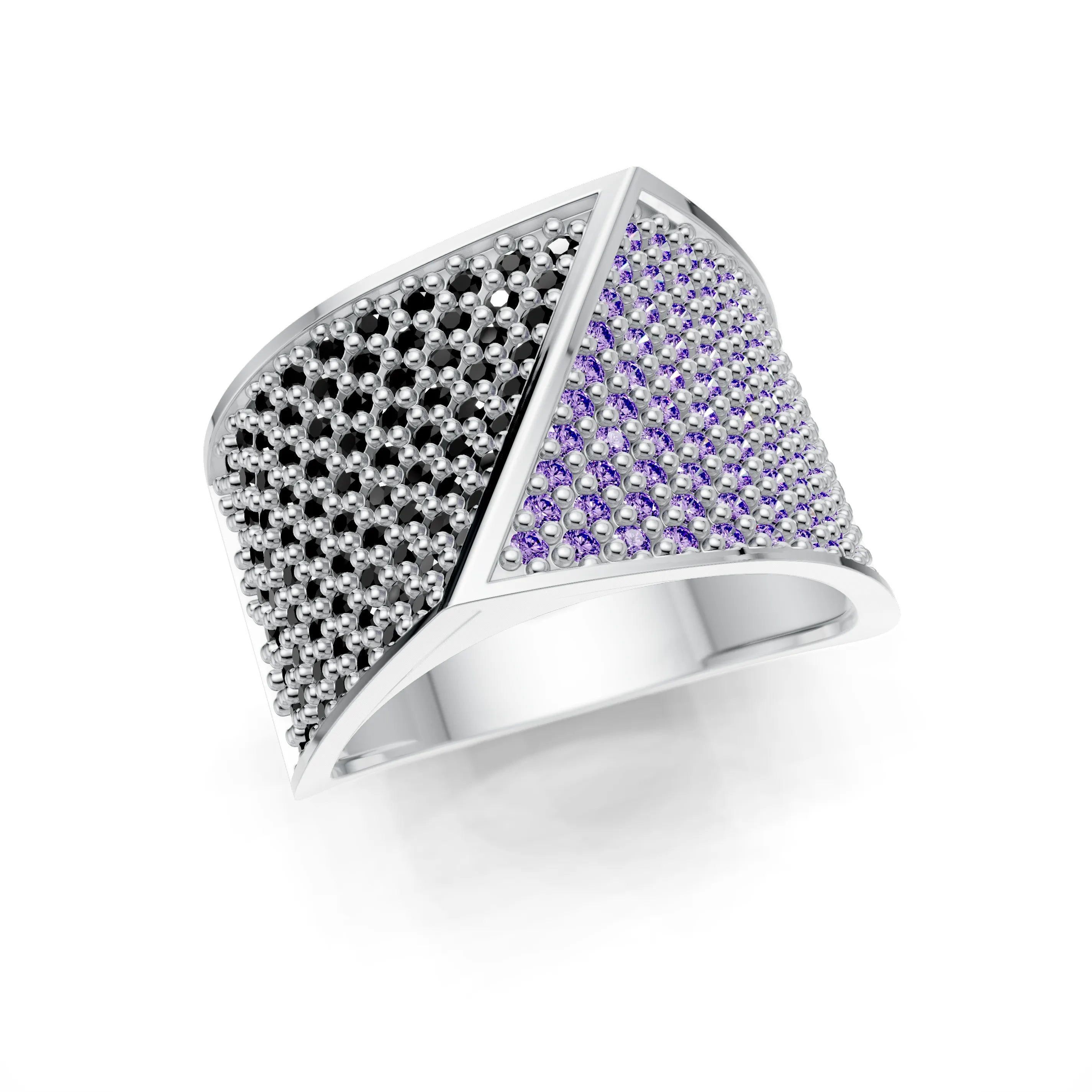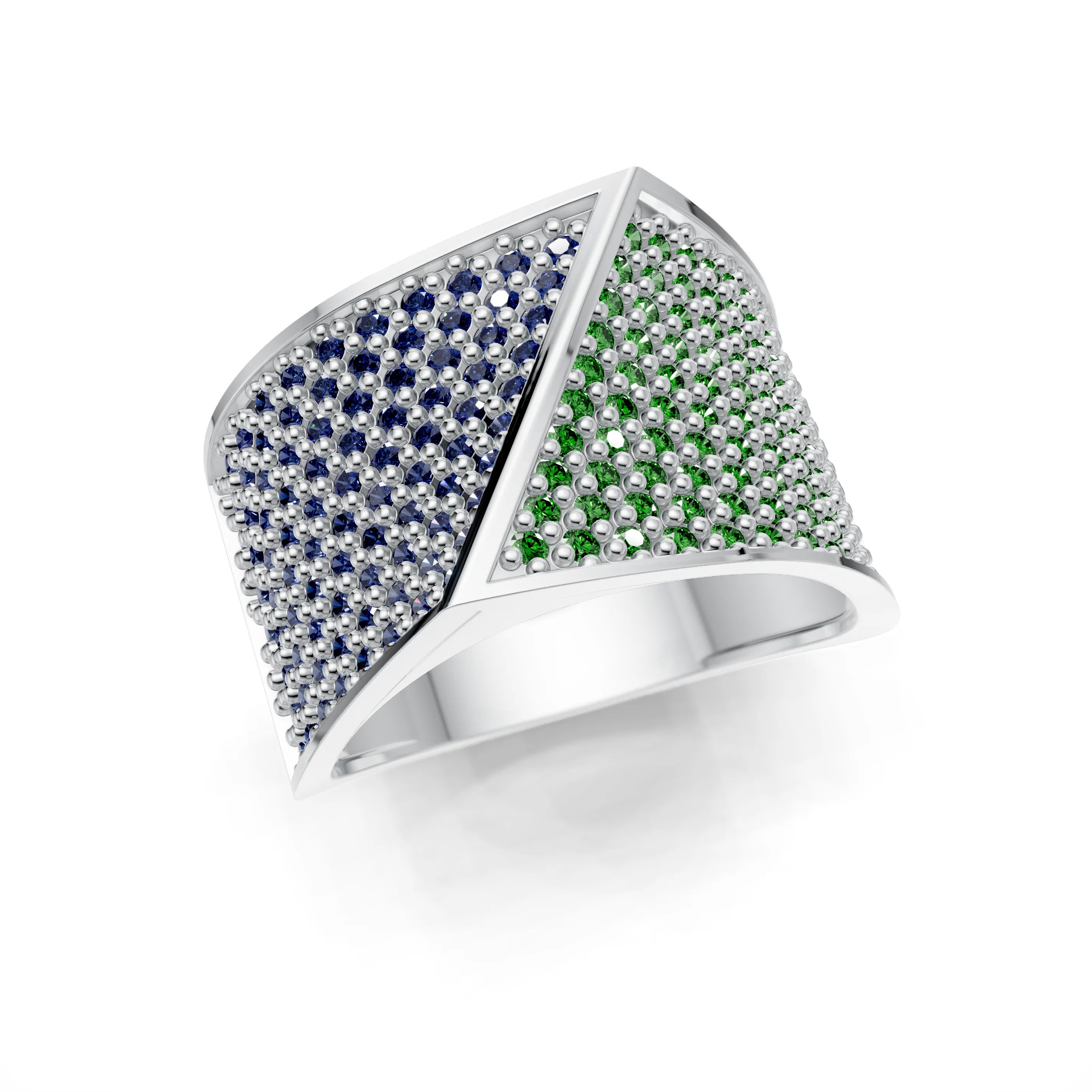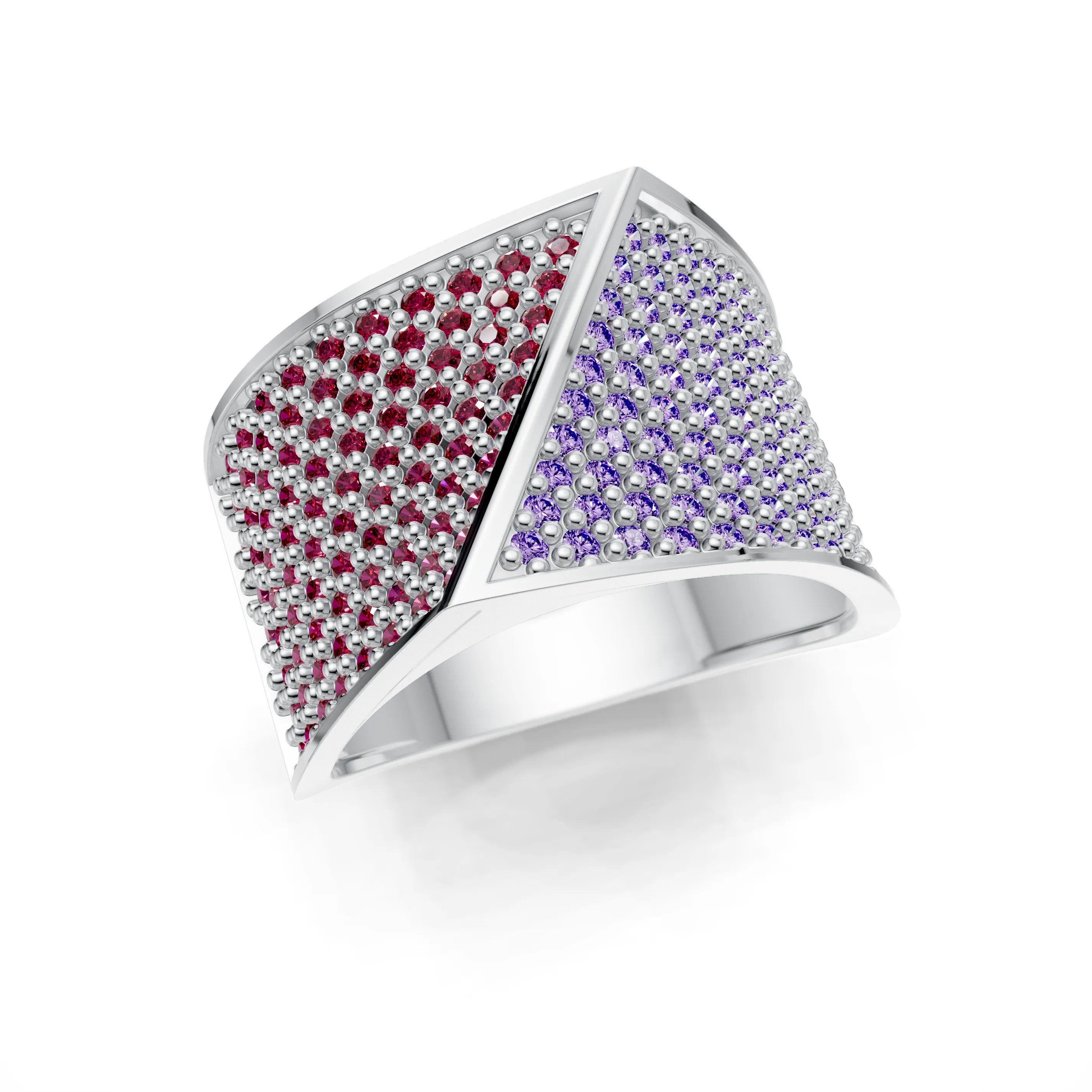 As a wide band ring, it makes a powerful elite fashion statement, suited for those occasions where making a memorable impression is key. Perfect for an evening of elegance or as a posh non-diamond gemstone accessory, it's a non-traditional bridal ring choice for the bride who stands out from the crowd. This non-diamond designer ring is for the individual with an eye for detail and a heart for the grandeur of bygone eras, reinvented for the modern age.