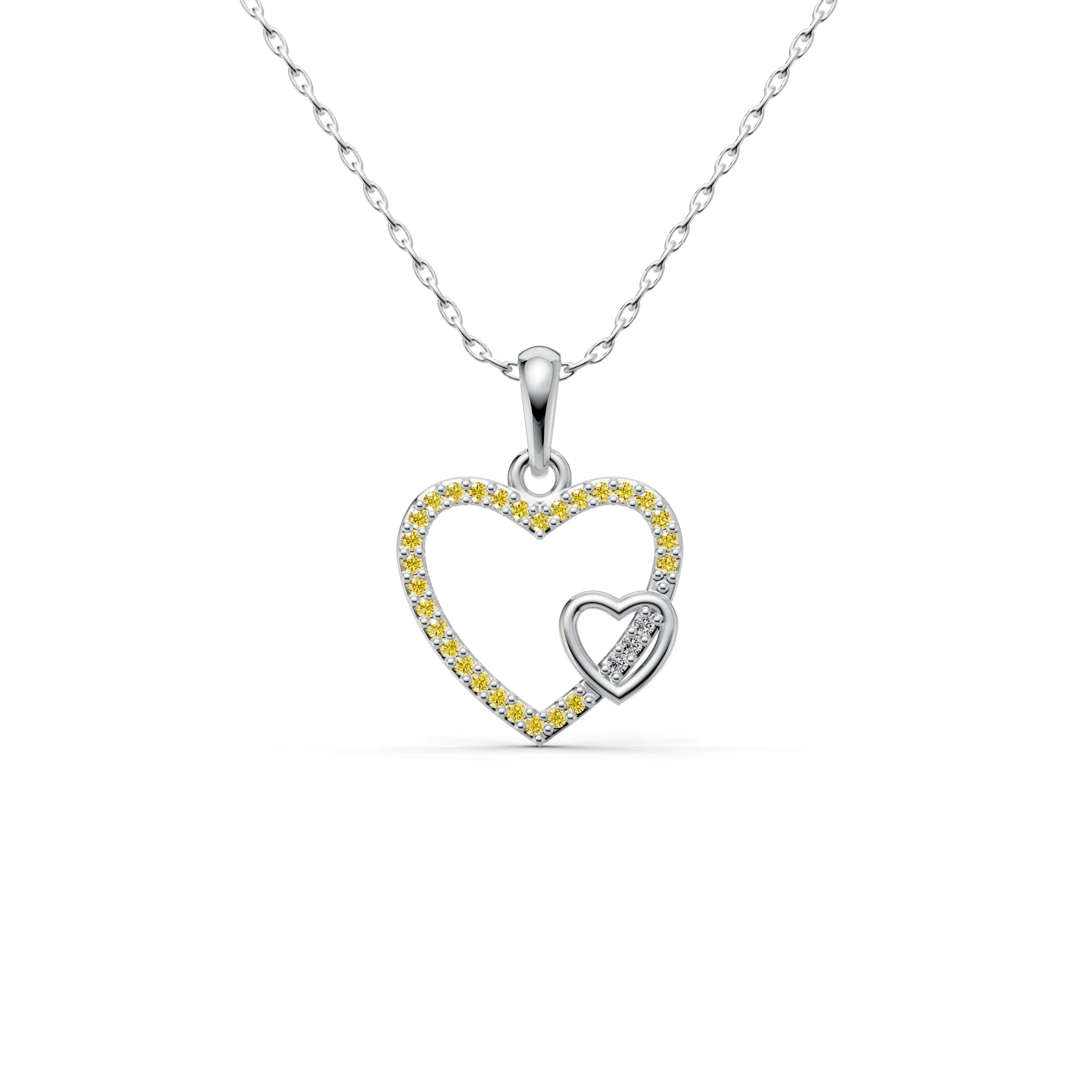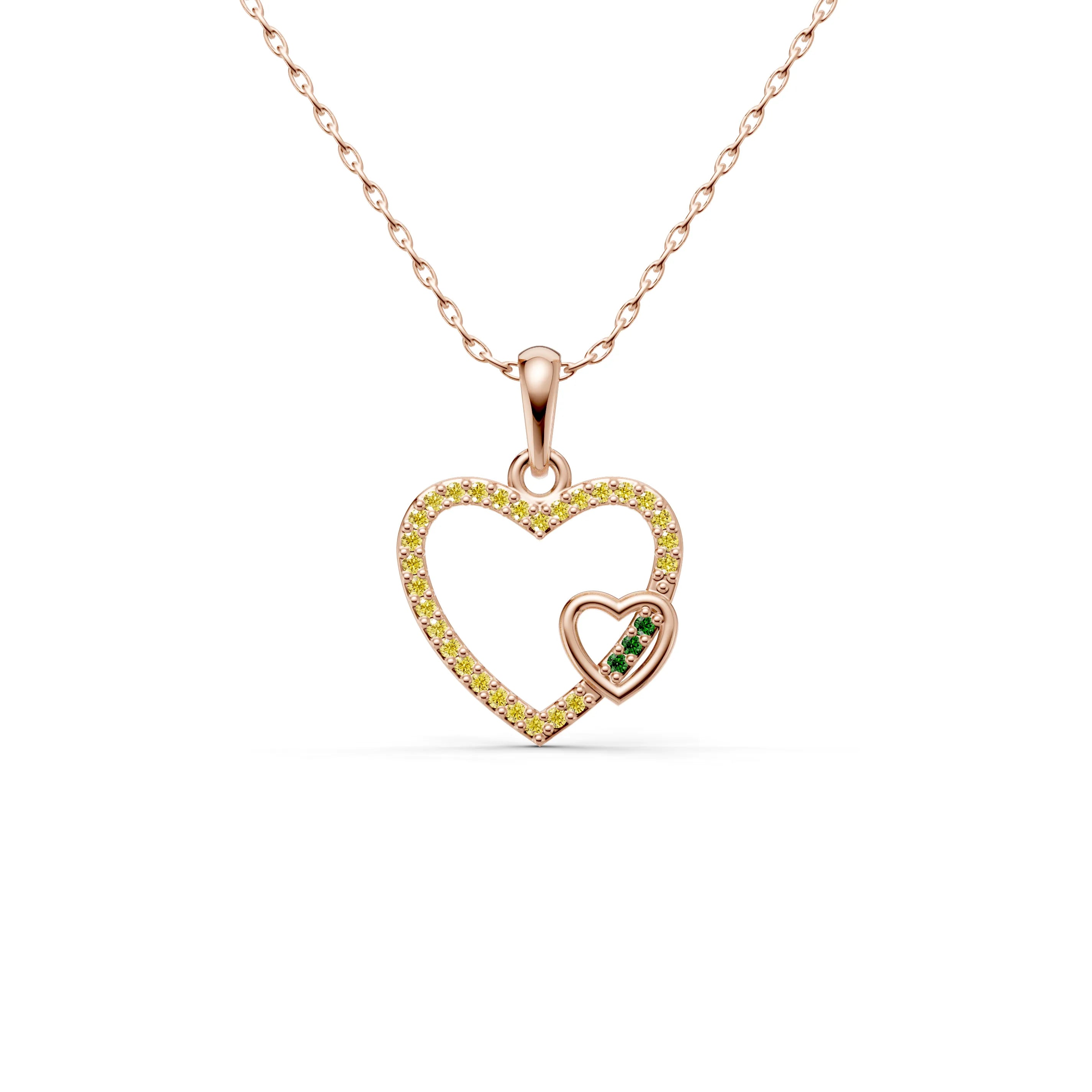The larger heart is outlined with a delicate array of gemstones, their brilliance creating a striking contrast against the smooth golden surface of the smaller heart nestled within. This design signifies the strength and protection of a shared love, while the sparkling outline represents the radiant joy that such a bond brings.