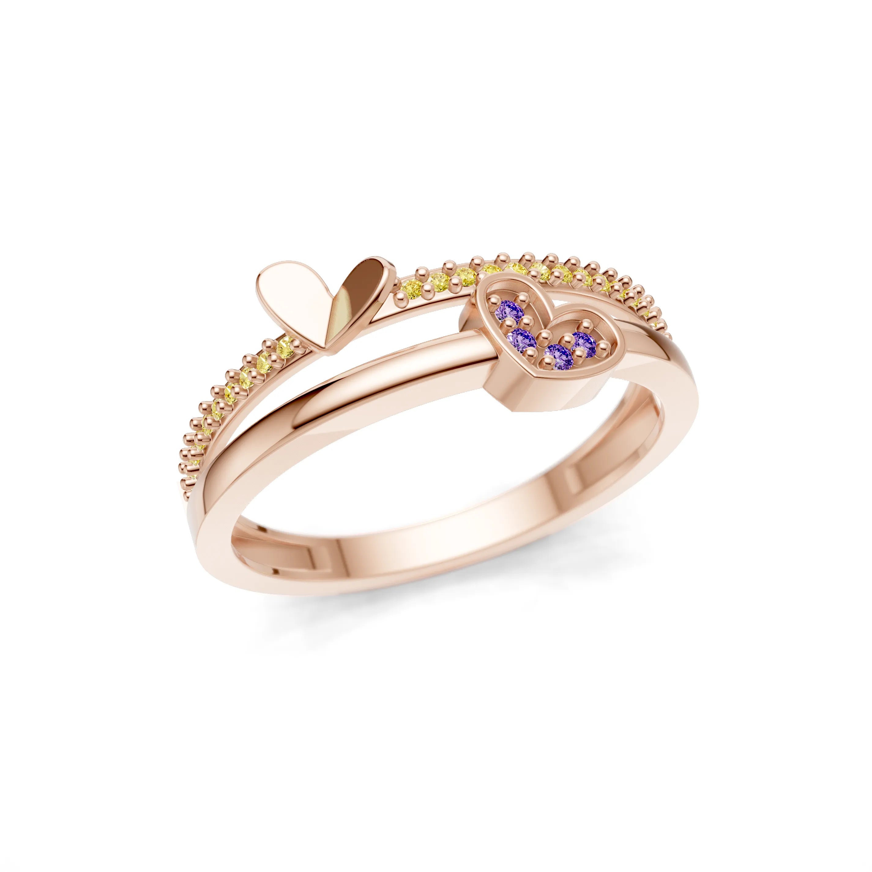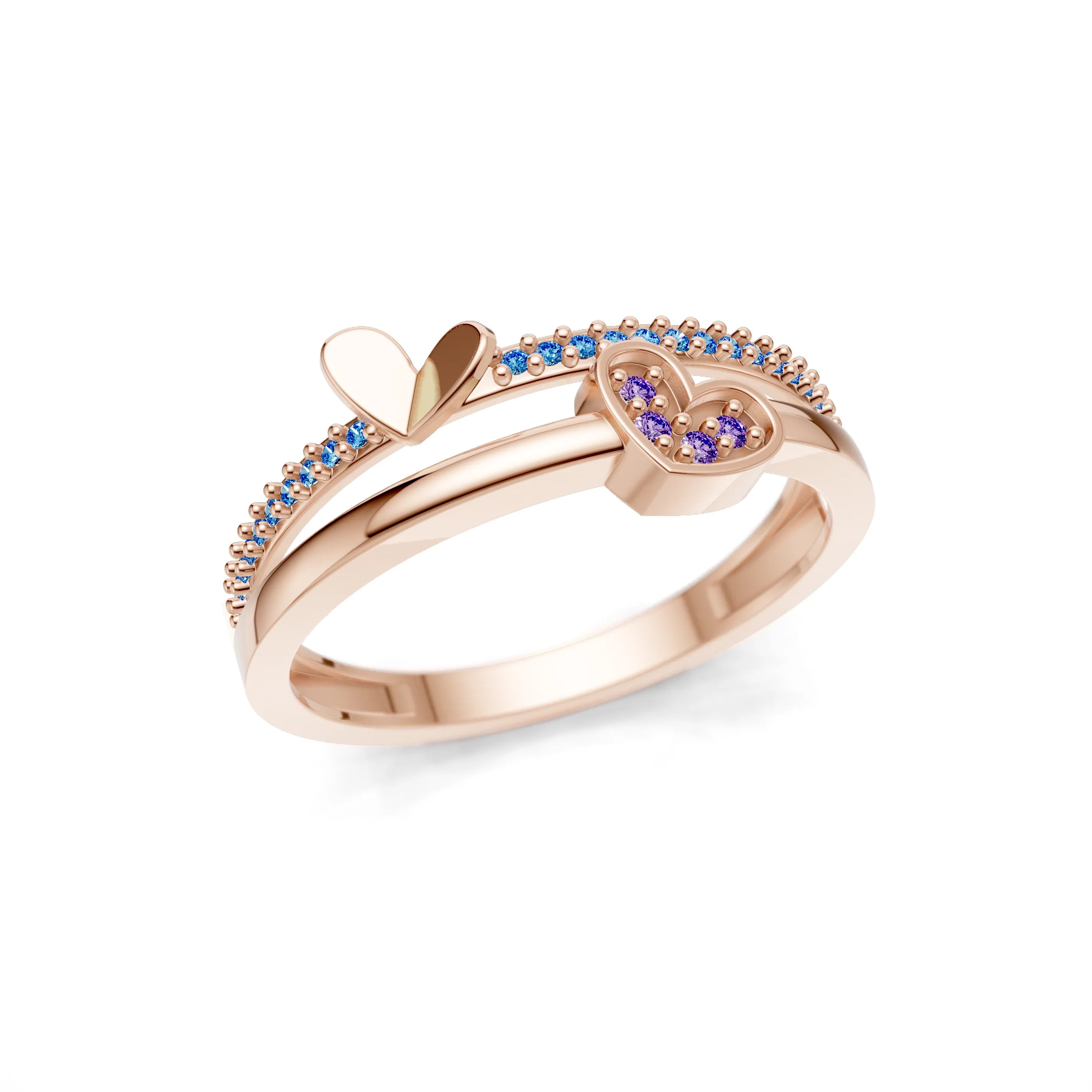 The "Love's Embrace Jewel Heart Ring" is a charming and romantic piece that combines whimsy and elegance. It features a sleek band with a line of petite gemstones leading to a duo of hearts, one polished and one encrusted with jewels, symbolising two hearts joined in love and harmony.