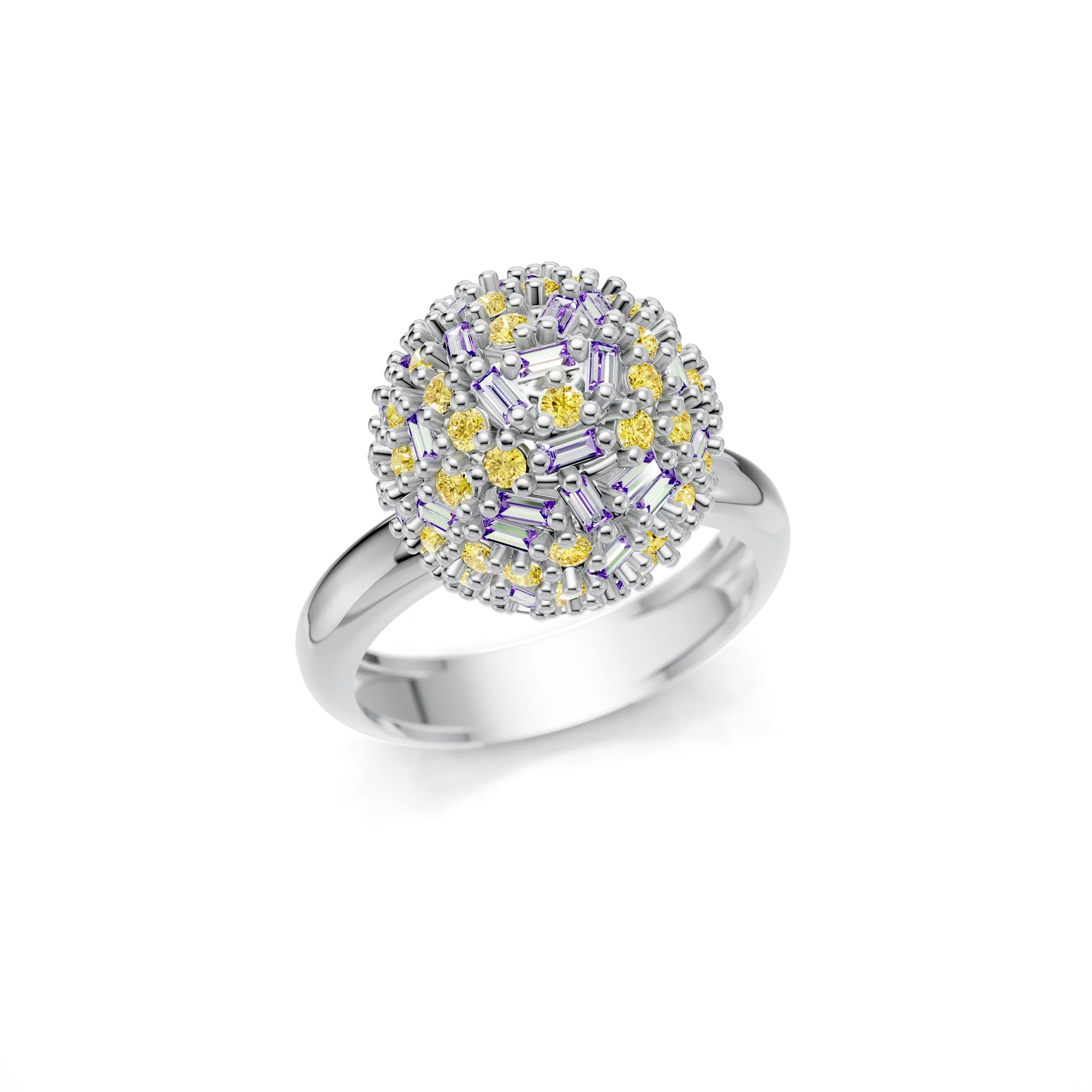 The craftsmanship displays a sunburst pattern that mimics the radiant energy of the sun, hence the name "Solaris," suggesting its inspiration from celestial bodies. It's a ring that provides the perfect finishing touch to an elegant evening ensemble, making it a must-have for those who appreciate fine, detailed jewelry.