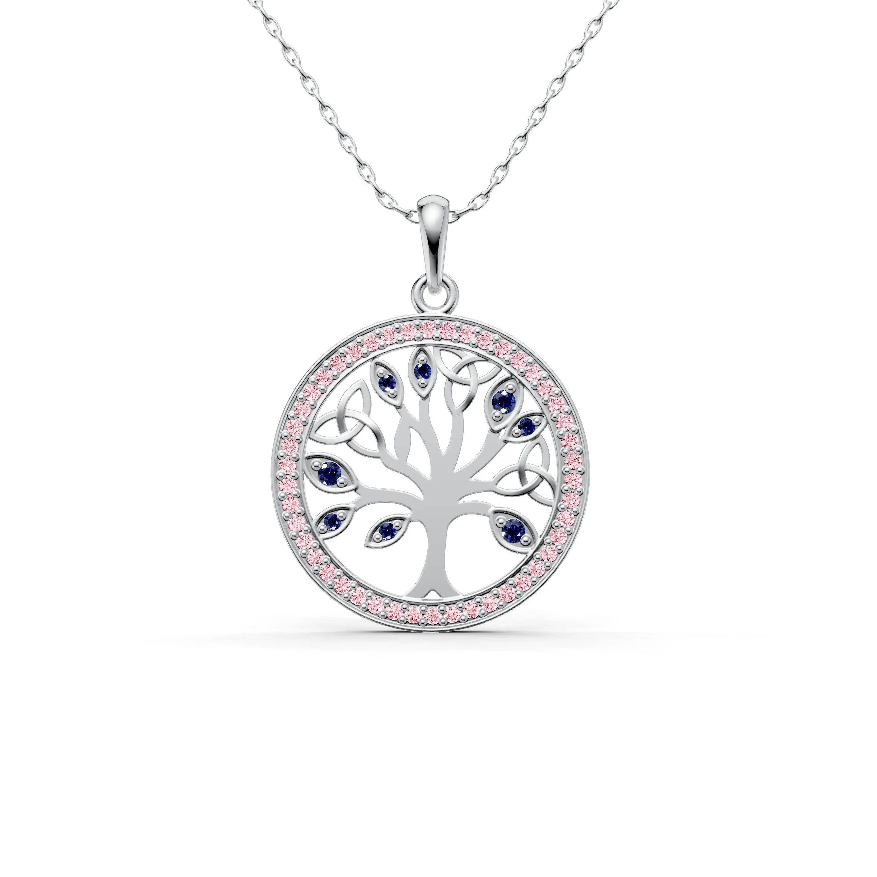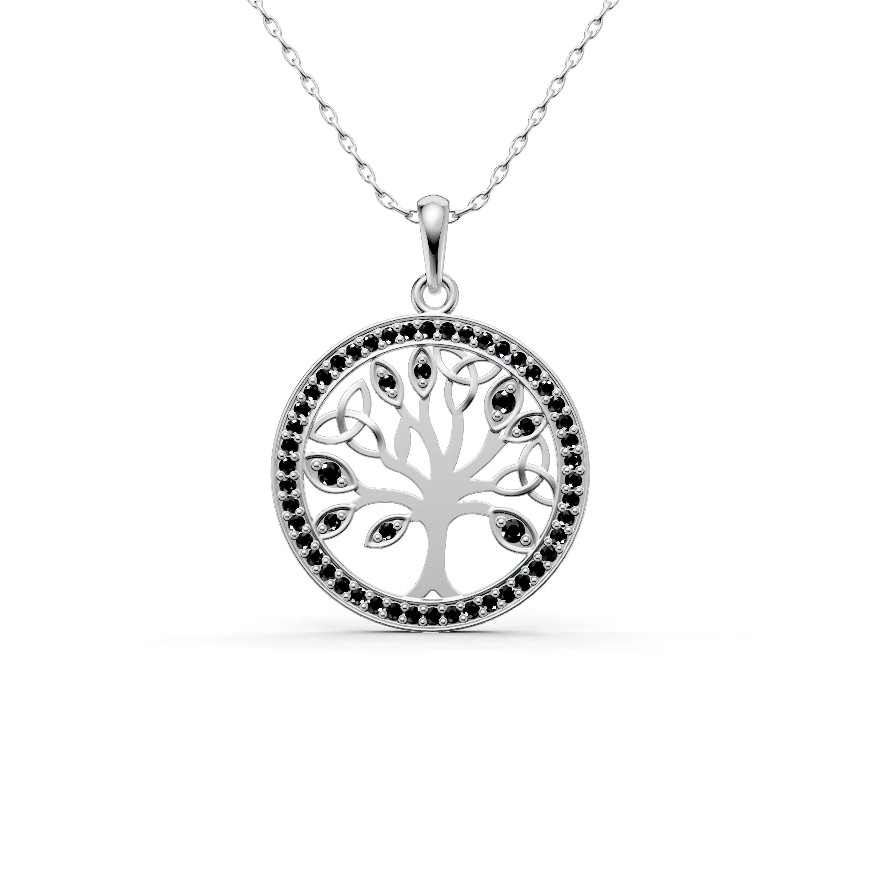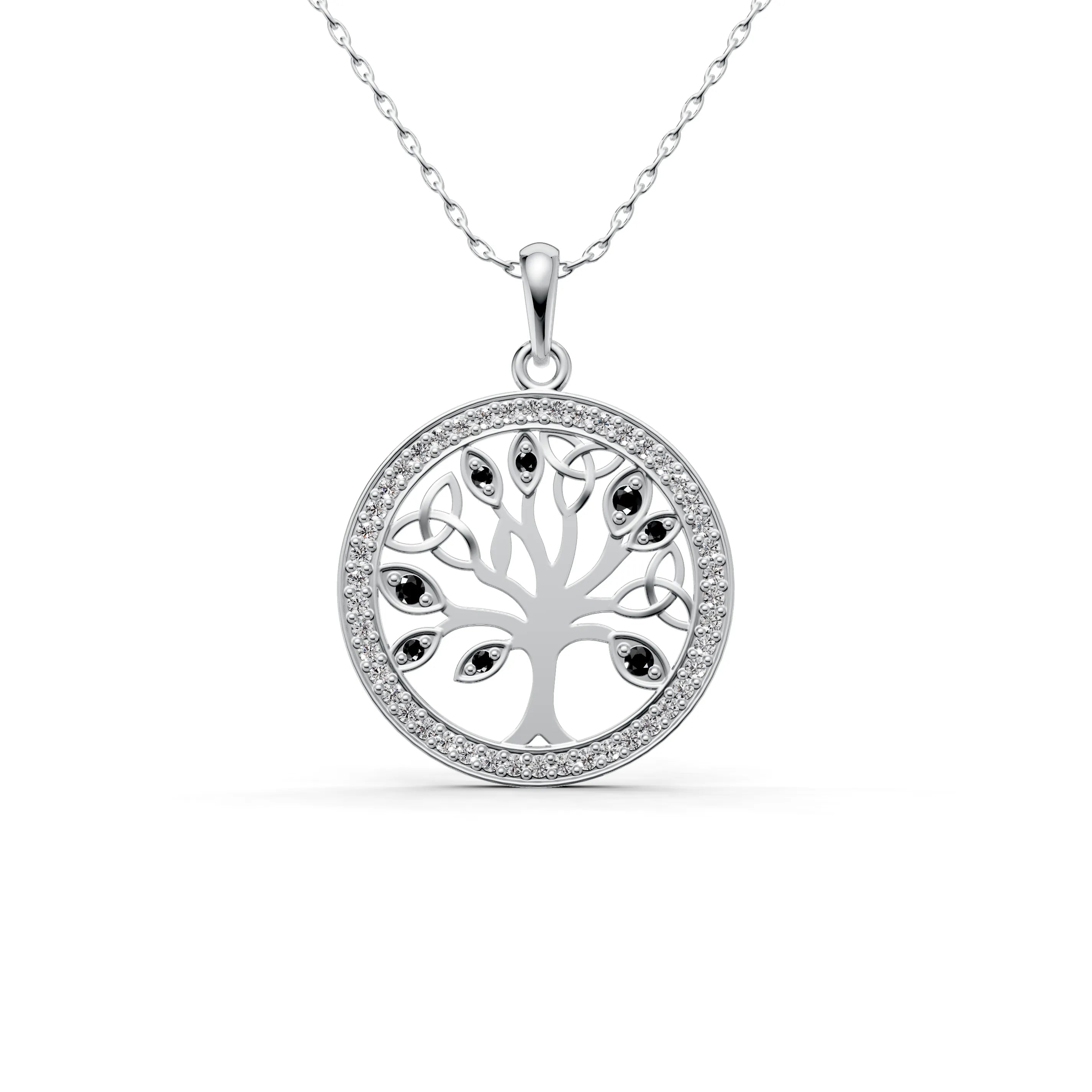 The filigree design within the tree is finely crafted, creating an intricate pattern that allows this piece to be both robust and delicately elegant. Surrounding the tree is a halo of gemstones, each catching the light and adding a celestial glow to the pendant, as if to highlight the sacredness of life.