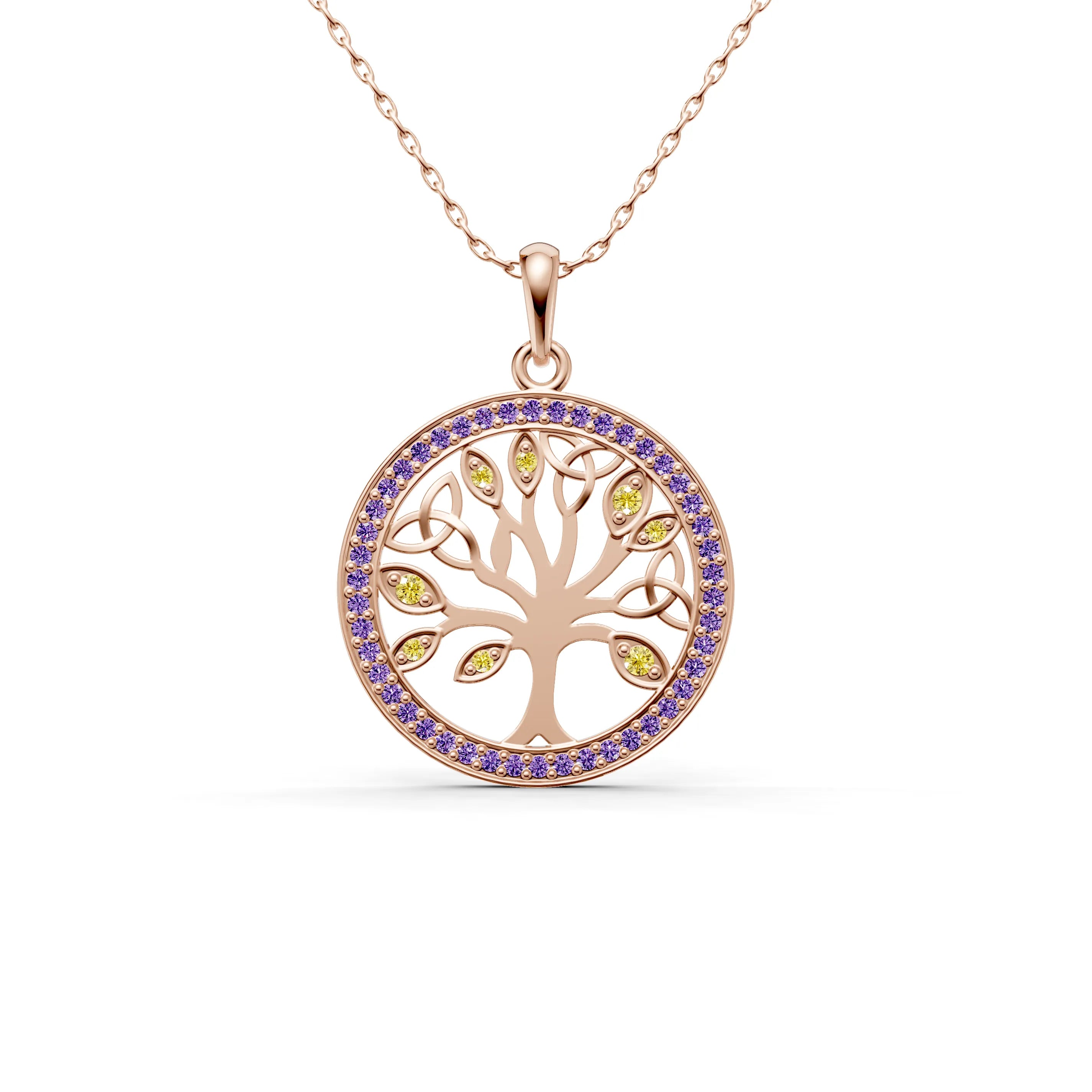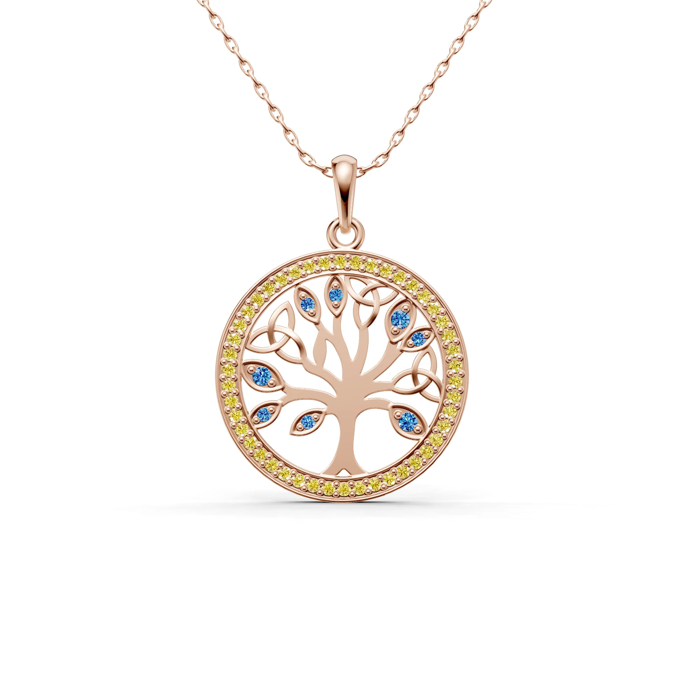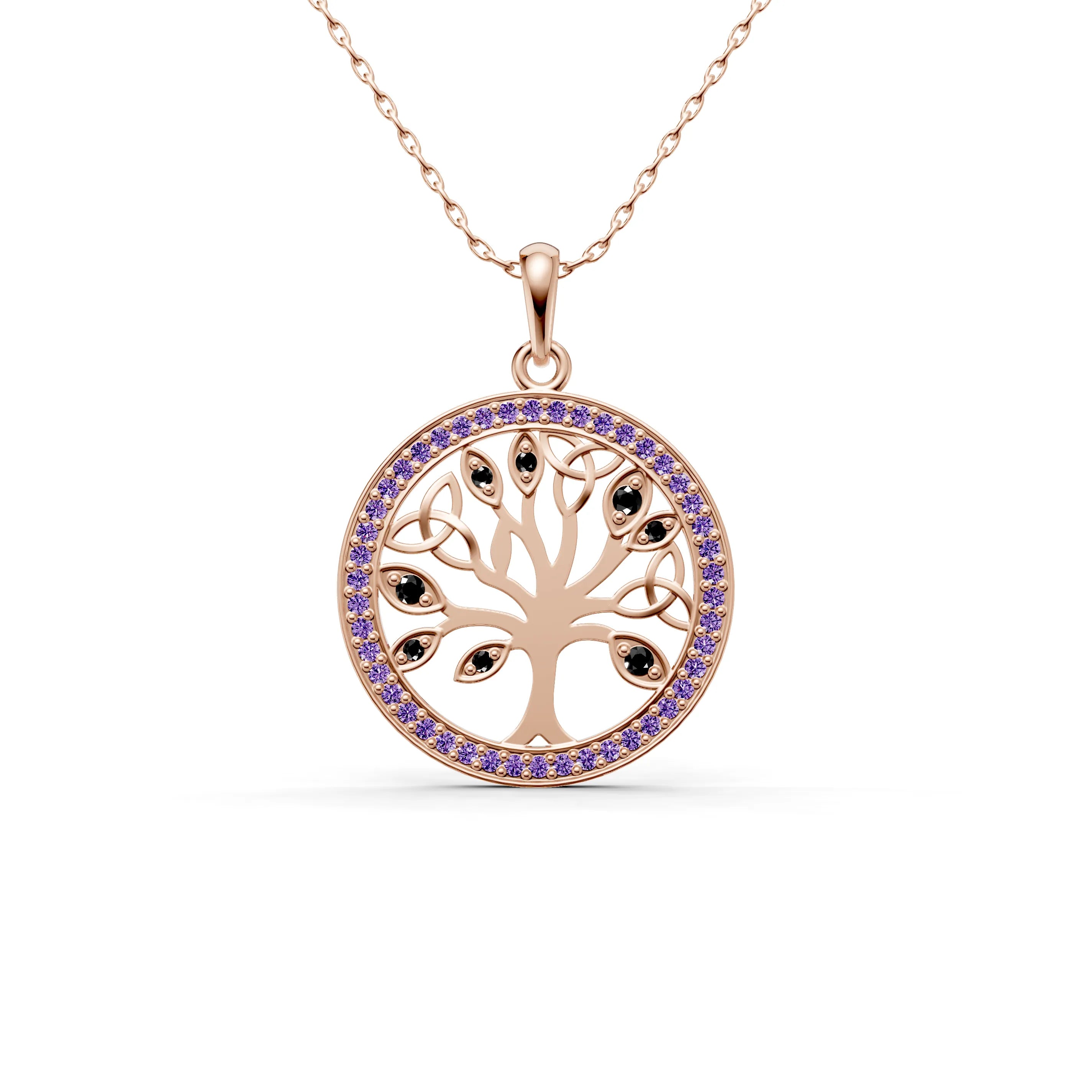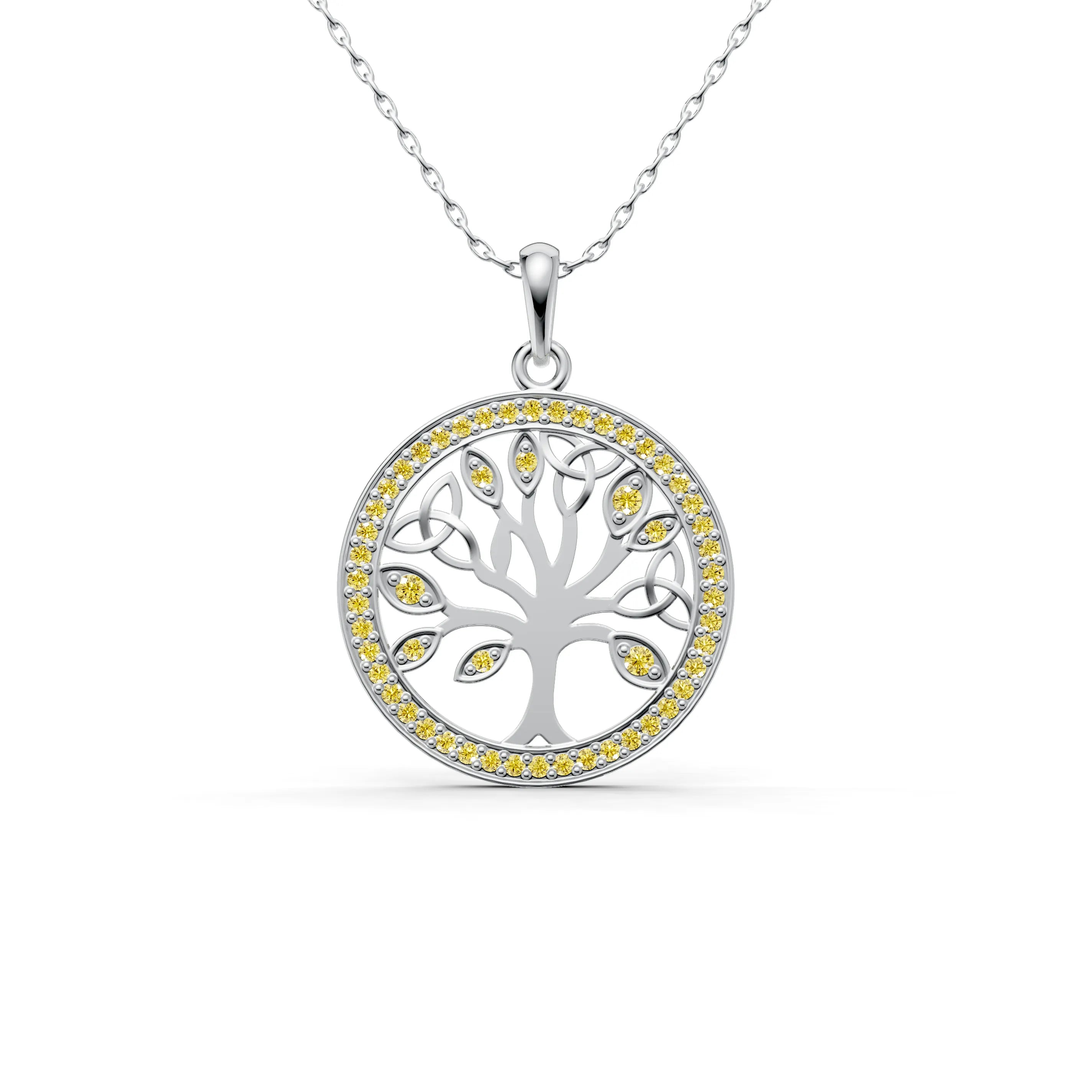 The filigree design within the tree is finely crafted, creating an intricate pattern that allows this piece to be both robust and delicately elegant. Surrounding the tree is a halo of gemstones, each catching the light and adding a celestial glow to the pendant, as if to highlight the sacredness of life.